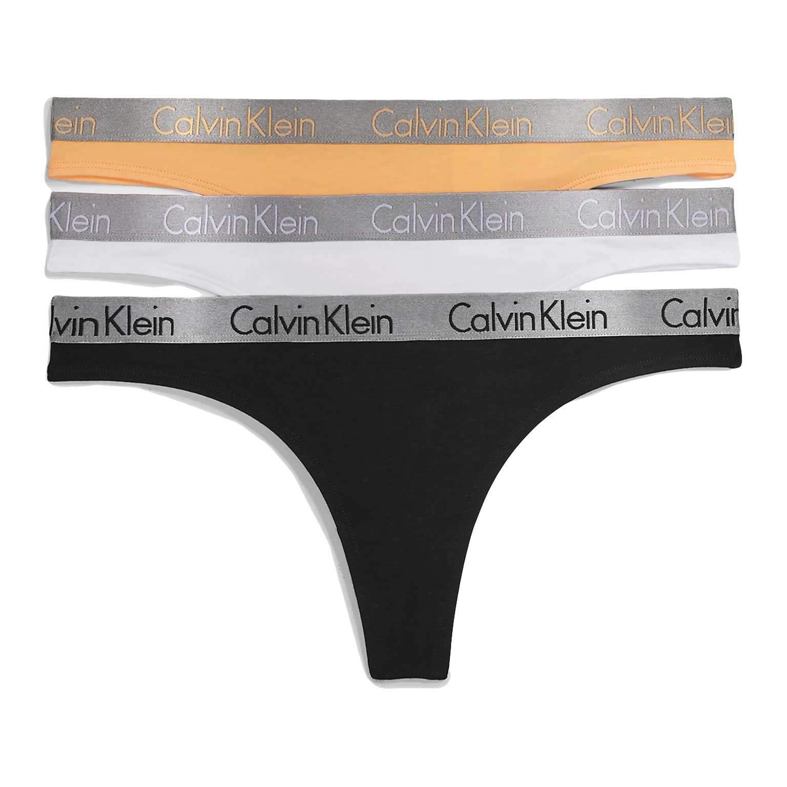 Drei einfarbige Damen-Strings mit einem kontrastierenden Taillenbund von Calvin Klein in einer Vorteilspackung, hergestellt aus weicher Stretch-Baumwolle, die sich angenehm auf der Haut anfühlt. Der Taillenbund trägt das Calvin Klein-Logo. Die Multipacks sind in zwei Farbkombinationen erhältlich.