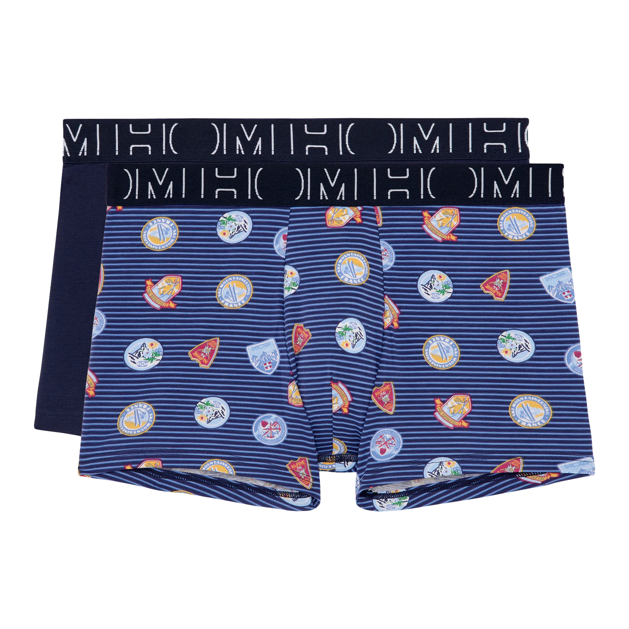 Die 2p Boxershorts - Alf ist ein preiswertes 2er-Pack. Die Boxershorts sind Teil der HOM BOXERLINES Serie und bestehen aus gekämmter Stretch-Baumwolle. Diese alltagstauglichen Herren-Boxershorts verfügen über einen Beutel auf der Vorderseite für zusätzlichen Halt und Komfort. Die BOXERLINES-Serie besteht aus einer leichteren Baumwollqualität als die Singlepacks. Alf bietet eine Boxershorts in schlichtem Marineblau und eine Boxershorts mit einem Aufdruck mit Wintersport-Emblemen.