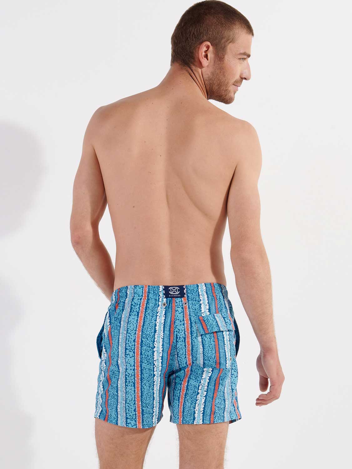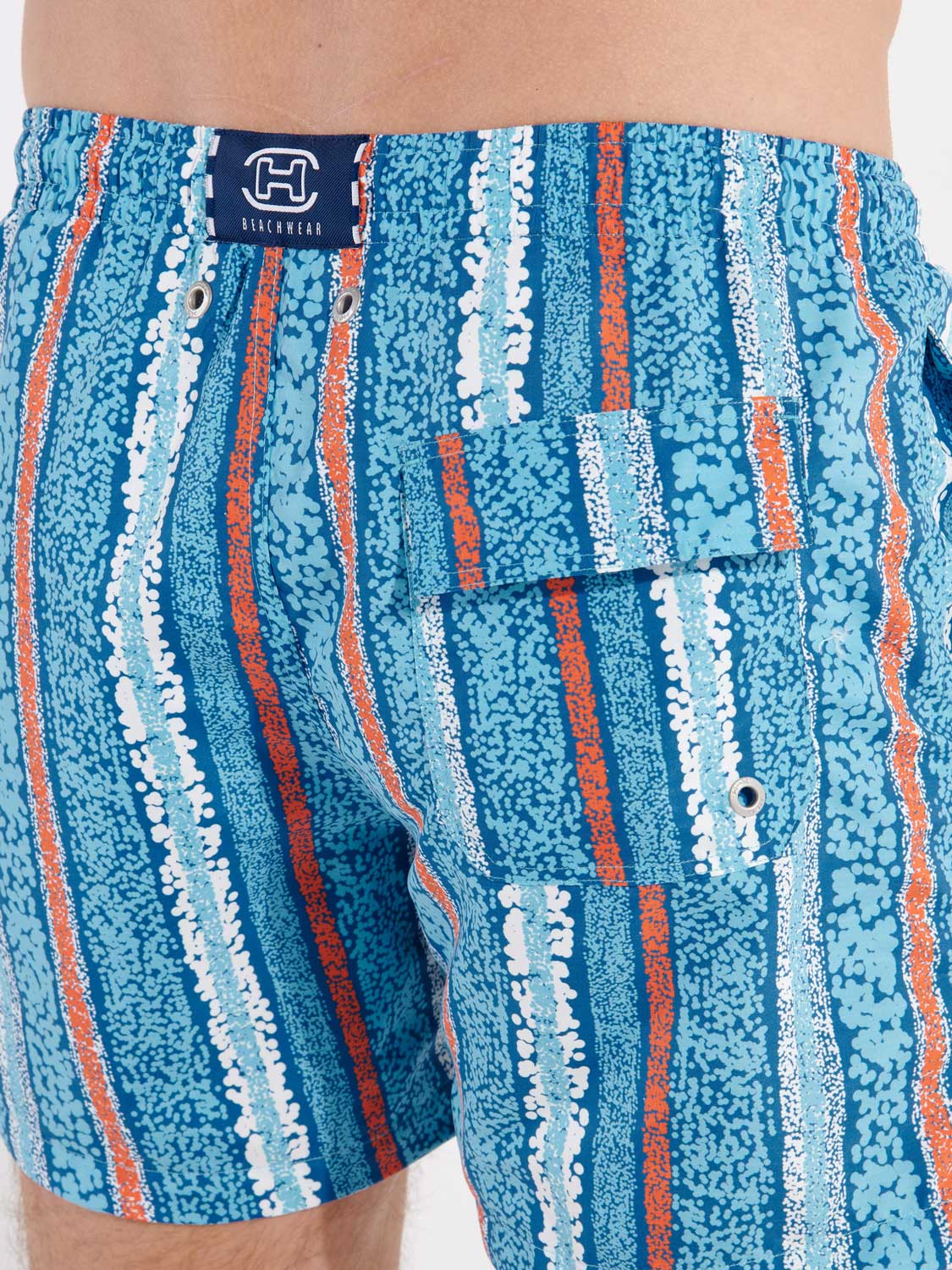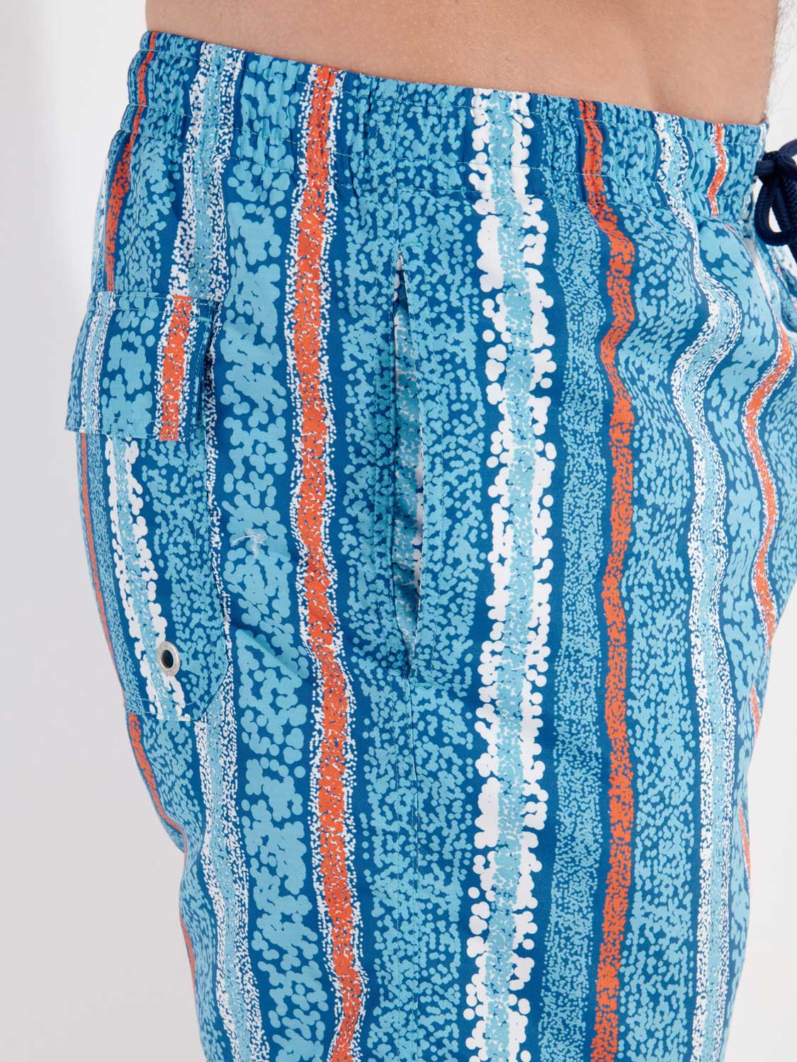 Die Harrisson - Beach Boxer hat einen modernen Druck mit vertikalen Linien in Blau, Weiß und Orange. Zusammen mit den Seitentaschen links und rechts und der Gesäßtasche hat die Harrison Beach Boxer einen modernen Look. Die Badeshorts verfügen über Innenshorts für zusätzlichen Komfort und Halt. Mit dem Kordelzug im Bund können Sie die Harrison - Beach Boxer auf die perfekte Größe einstellen, so dass Sie mit Zuversicht ein erfrischendes Bad nehmen können. Der Stoff besteht aus Polyester, wodurch die Beach Boxer schnell trocknet. Ideal für den Strand oder wenn Sie danach auf die Terrasse gehen wollen.