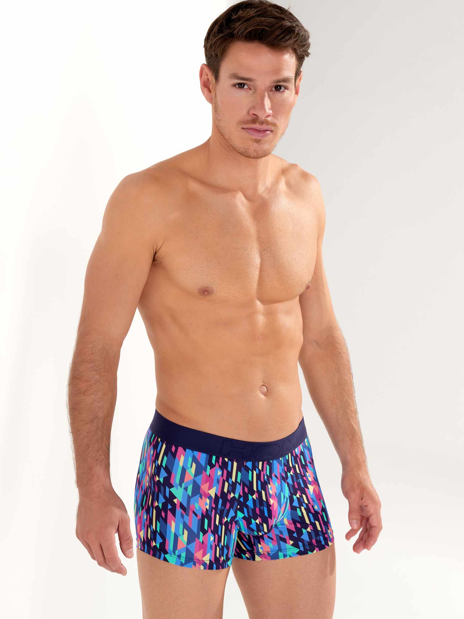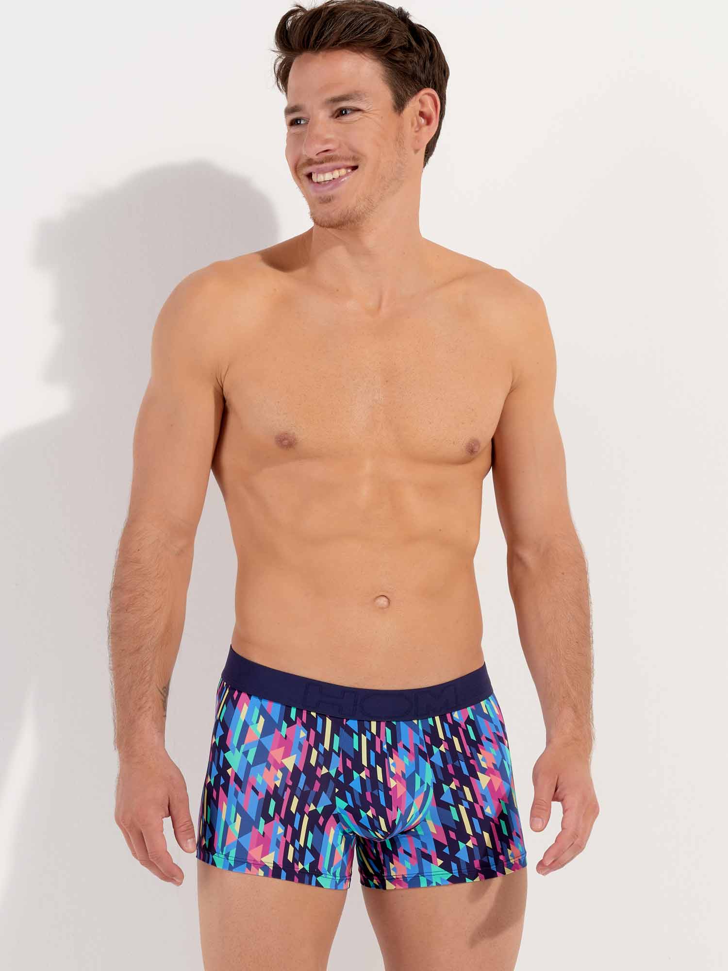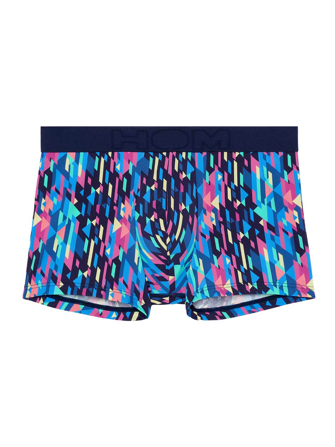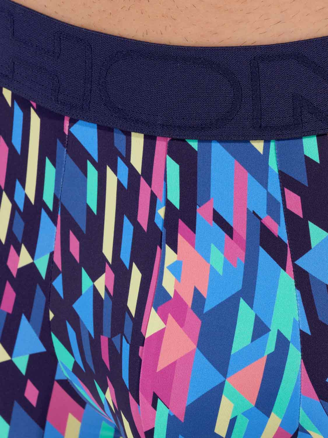 Die Duke - Boxer Briefs bestehen aus einem bequemen Mikrofaserstoff. Diese Herren-Boxershorts verfügen über ein Muster mit einem geometrischen Design aus mehrfarbigen fragmentierten Formen auf einem marineblauen Hintergrund. Duke hat einen elastischen Bund aus Baumwolle mit dem HOM-Logo in Ton-in-Ton.