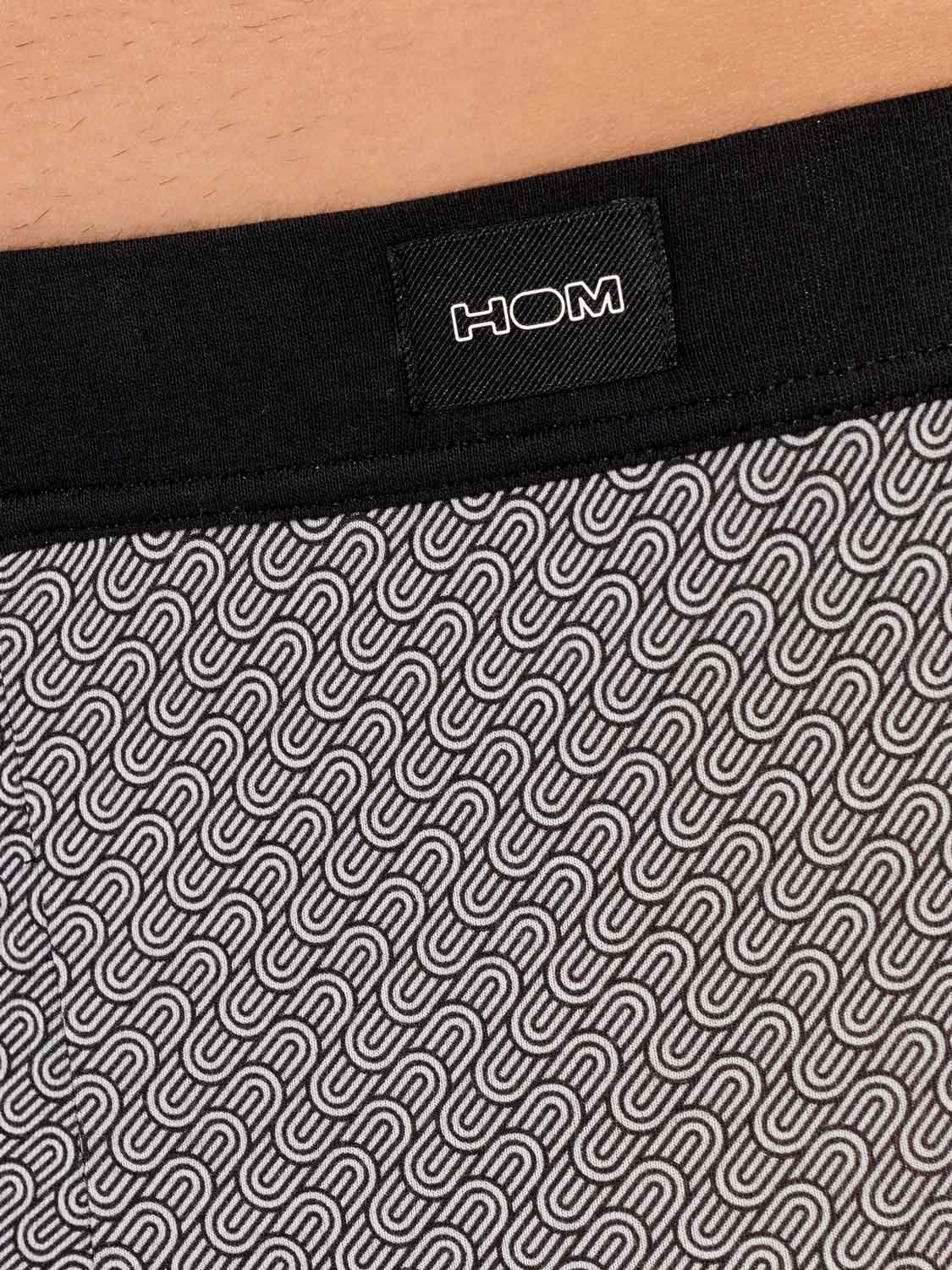 Die Herbie - Comfort Boxer Briefs bestehen aus Baumwoll-Modal. Diese Herren-Boxershorts haben einen Print mit diagonalen geometrischen Mustern und Illustrationen von schwarzen und weißen Wellen. Die Herbie ist mit einem Komfortbund ausgestattet, bei dem der Stoff über das elastische Band nach innen umgeschlagen ist, um zusätzlichen Komfort zu bieten. Auf der linken Vorderseite des Komfortbundes ist ein kleines HOM-Label angebracht.
