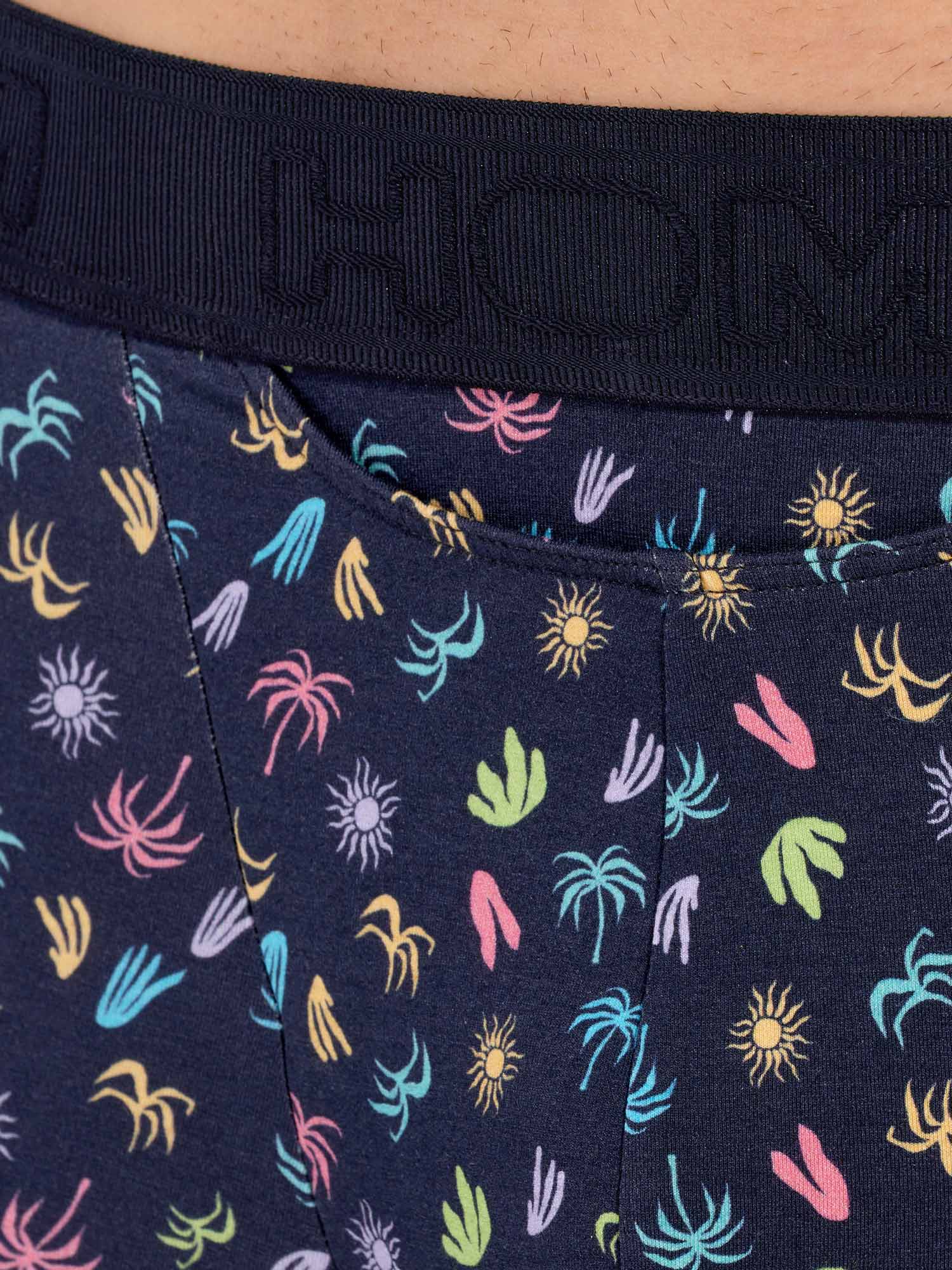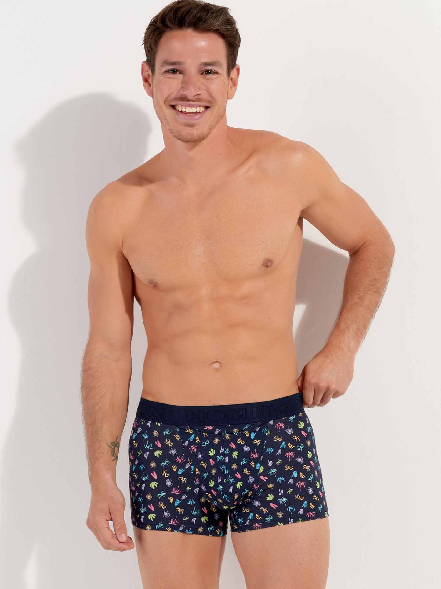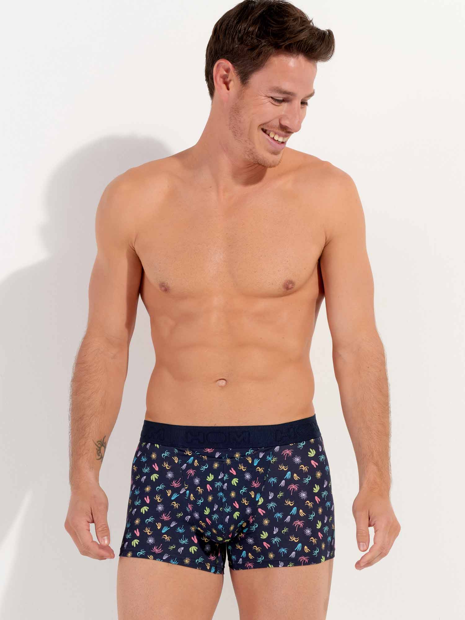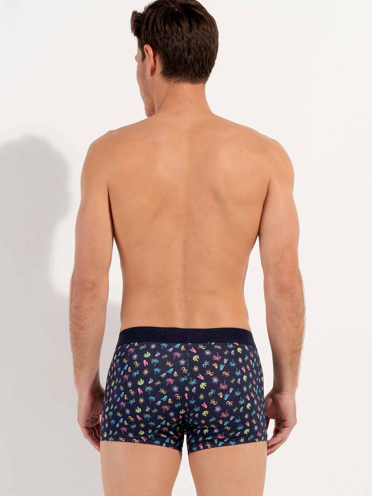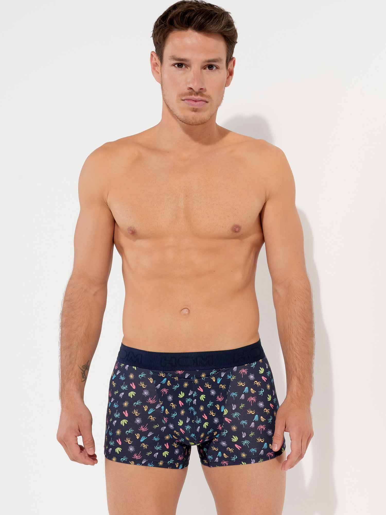 Die California - HO1 Boxer Briefs bestehen aus Baumwoll-Modal und verfügen über die 'horizontale Öffnung', das charakteristische Eingriffdesign von HOM für zusätzlichen Komfort. Diese Herren-Boxershorts haben einen exotischen, mehrfarbigen Mikroprint, der die Weichheit eines kalifornischen Urlaubs heraufbeschwört, mit kleinen Palmen und Sonnen in leuchtenden Farben, inspiriert von der Coachella-Atmosphäre. Die California ist mit einem elastischen, gerippten Bund ausgestattet, in den das HOM-Logo Ton-in-Ton eingestickt ist.