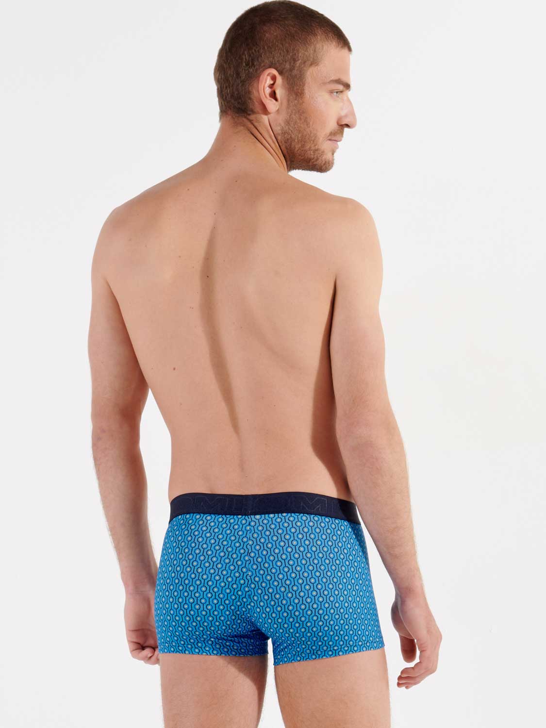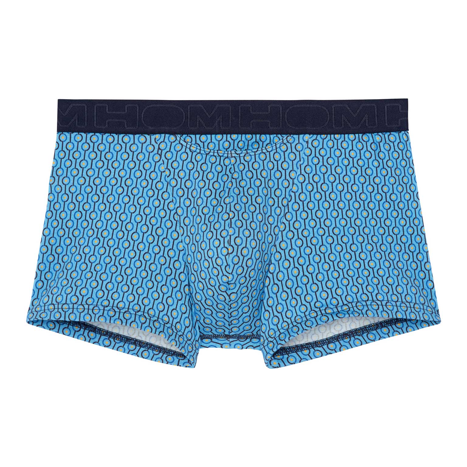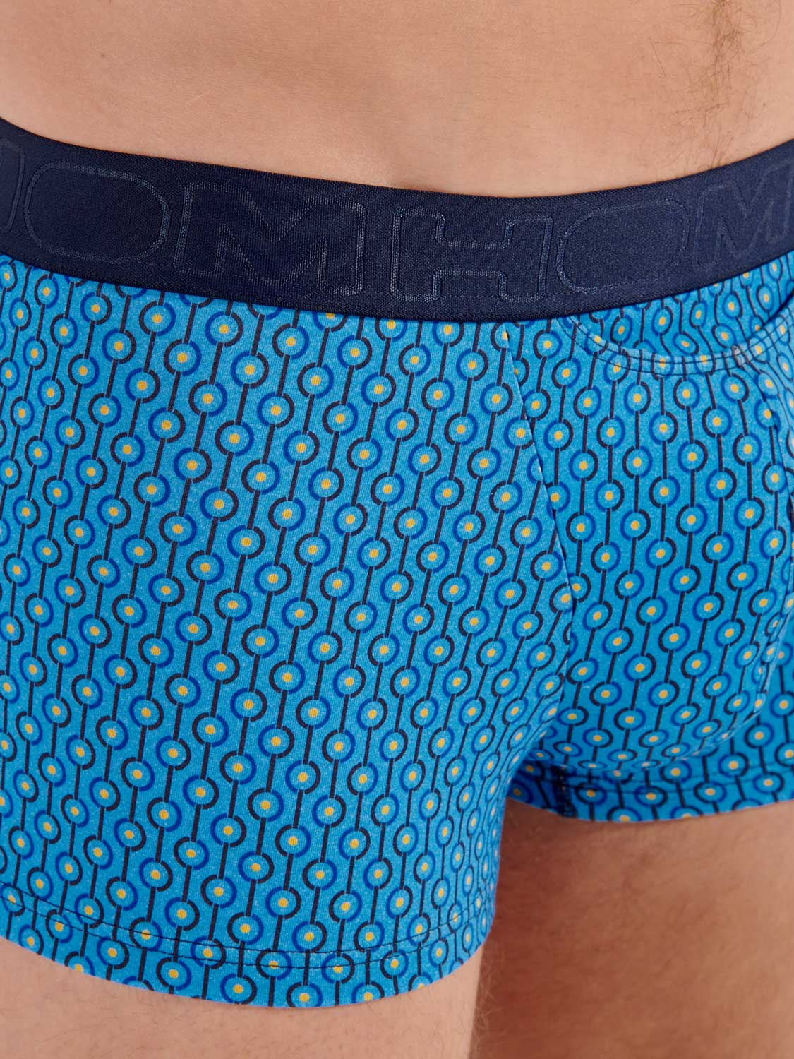 Der Cameron - HO1 Boxerslip ist aus Baumwollmodal gefertigt und verfügt über die "horizontale Öffnung", den speziellen Schlitz für zusätzlichen Komfort, für den HOM bekannt ist. Dieser Herren-Boxerslip hat einen schönen abstrakten Druck im 70er-Jahre-Look, der in kontrastierendem Hellblau auf dunklem, marineblauem Hintergrund ausgeführt ist. Der Cameron hat einen elastischen Bund mit dem HOM-Logo.