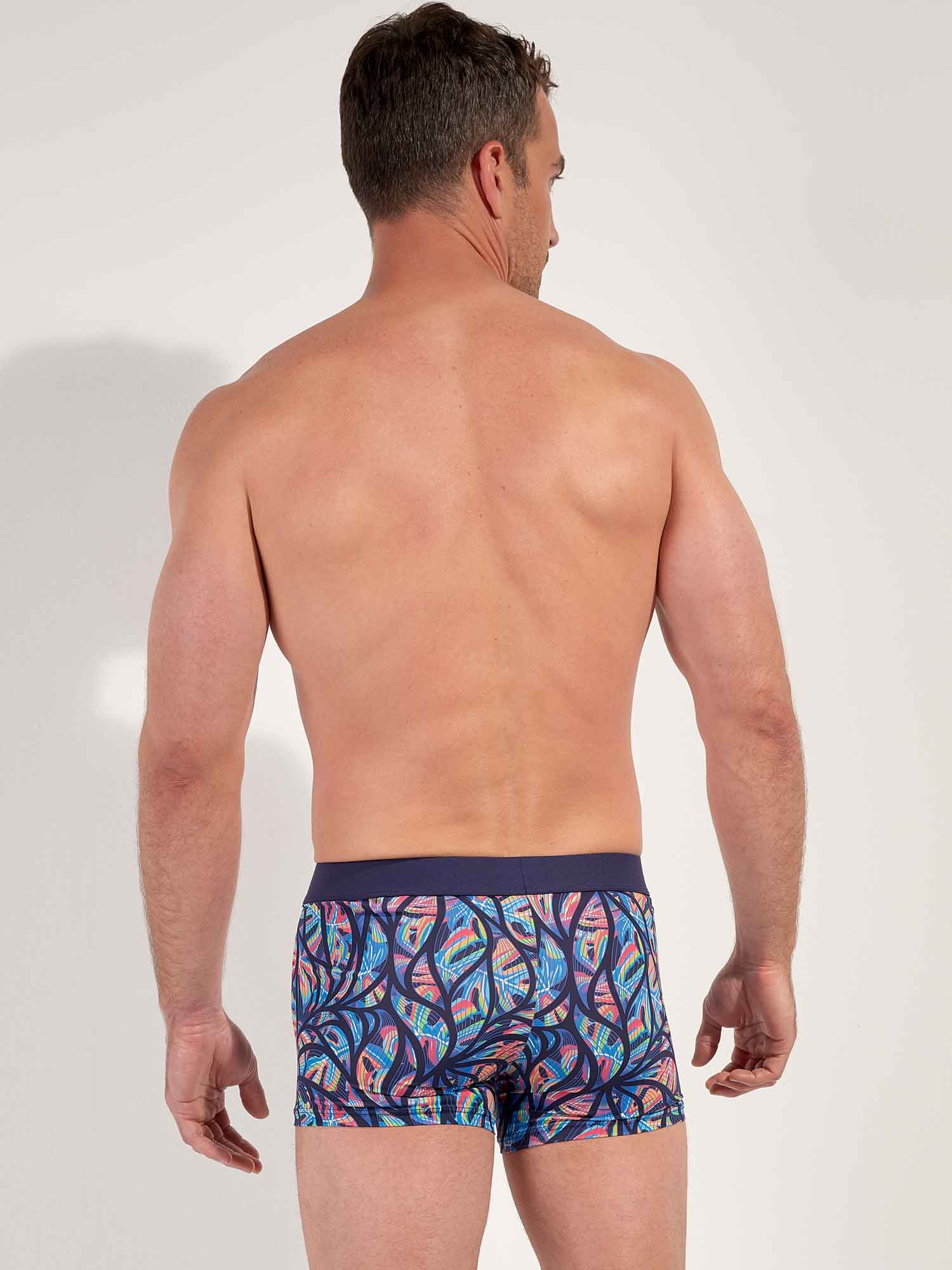 Die HOM Indian Creek Boxer Briefs verbinden einen starken Tropen Look mit Premium Komfort aus Mikrofaser. Mehrfarbige Blätter auf tiefem Navy erzeugen einen beeindruckenden, üppigen Jungle Effekt, während der nahtlose HOM Bund den Stil clean und modern hält. Der diskrete innenliegende Frontgummi sorgt für natürlichen Halt und einen stabilen Sitz, und der transparente Beinabschluss wirkt leicht und raffiniert. Das abtrennbare Pflegeetikett beugt Reizungen vor und sorgt den ganzen Tag für ein angenehmes Tragegefühl.