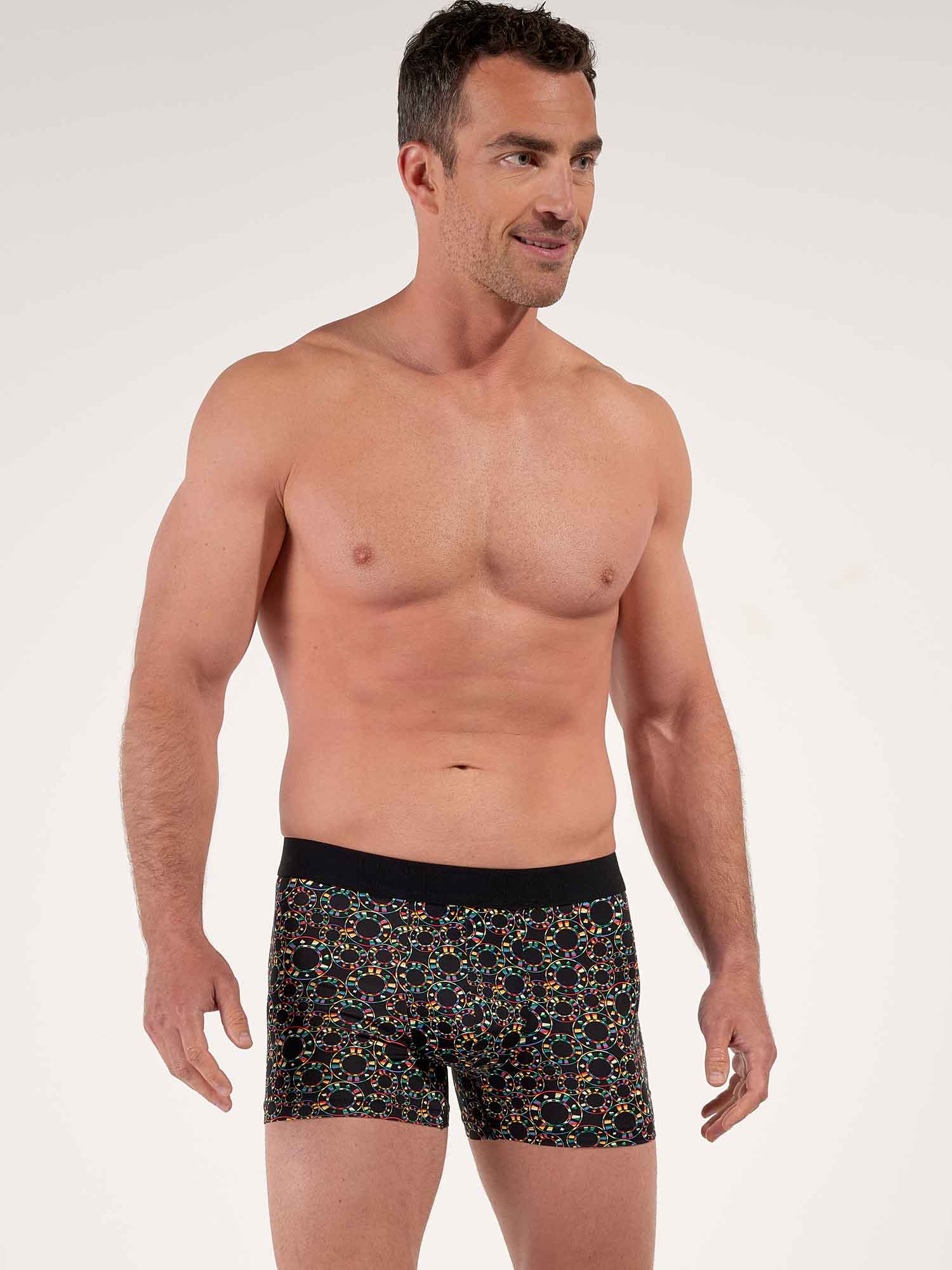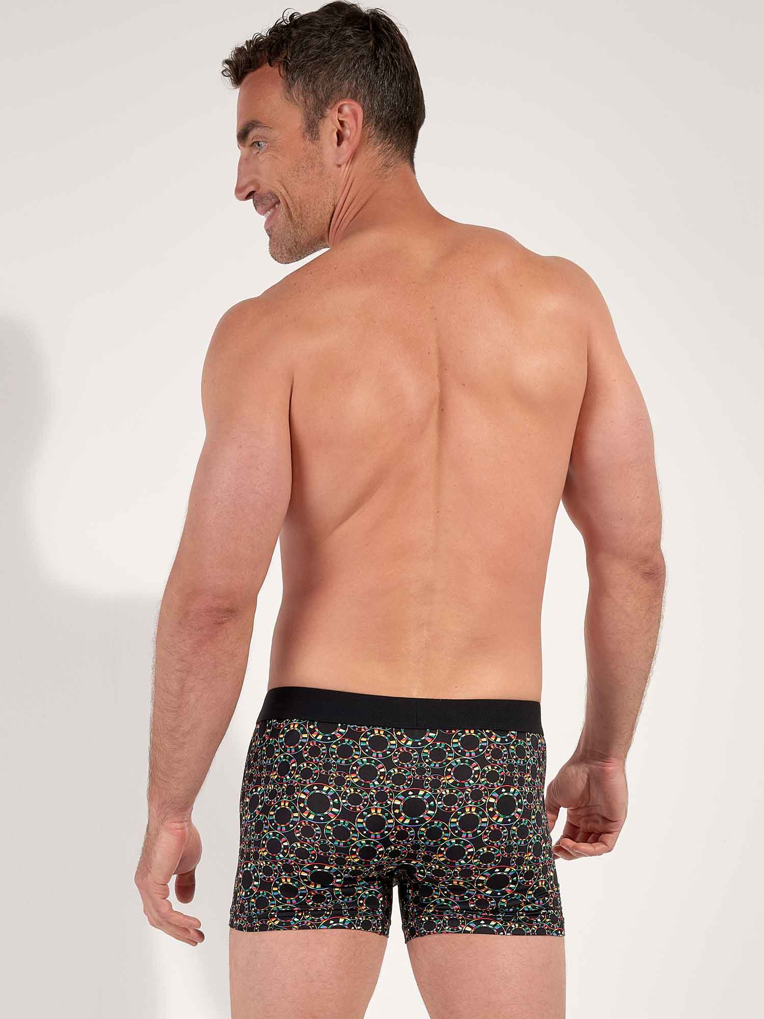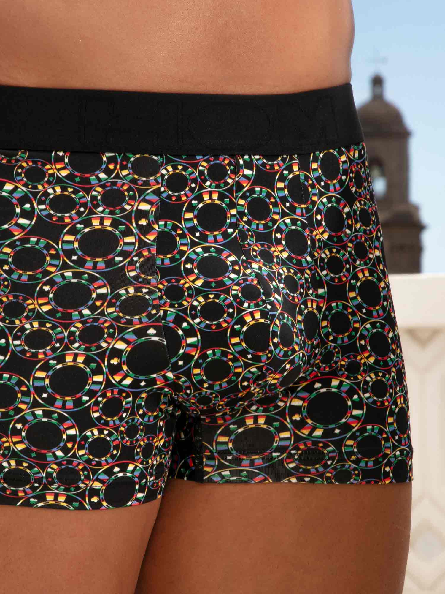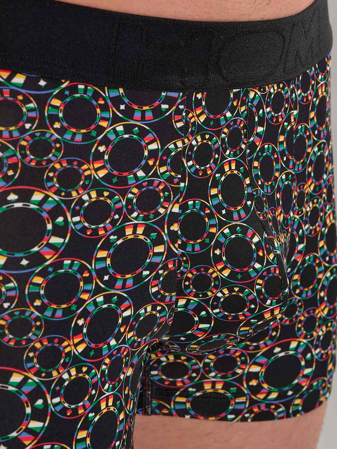 Die Red Rock Boxer Briefs tauchen in die gedämpfte, elektrisierende Welt der Casinos ein. Der ausdrucksstarke Chip Print setzt sich auf tiefem Schwarz perfekt ab und kombiniert leuchtendes Rot und Grün mit klarem Weiß und dezenten goldenen Akzenten, für einen selbstbewussten, grafischen Look. Weiches, elastisches Microfiber schmiegt sich leicht an den Körper und fühlt sich wie eine zweite Haut an. Der nahtlose Komfortbund sorgt für stabilen Halt ohne Druck, während der innenliegende Frontgummi im Beutelbereich diskrete, gezielte Unterstützung bietet. Ein raffinierter Beinabschluss hilft, ein Hochrutschen zu verhindern, auch im Sitzen, und das abnehmbare Etikett sorgt den ganzen Tag für reibungsfreien Komfort.