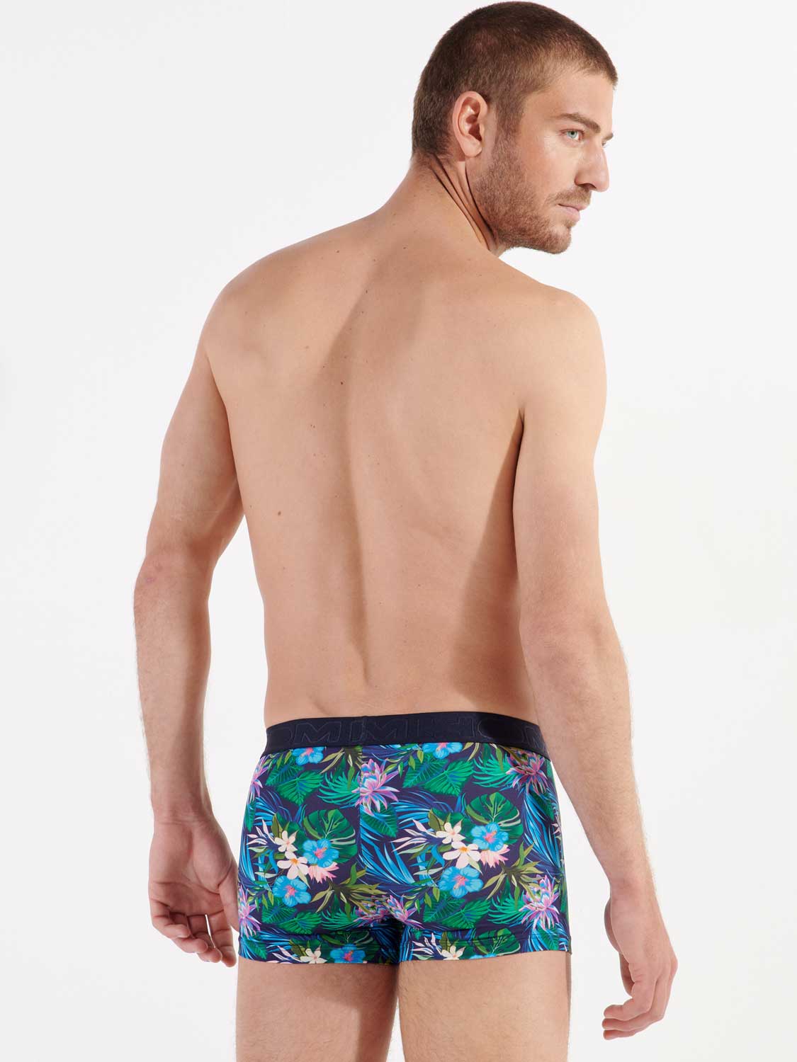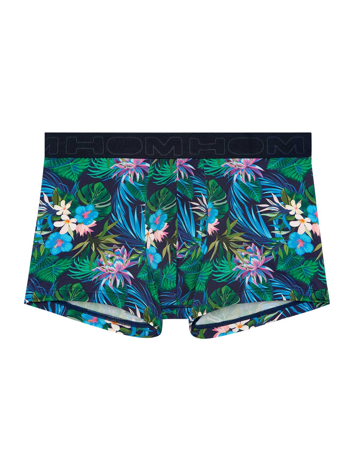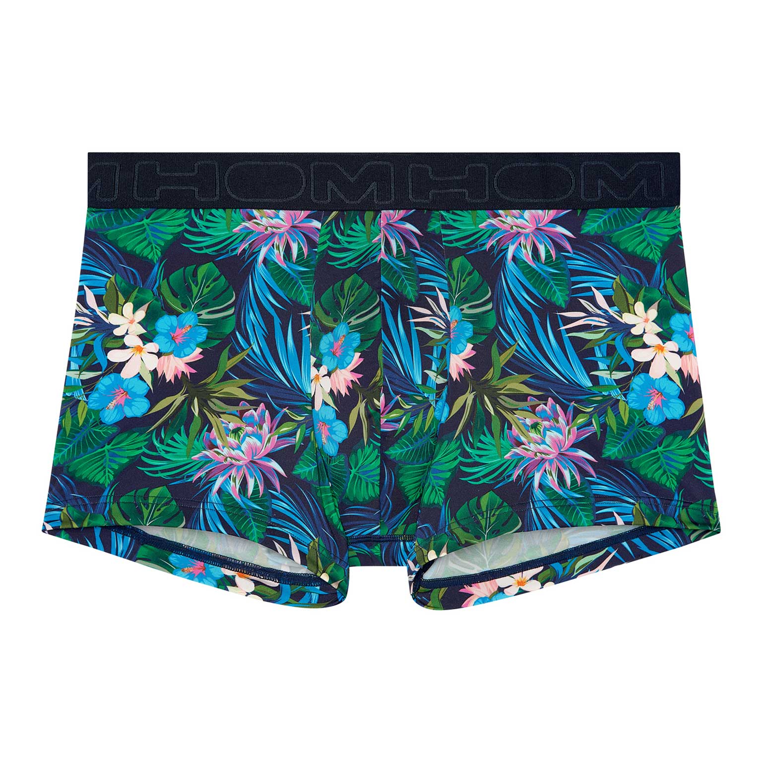 Der Yoni - Boxerslip ist aus einer bequemen Mikrofaser gefertigt. Die Herren Boxershorts haben einen exotischen Blumenprint in den Farben Türkis, Fuchsia und Grün auf dunkelblauem Grund. Der Yoni hat einen elastischen Baumwollbund, der mit dem HOM-Logo in Ton-in-Ton verziert ist.