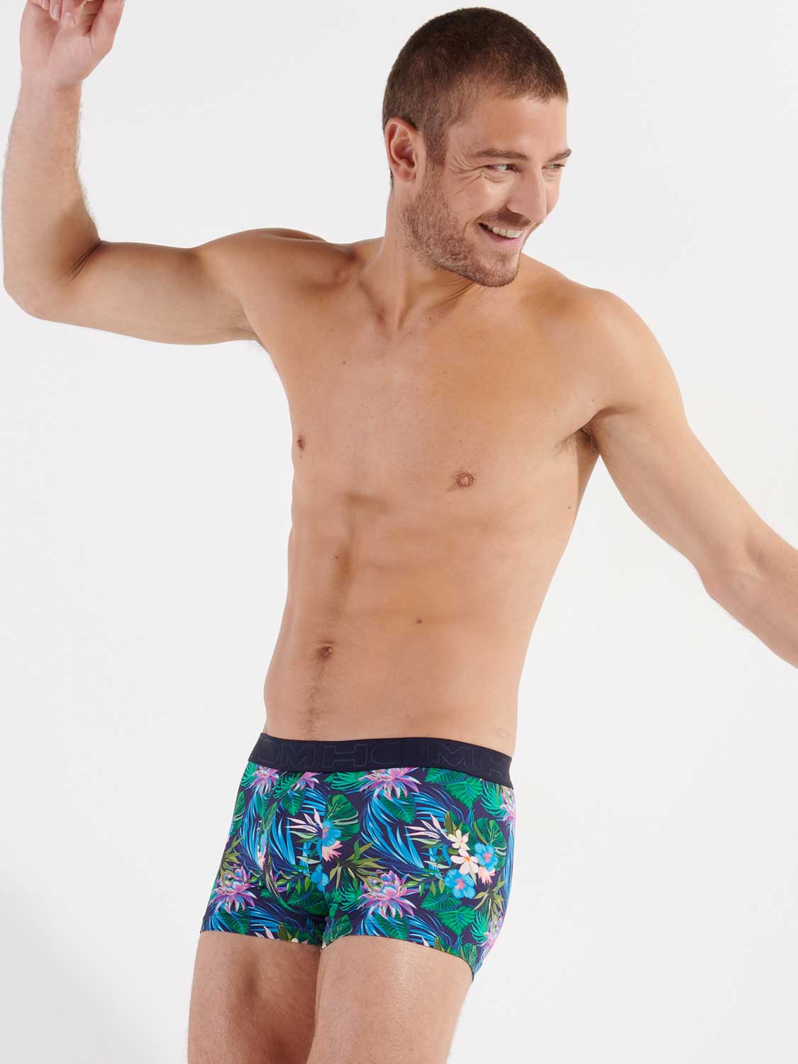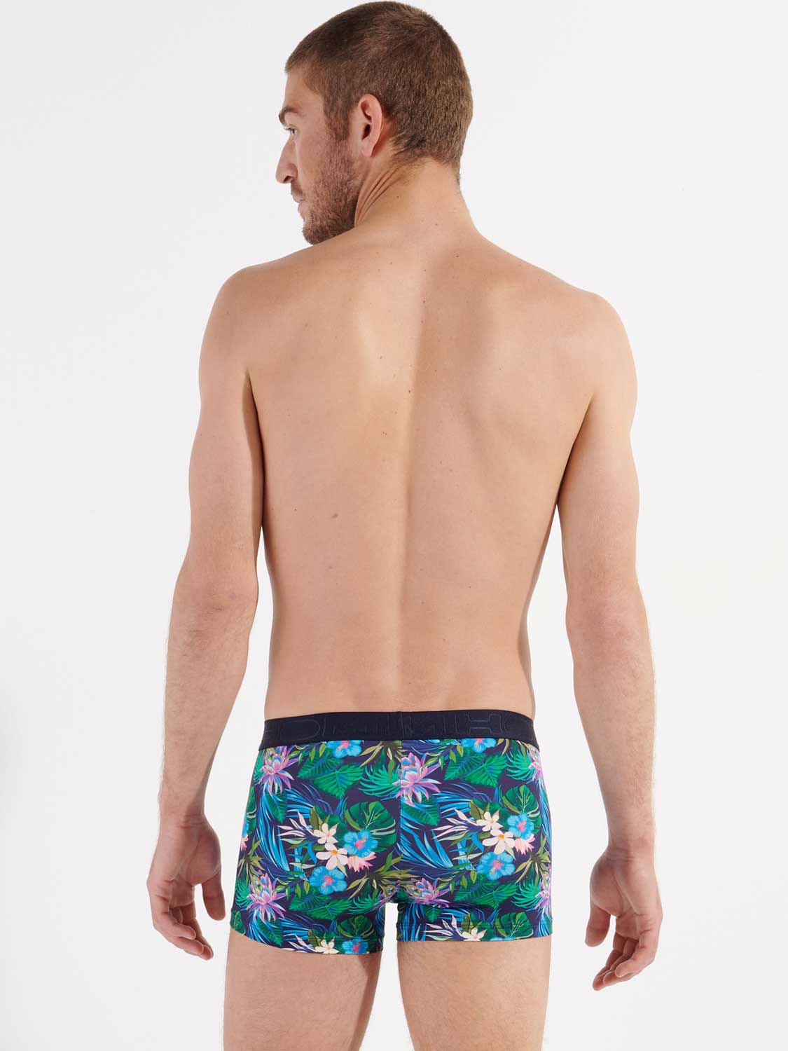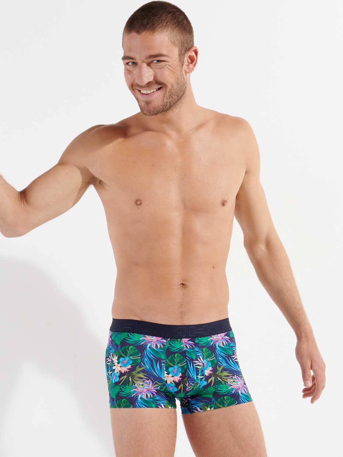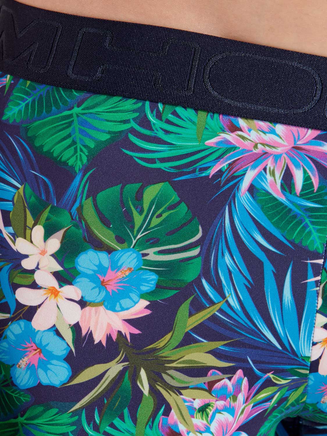Der Yoni - Boxerslip ist aus einer bequemen Mikrofaser gefertigt. Die Herren Boxershorts haben einen exotischen Blumenprint in den Farben Türkis, Fuchsia und Grün auf dunkelblauem Grund. Der Yoni hat einen elastischen Baumwollbund, der mit dem HOM-Logo in Ton-in-Ton verziert ist.