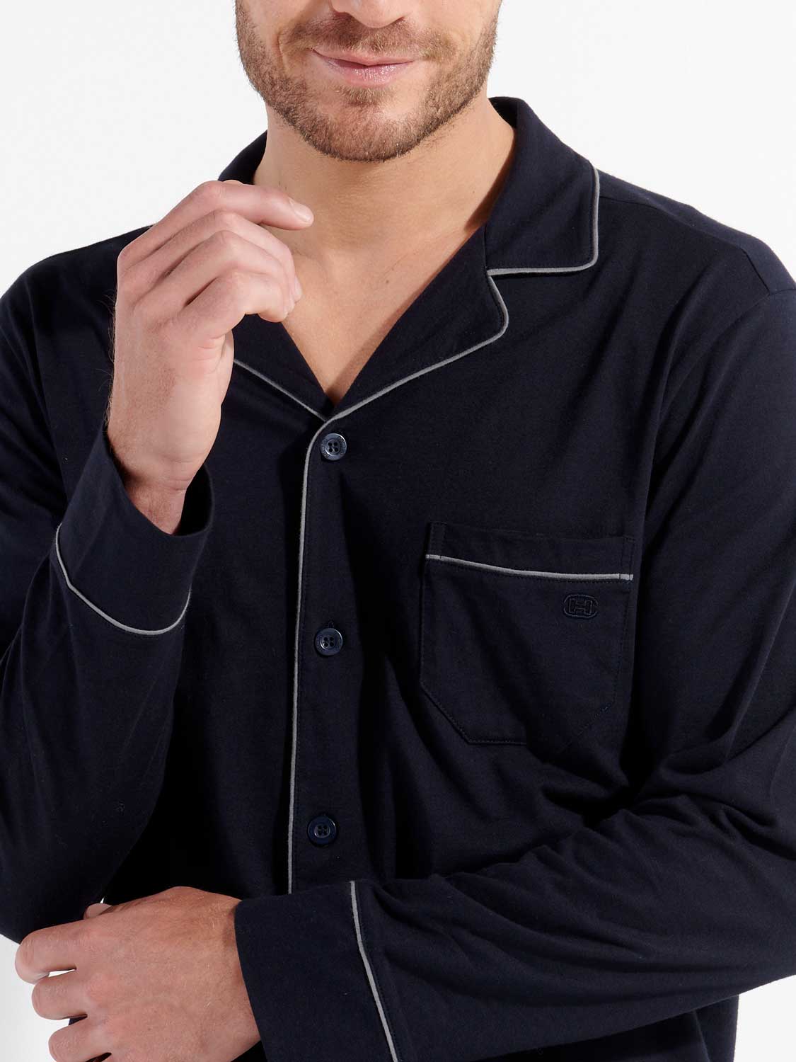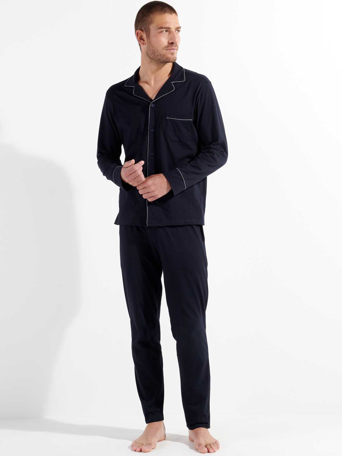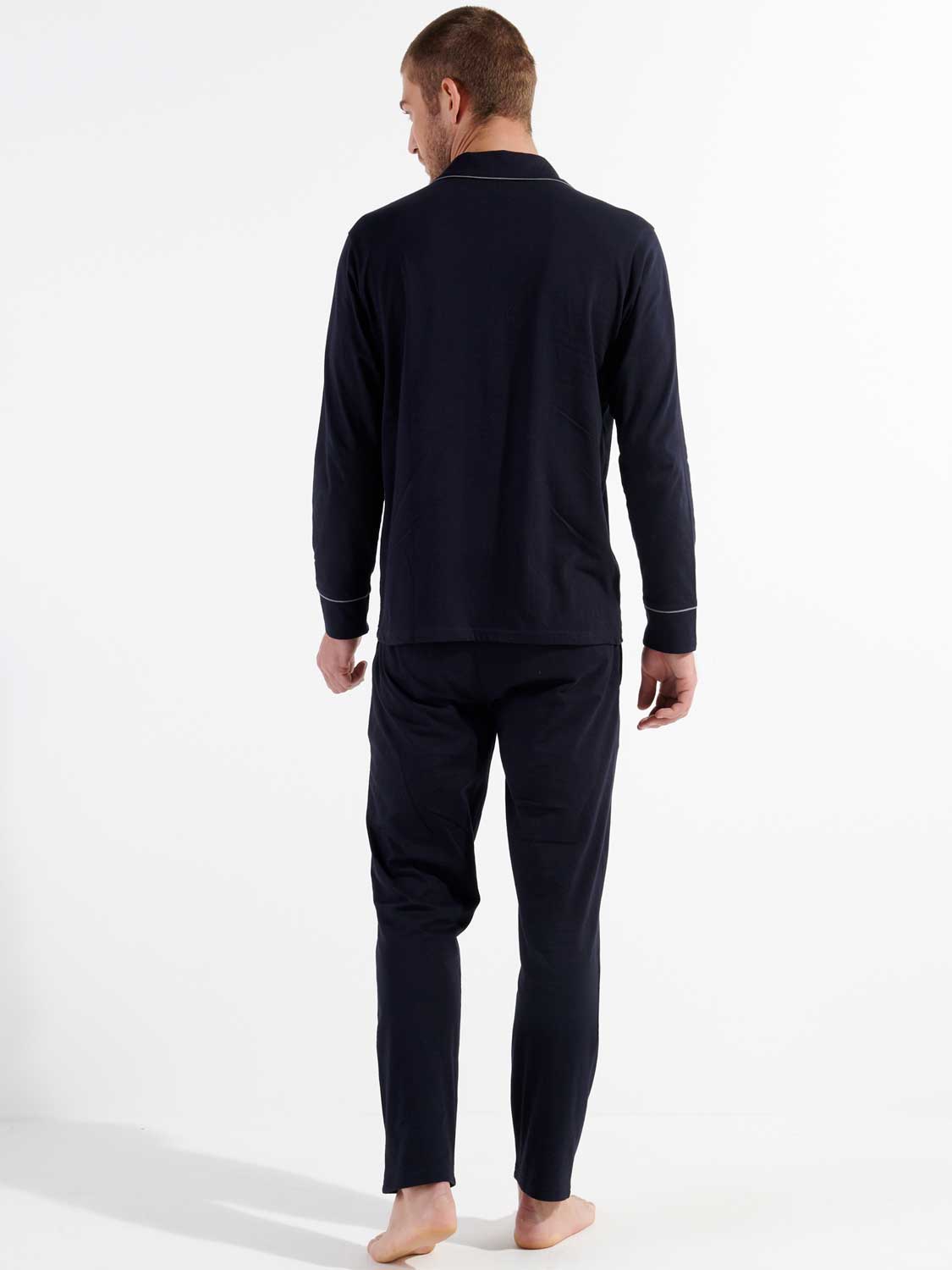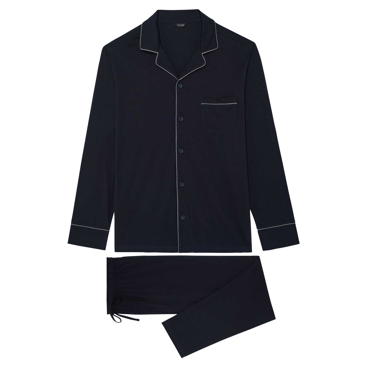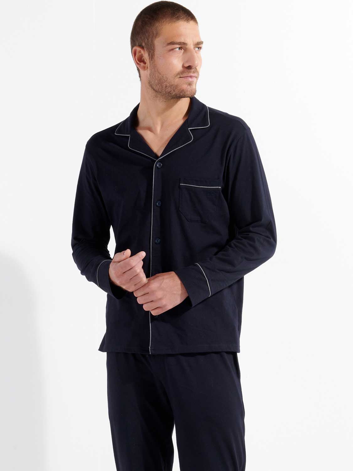 Der Pyjama ist in den Farben marineblau und grau erhältlich.