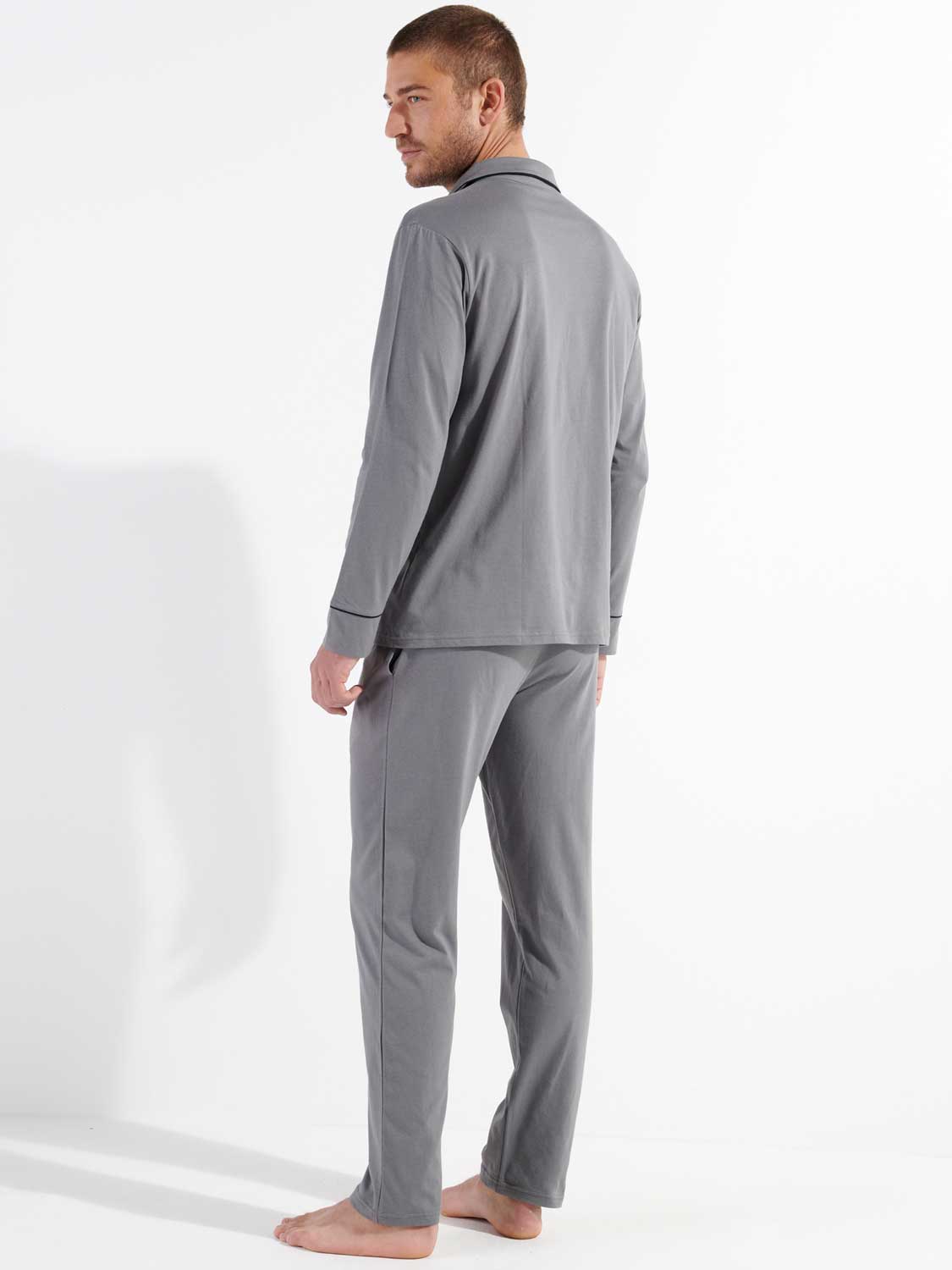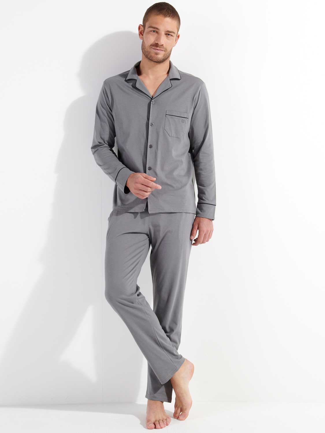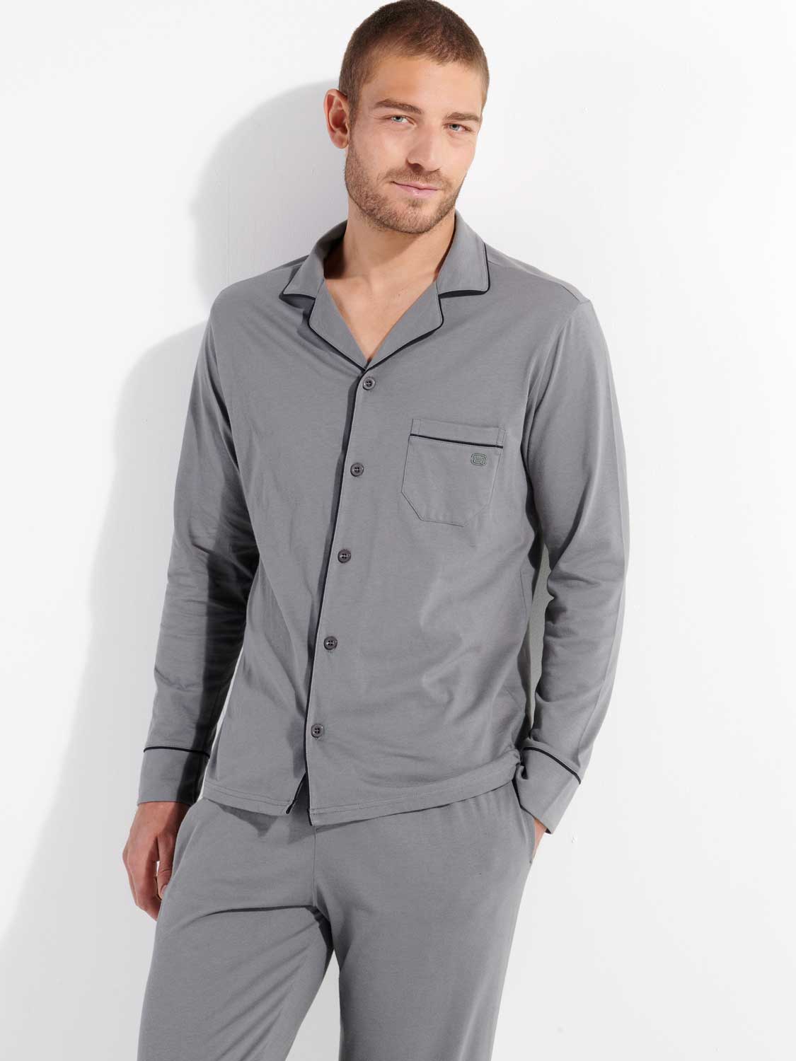 Der Pyjama ist in den Farben marineblau und grau erhältlich.