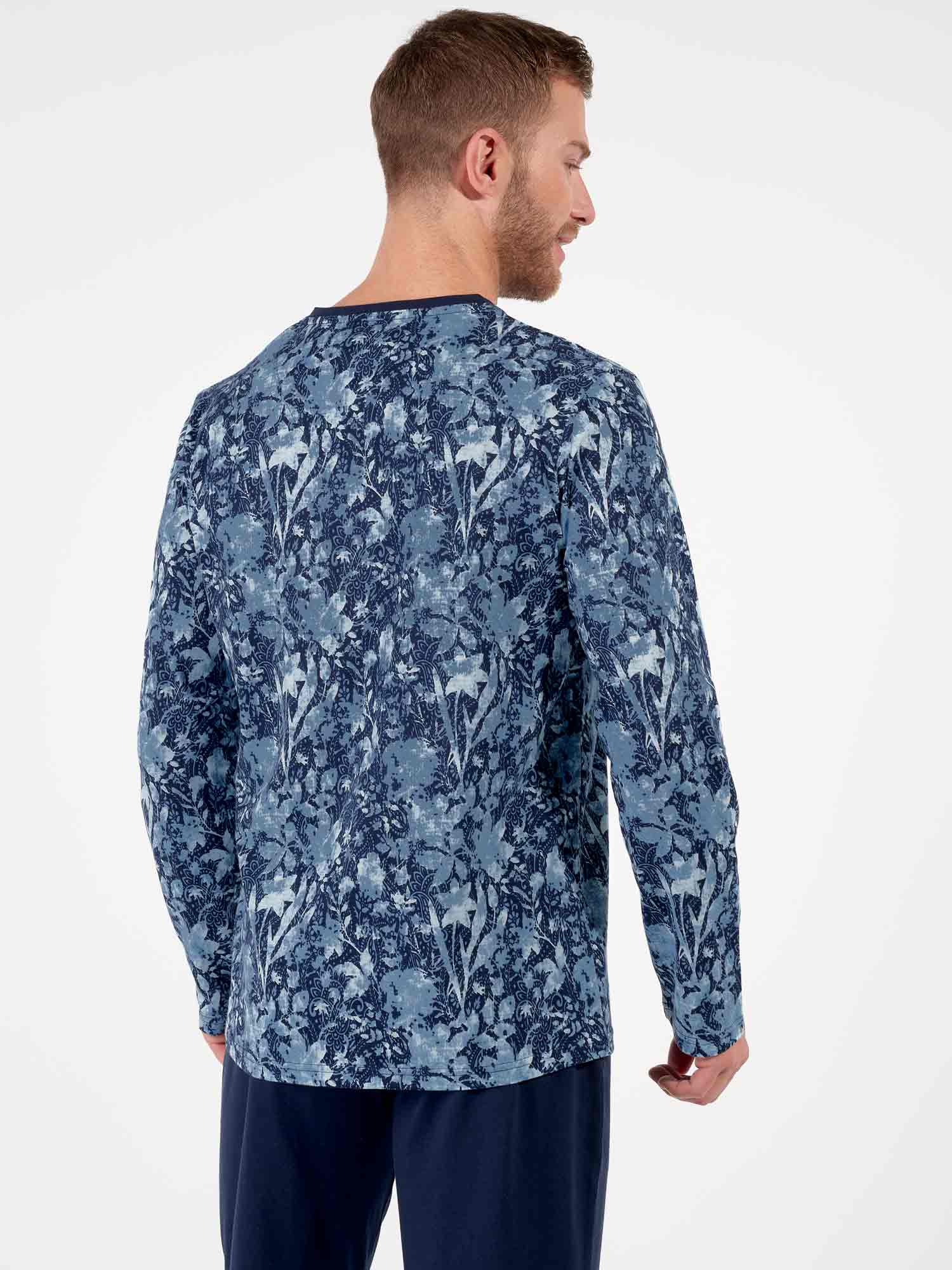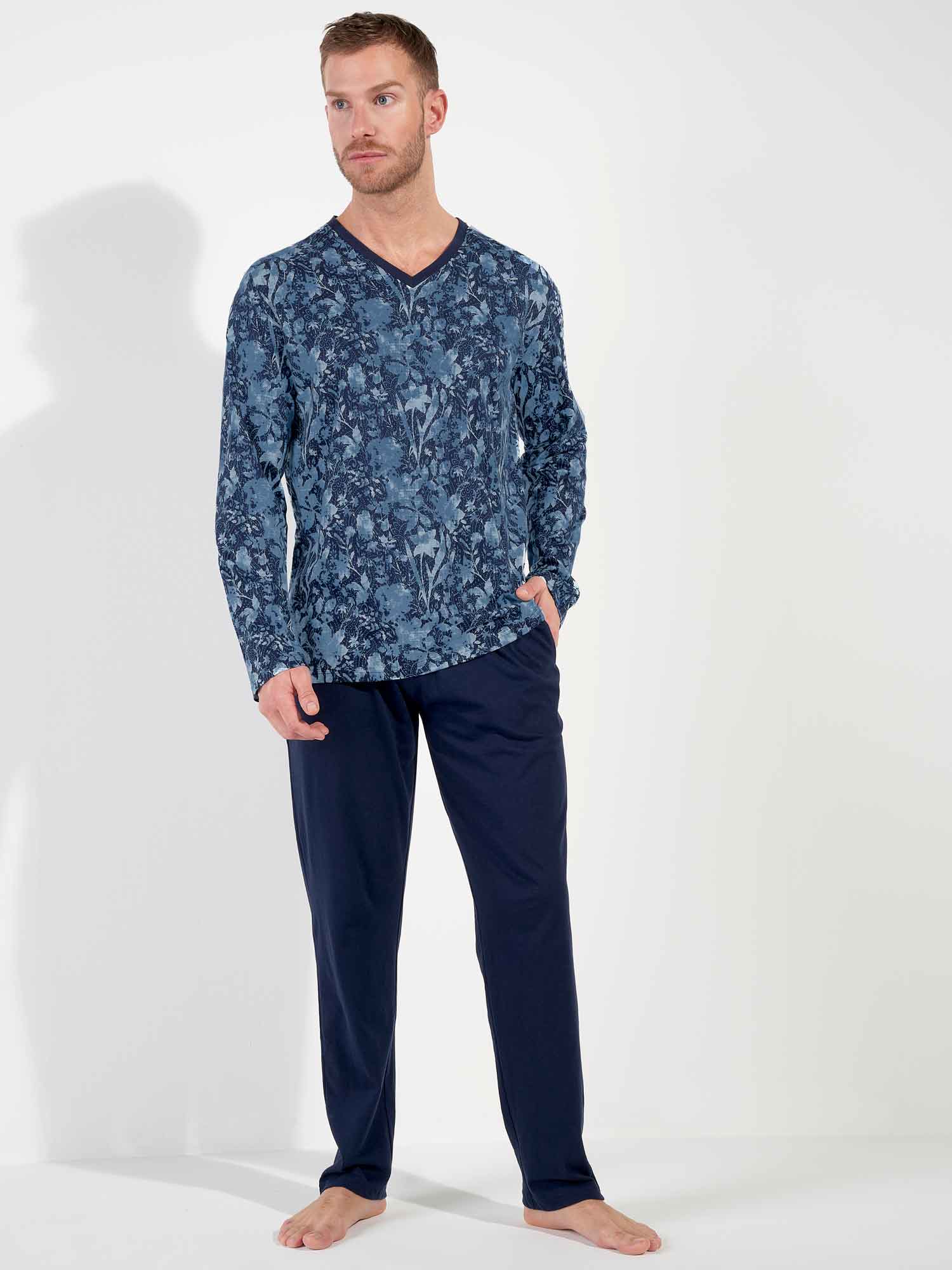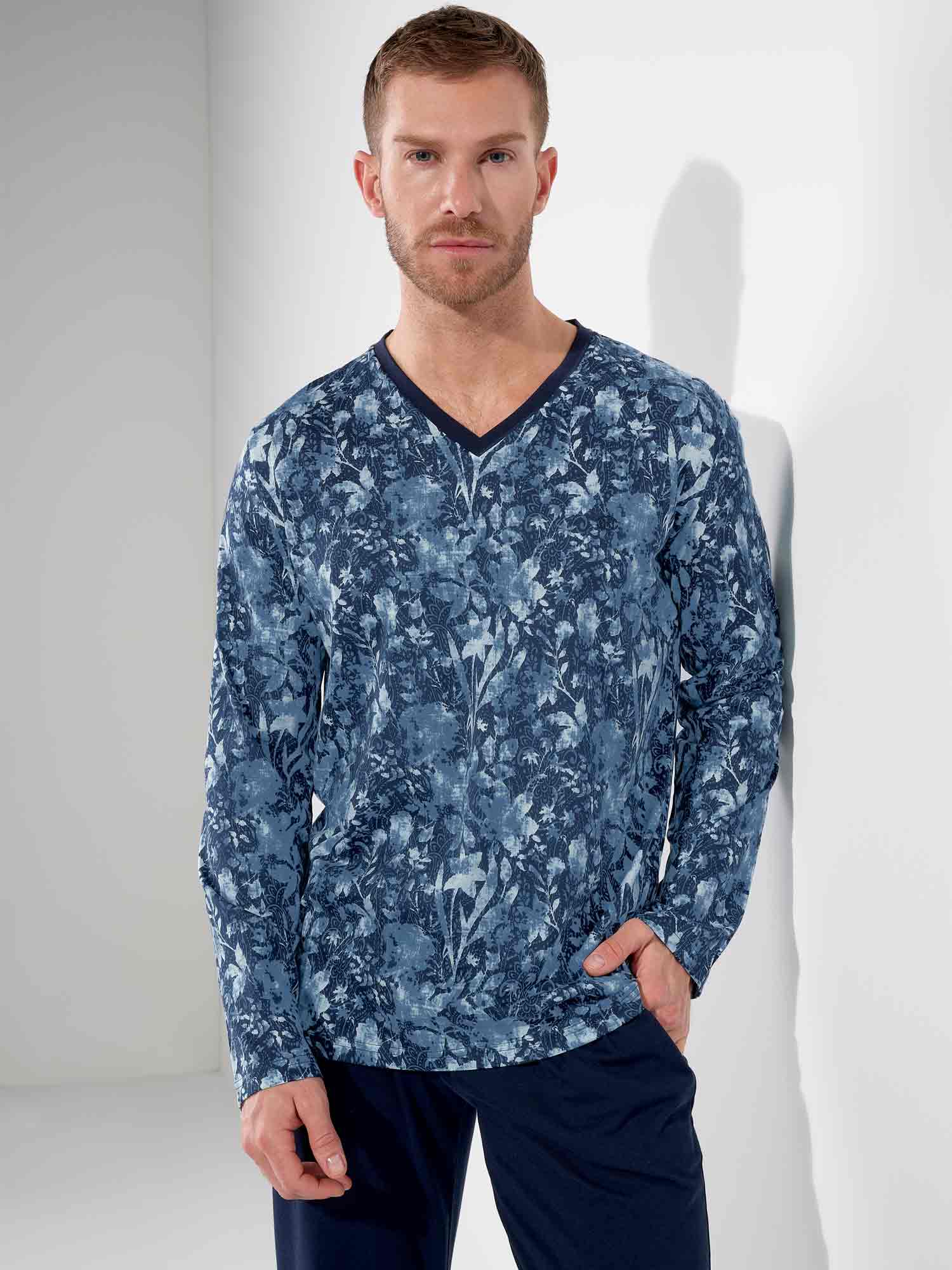 Der Compiegne Pyjama vereint künstlerischen Ausdruck mit einem entspannten Look. Aus 100 % Baumwolle gefertigt, fühlt sich das Material angenehm weich auf der Haut an. Das Oberteil ist mit einem floralen Print in verwaschenen Jeansblautönen verziert, der an ein Aquarellgemälde erinnert. Der tiefe V-Ausschnitt mit dunkelblauer Einfassung und das dezente HOM-Logo runden das Design elegant ab. Die einfarbige, dunkelblaue Hose mit geradem Bein und Kordelzug sorgt für höchsten Komfort beim Schlafen oder Entspannen. Eine stilvolle Wahl für Männer mit Anspruch an Charakter und Komfort.