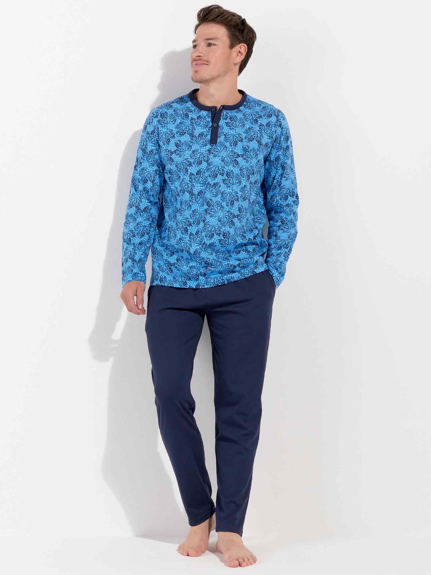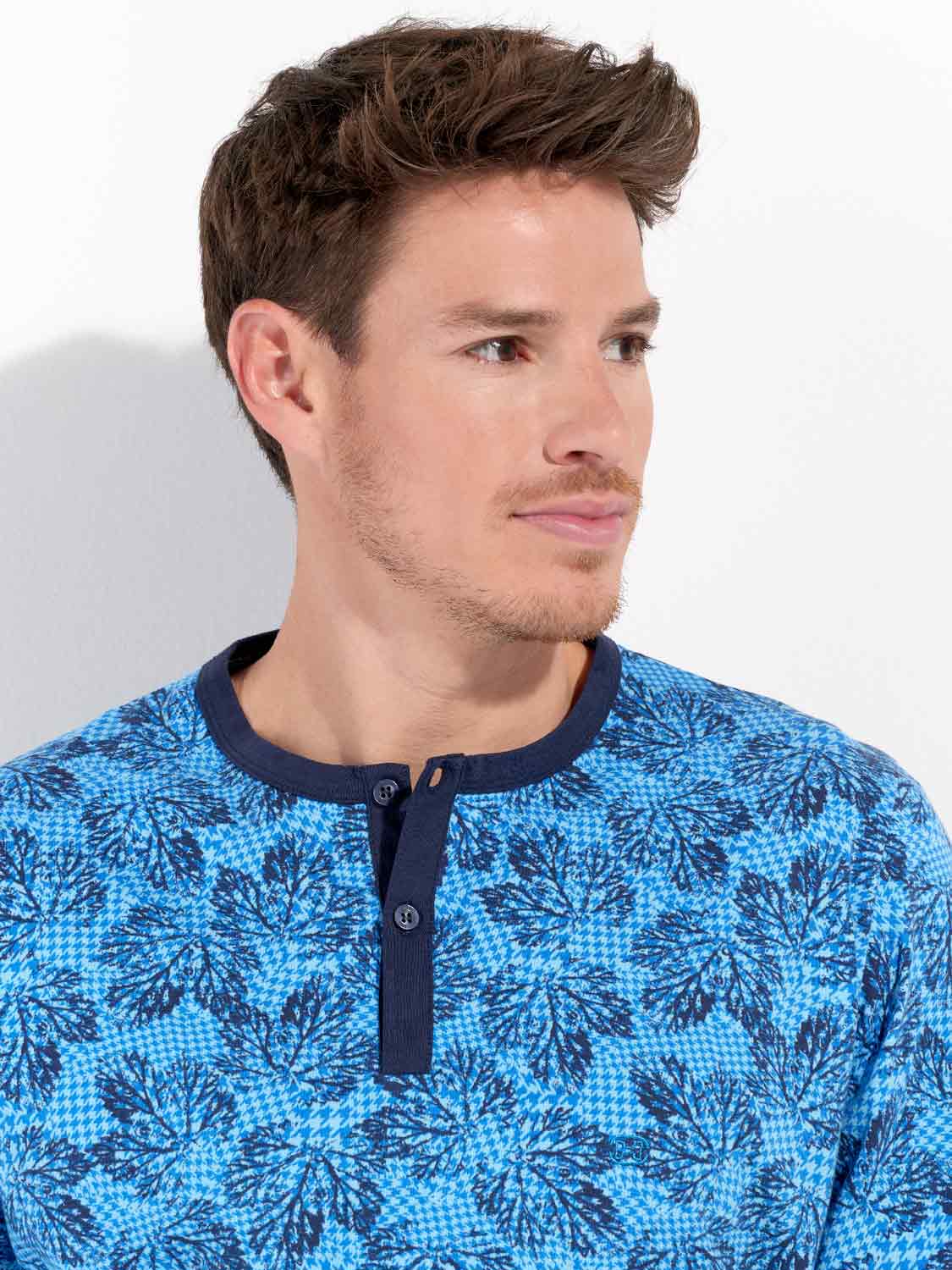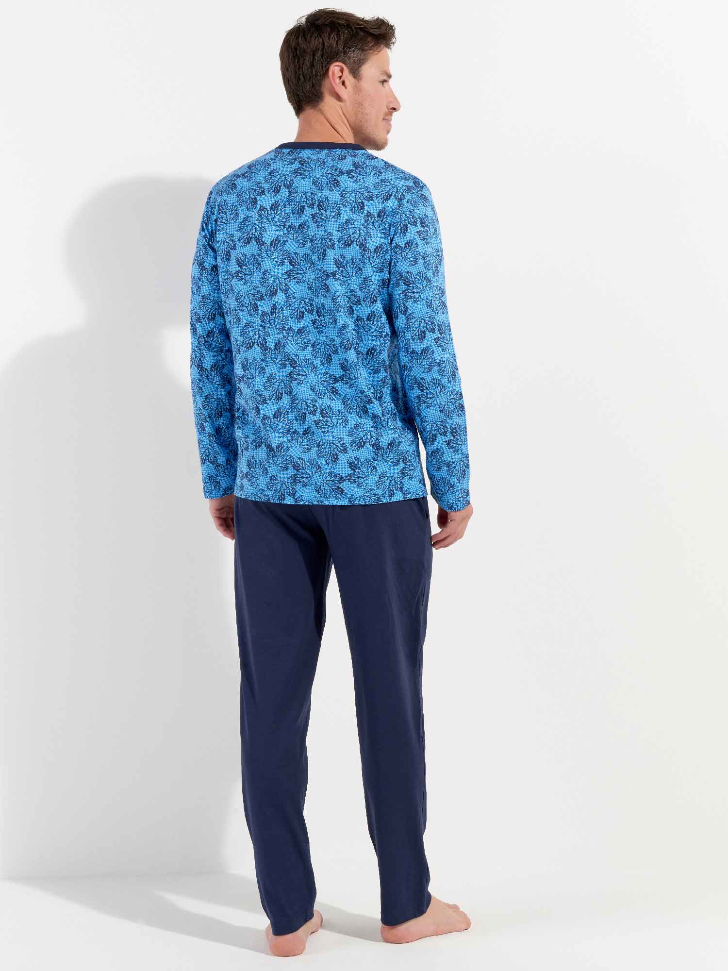 Das Douro - Lange Nachtwäsche besteht aus 100% Baumwolle, gefertigt in Jersey. Der Pyjama verfügt über ein langärmliges T-Shirt mit rundem Kragen und Knöpfen. Die lange Hose ist einfarbig mit Seitentaschen in den Nähten auf der linken und rechten Seite. Die lange Hose hat einen Kordelzug, um sie perfekt an die Größe anzupassen. Das Shirt hat einen Blätterdruck auf einem säureblauen Hintergrund.