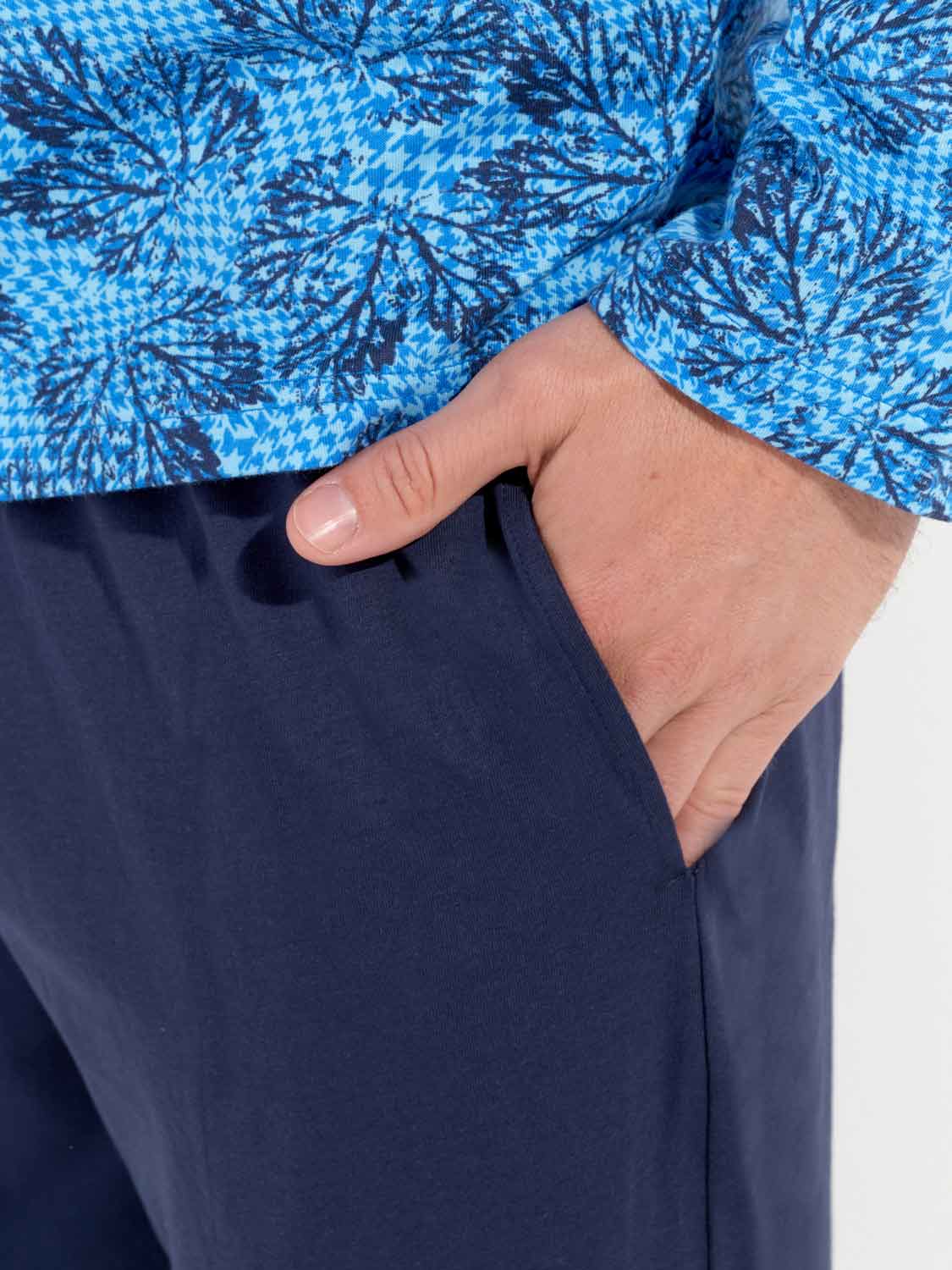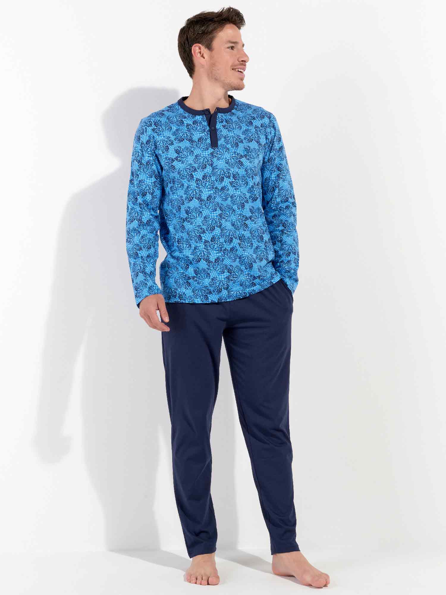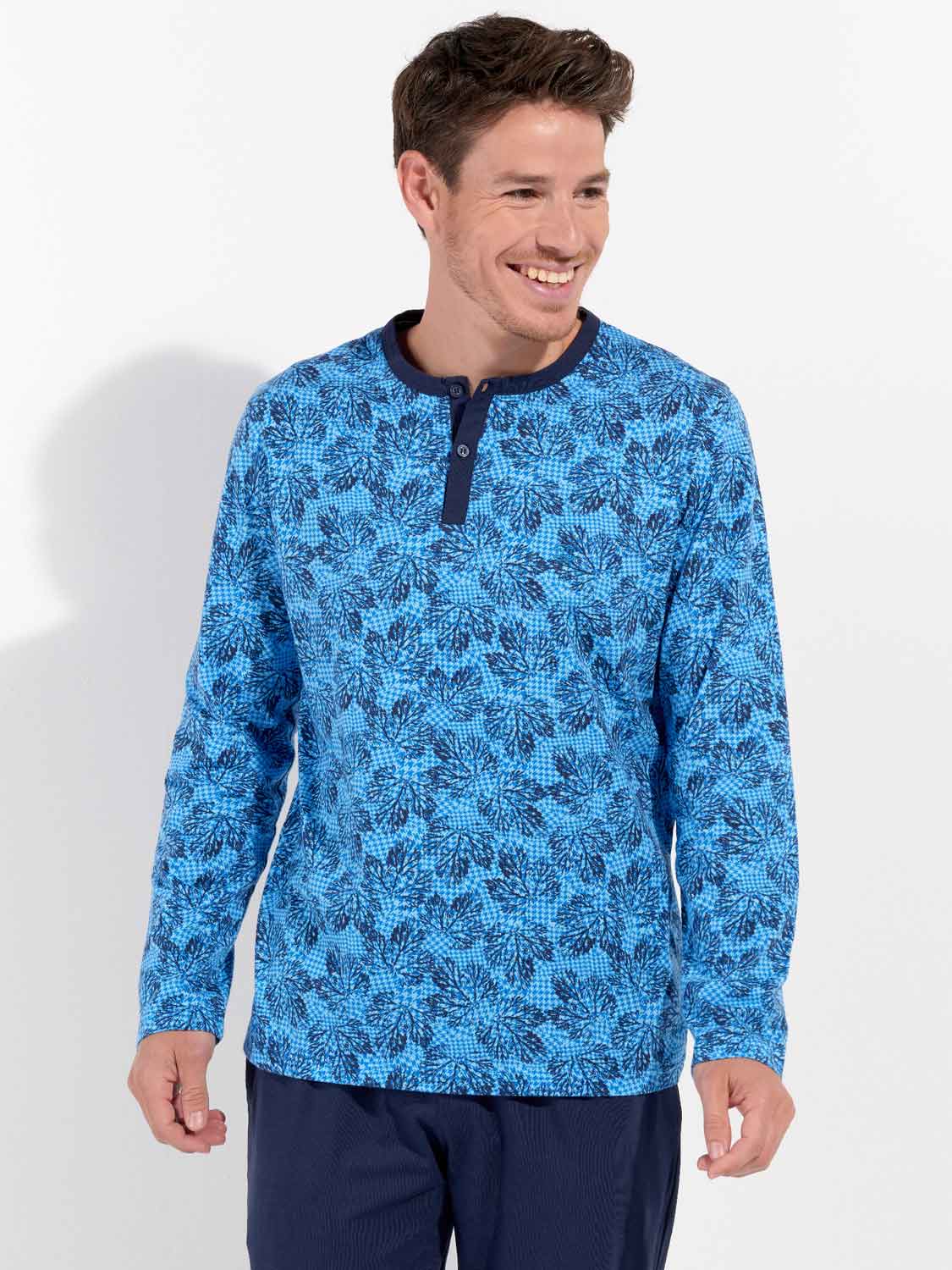Das Douro - Lange Nachtwäsche besteht aus 100% Baumwolle, gefertigt in Jersey. Der Pyjama verfügt über ein langärmliges T-Shirt mit rundem Kragen und Knöpfen. Die lange Hose ist einfarbig mit Seitentaschen in den Nähten auf der linken und rechten Seite. Die lange Hose hat einen Kordelzug, um sie perfekt an die Größe anzupassen. Das Shirt hat einen Blätterdruck auf einem säureblauen Hintergrund.