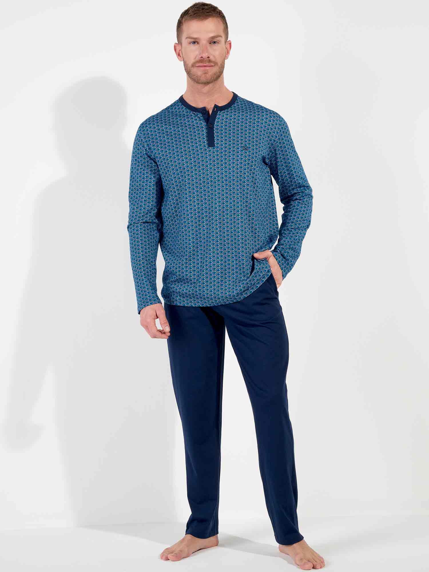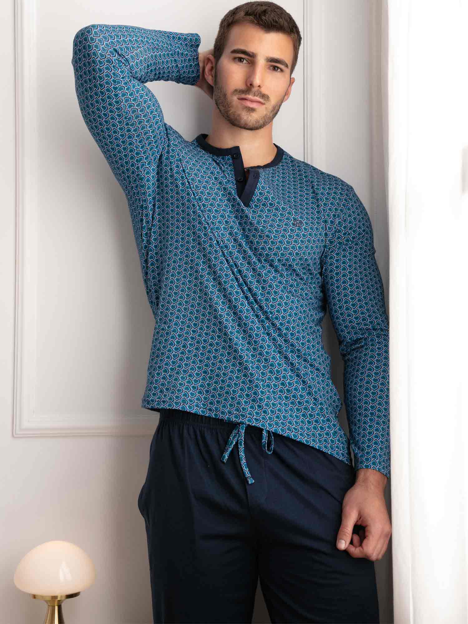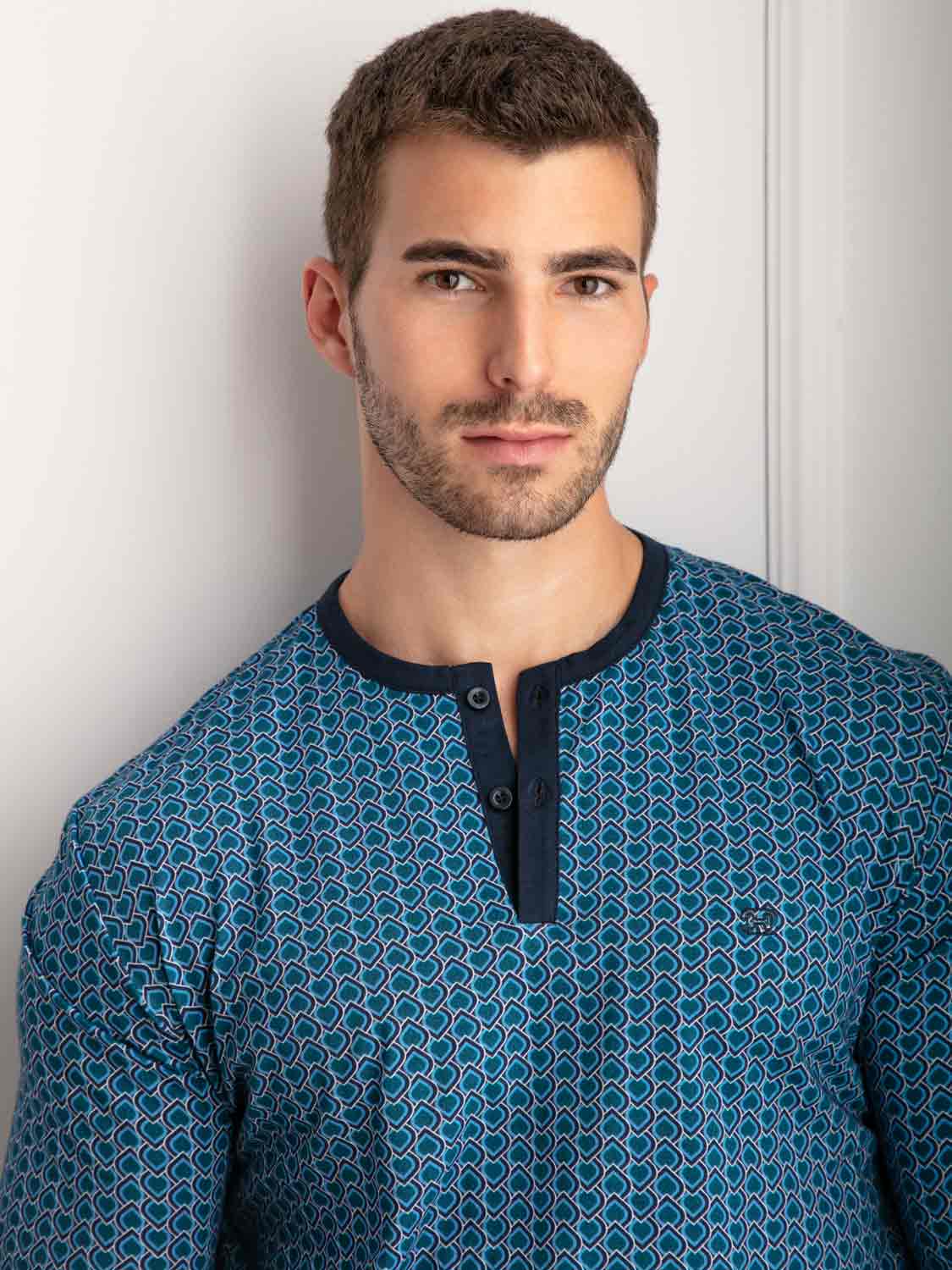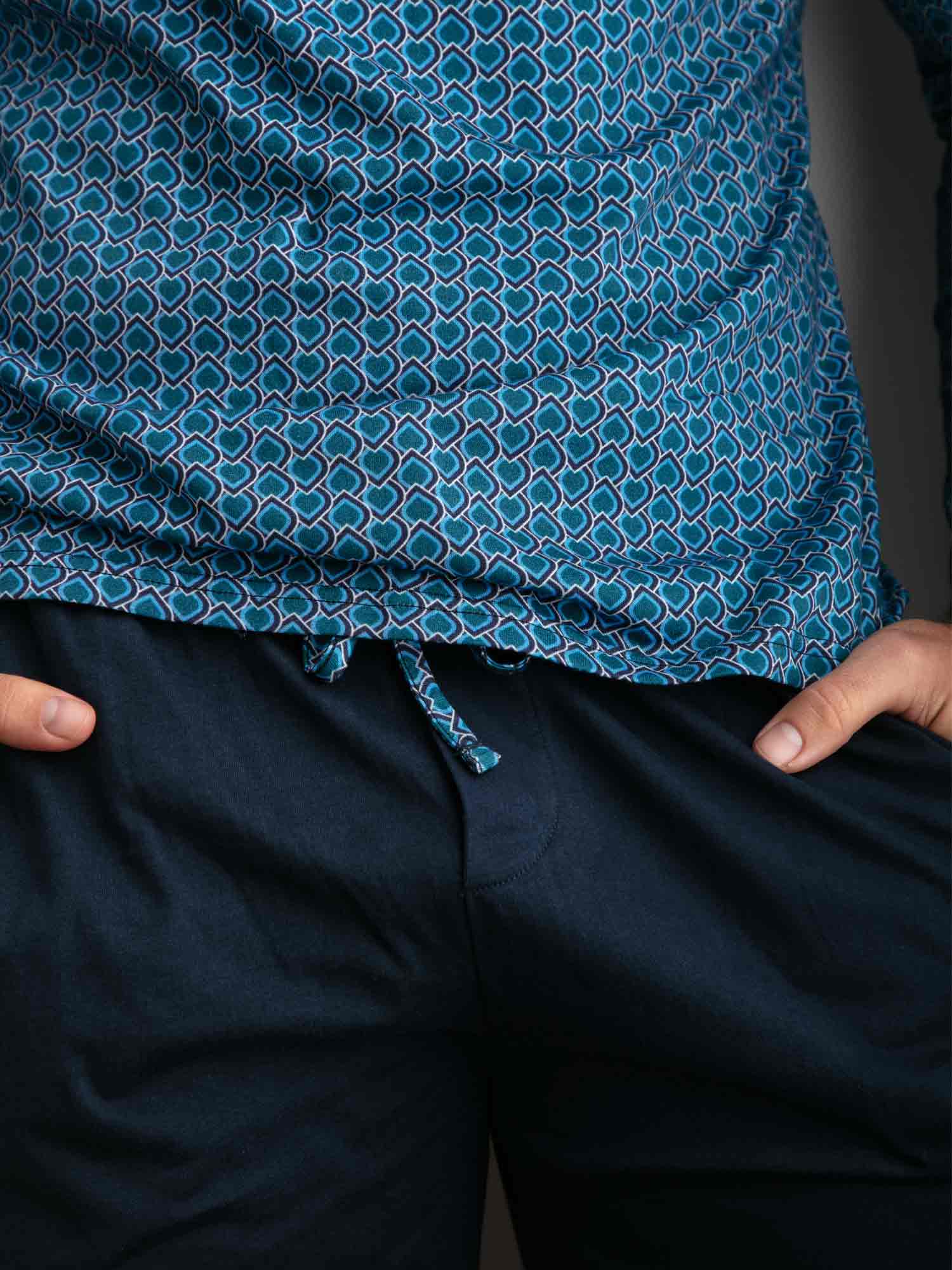 Der Martinez lange Pyjama von HOM ist eine Hommage an die klaren Linien der Art-Déco-Ära. Das grafische Schuppenmuster in Blau- und Türkistönen, inspiriert von ägyptischen Ornamenten, sorgt für einen eleganten und auffälligen Look. Der Tunika-Kragen und die kontrastierende Knopfleiste setzen stilvolle Akzente. Aus 100% Baumwolle gefertigt, fühlt sich der Stoff angenehm weich auf der Haut an und bietet höchsten Tragekomfort. Ideal für entspannte Abende und ruhige Nächte.