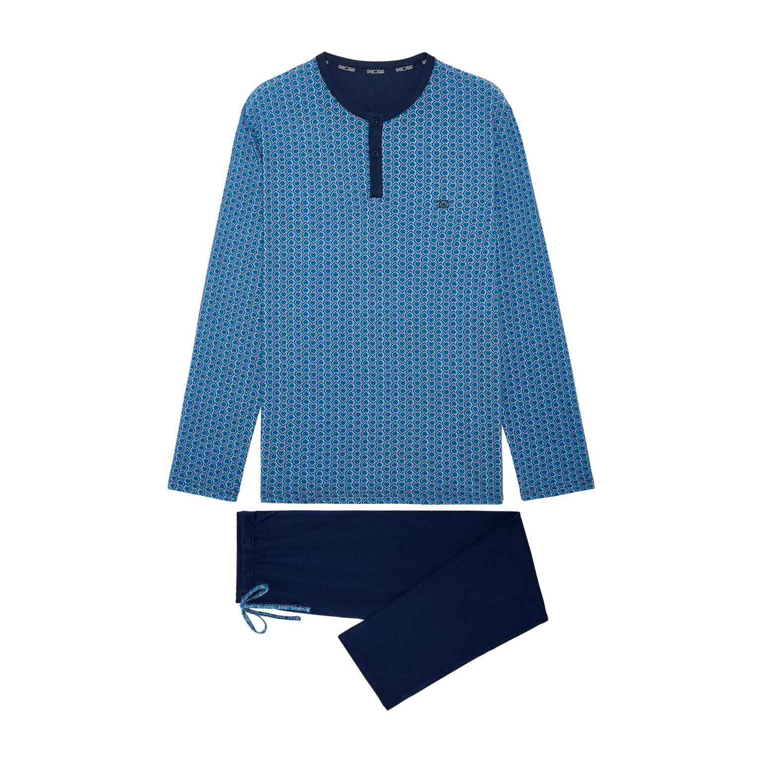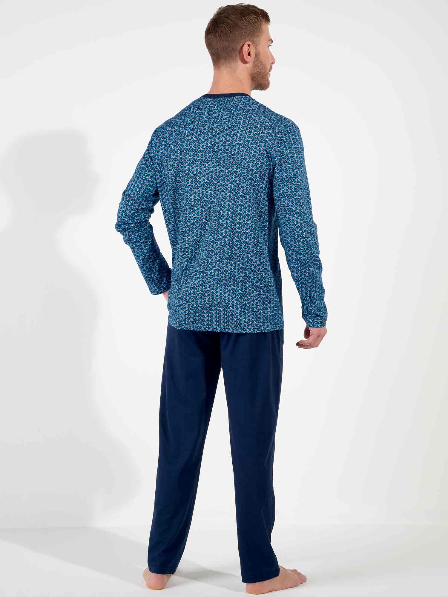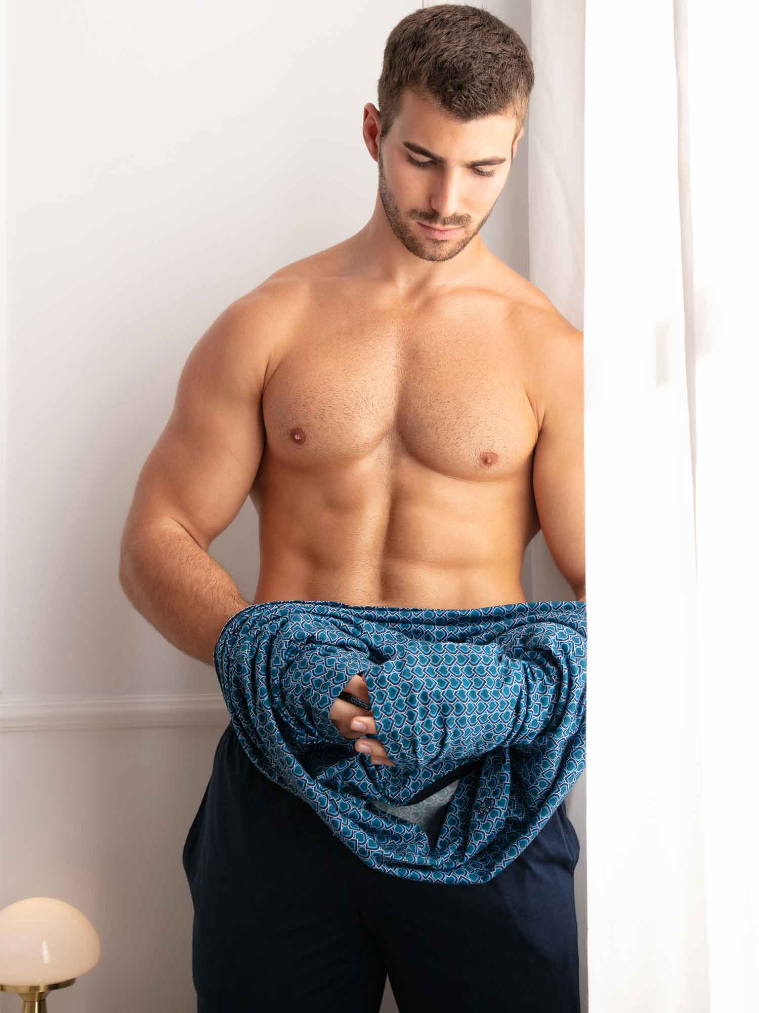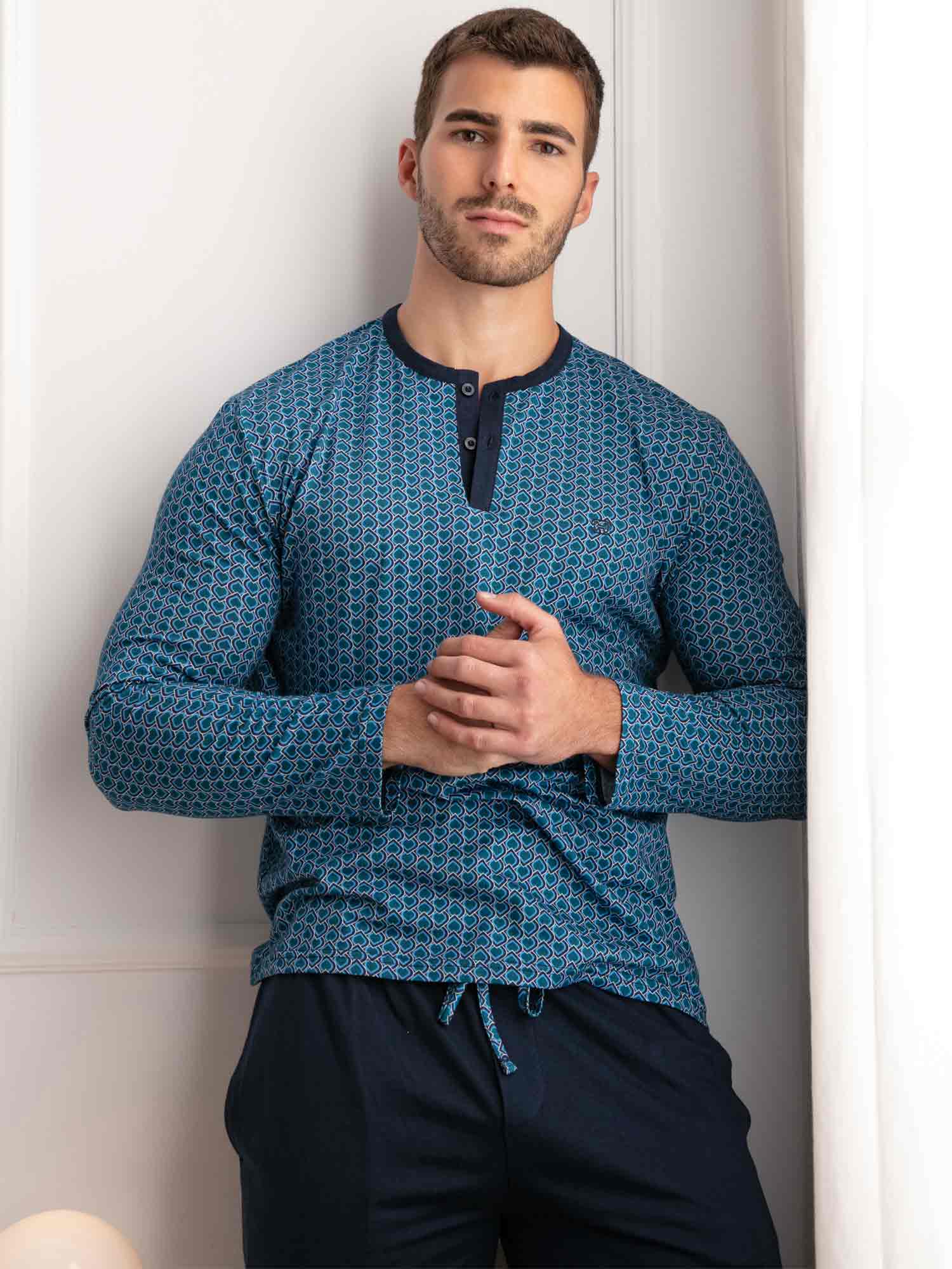 Der Martinez lange Pyjama von HOM ist eine Hommage an die klaren Linien der Art-Déco-Ära. Das grafische Schuppenmuster in Blau- und Türkistönen, inspiriert von ägyptischen Ornamenten, sorgt für einen eleganten und auffälligen Look. Der Tunika-Kragen und die kontrastierende Knopfleiste setzen stilvolle Akzente. Aus 100% Baumwolle gefertigt, fühlt sich der Stoff angenehm weich auf der Haut an und bietet höchsten Tragekomfort. Ideal für entspannte Abende und ruhige Nächte.