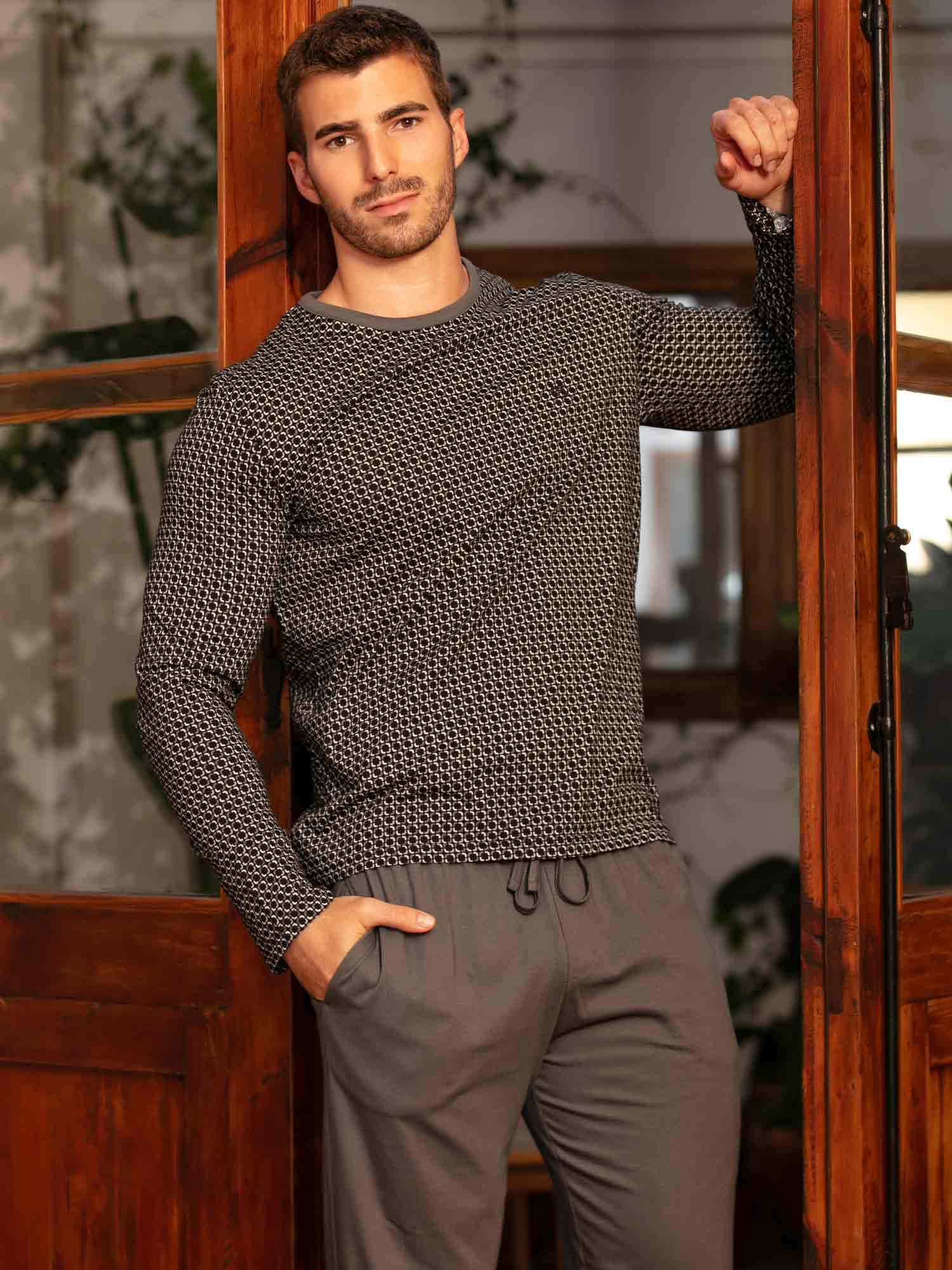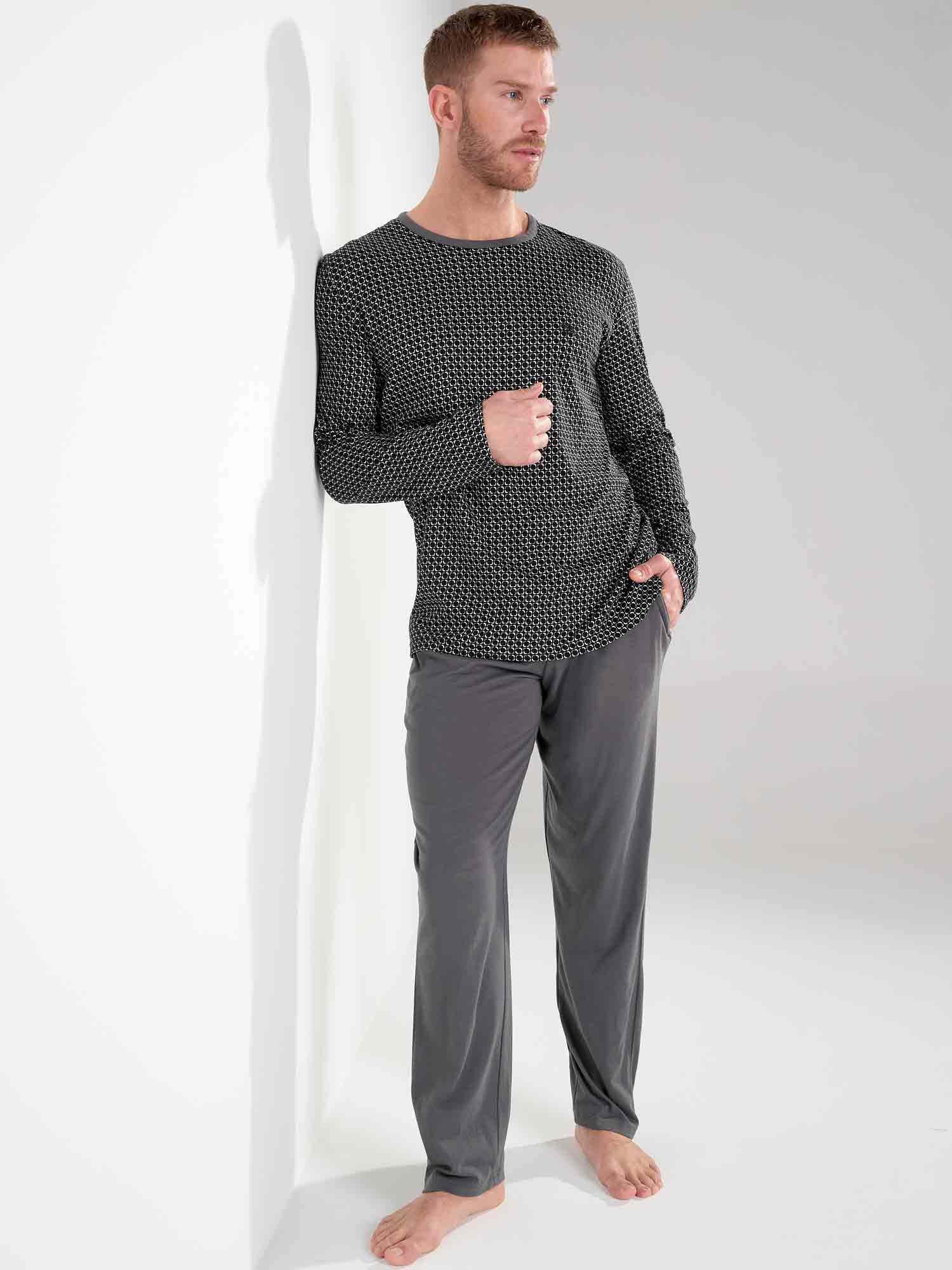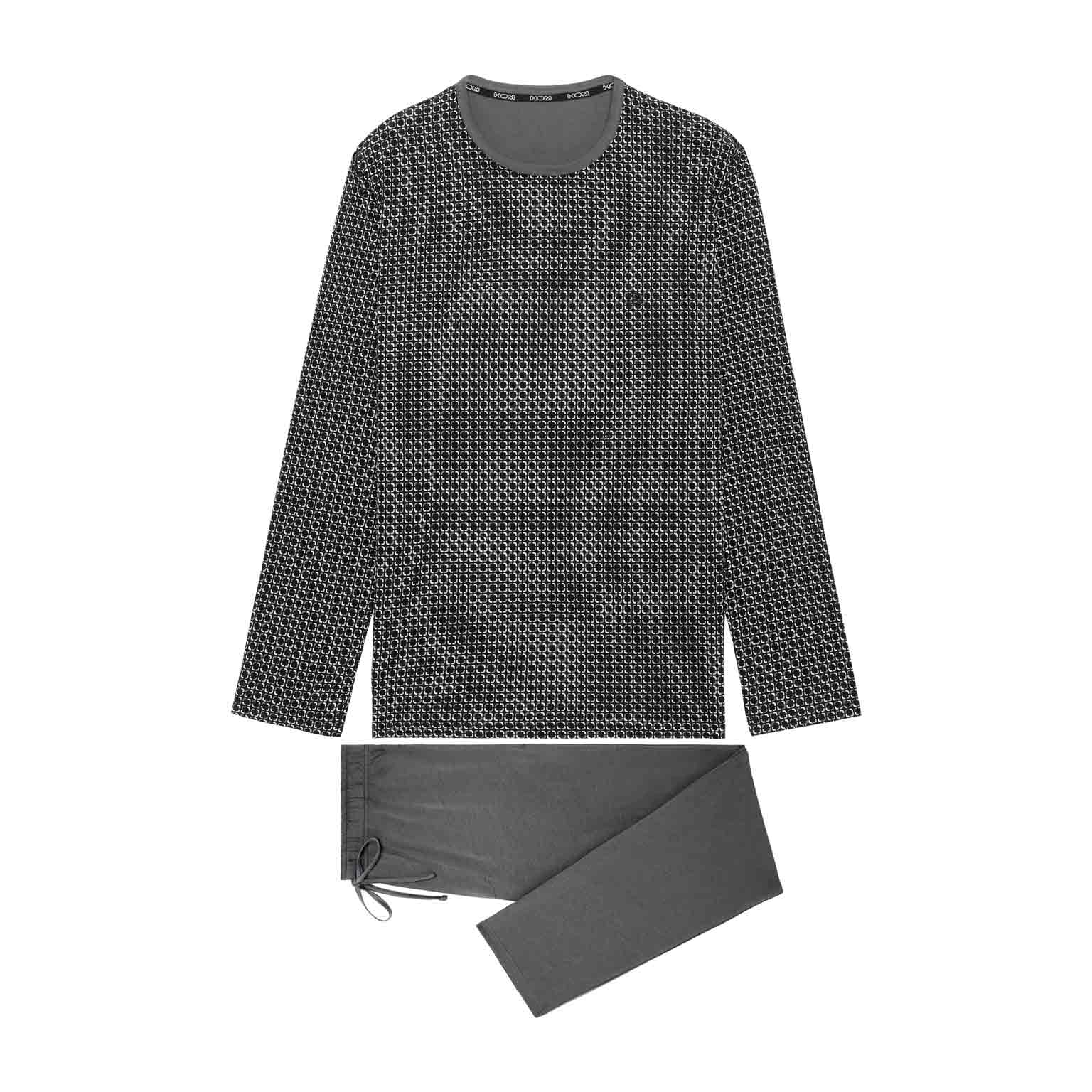 Der Waldorf Pyjama vereint klare Linien mit modernem Komfort. Das Oberteil zeigt ein feines schwarz-weißes Grafikmuster für einen zeitgemäßen, aber dezenten Look. Der graue Rundhalsausschnitt sorgt für eine lässige Note, während das gestickte HOM-Logo die hochwertige Verarbeitung unterstreicht. Die einfarbige Hose in Dunkelgrau mit geradem Bein, Seitentaschen und verstellbarem Kordelzug bietet optimalen Tragekomfort – ob beim Schlafen oder Entspannen. Eine stilvolle Wahl für Männer, die minimalistisches Design schätzen.
