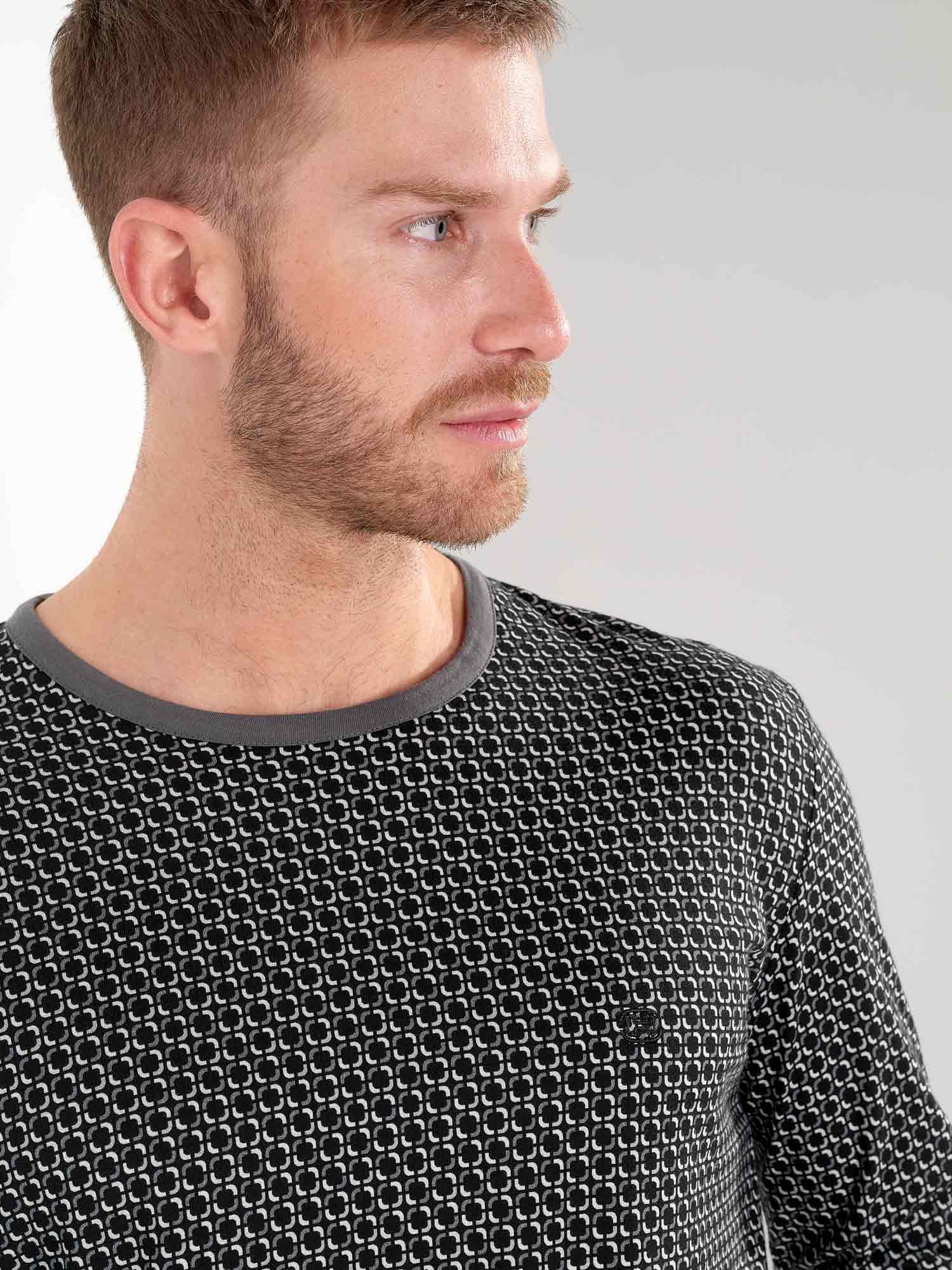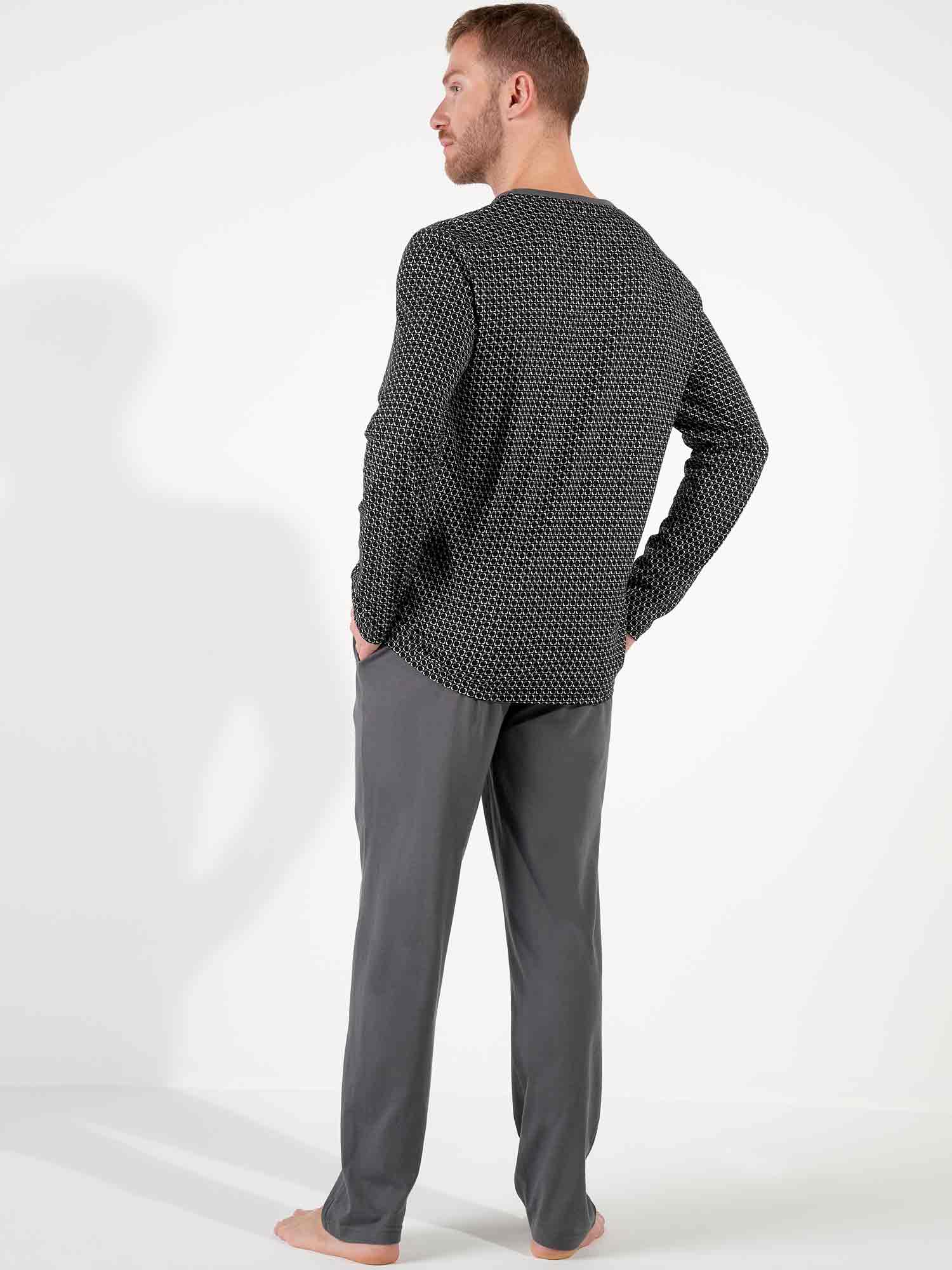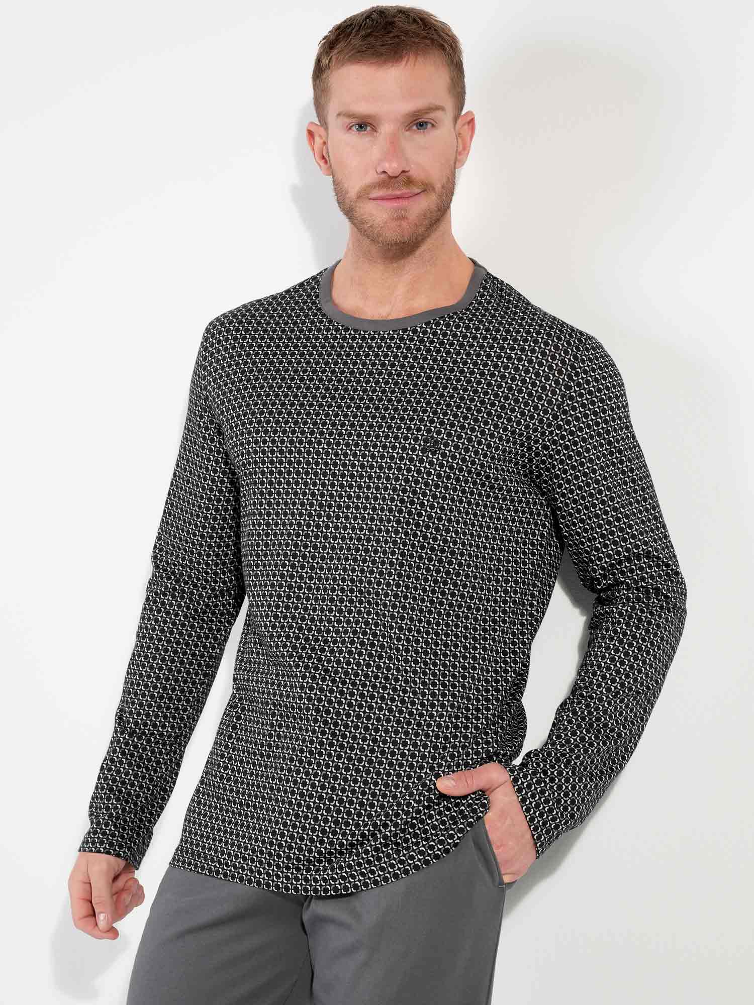 Der Waldorf Pyjama vereint klare Linien mit modernem Komfort. Das Oberteil zeigt ein feines schwarz-weißes Grafikmuster für einen zeitgemäßen, aber dezenten Look. Der graue Rundhalsausschnitt sorgt für eine lässige Note, während das gestickte HOM-Logo die hochwertige Verarbeitung unterstreicht. Die einfarbige Hose in Dunkelgrau mit geradem Bein, Seitentaschen und verstellbarem Kordelzug bietet optimalen Tragekomfort – ob beim Schlafen oder Entspannen. Eine stilvolle Wahl für Männer, die minimalistisches Design schätzen.