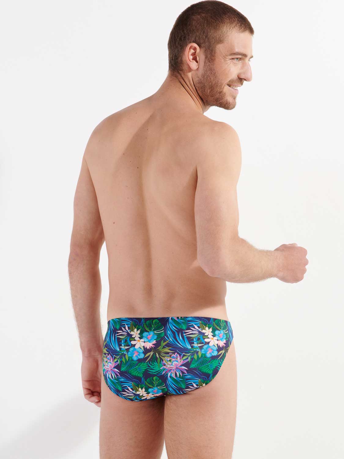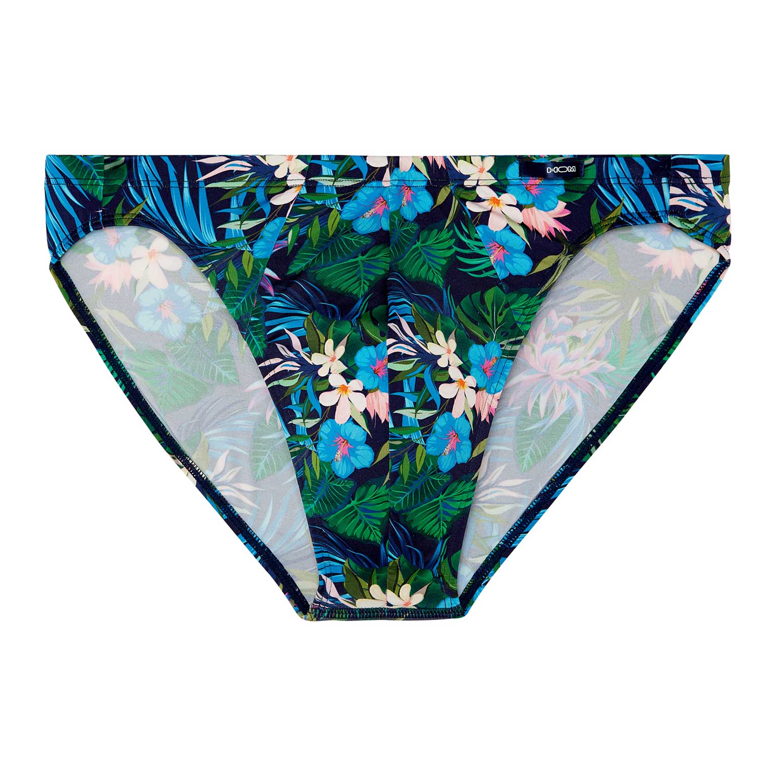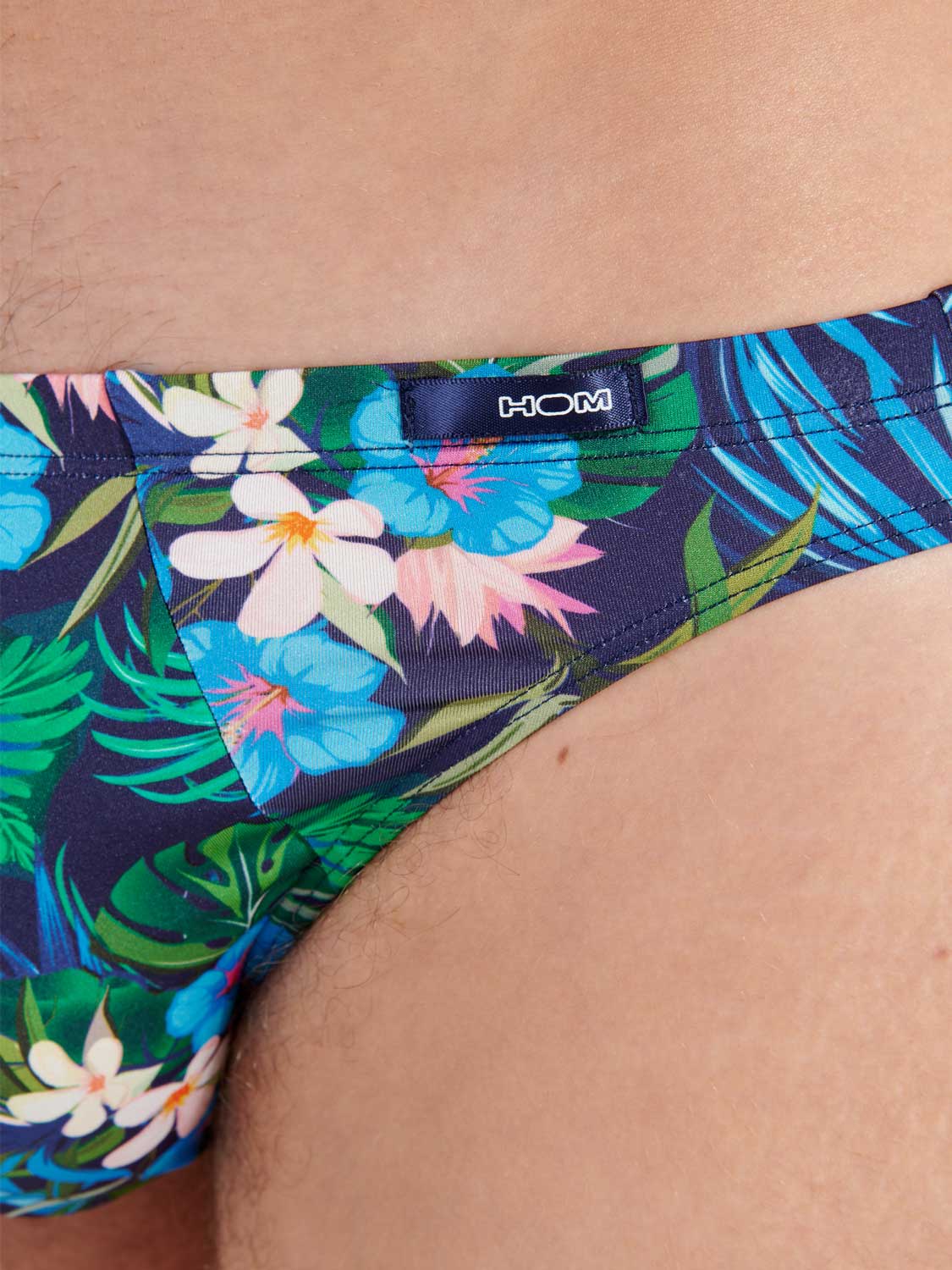 Der Yoni - Comfort Micro Slip besteht aus einer bequemen Mikrofaser und verfügt über einen Komfortbund, bei dem der Stoff bis über das Gummiband gezogen wird, um optimalen Komfort zu gewährleisten. Der Herrenslip ist mit einem exotischen Blumendruck in den Farben Türkis, Fuchsia und Grün auf dunkelblauem Grund versehen. Ein kleines Etikett mit dem HOM-Logo befindet sich vorne links auf dem Komfortband.