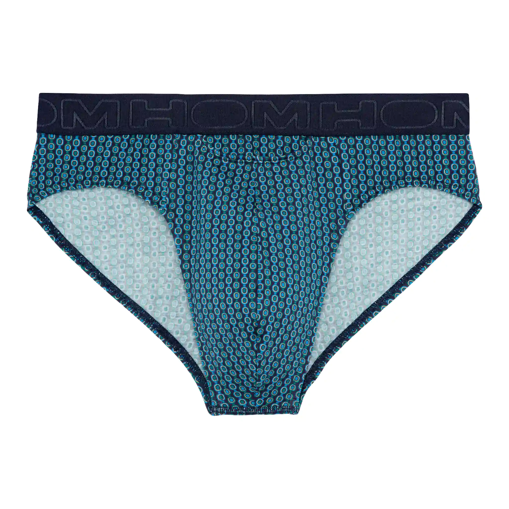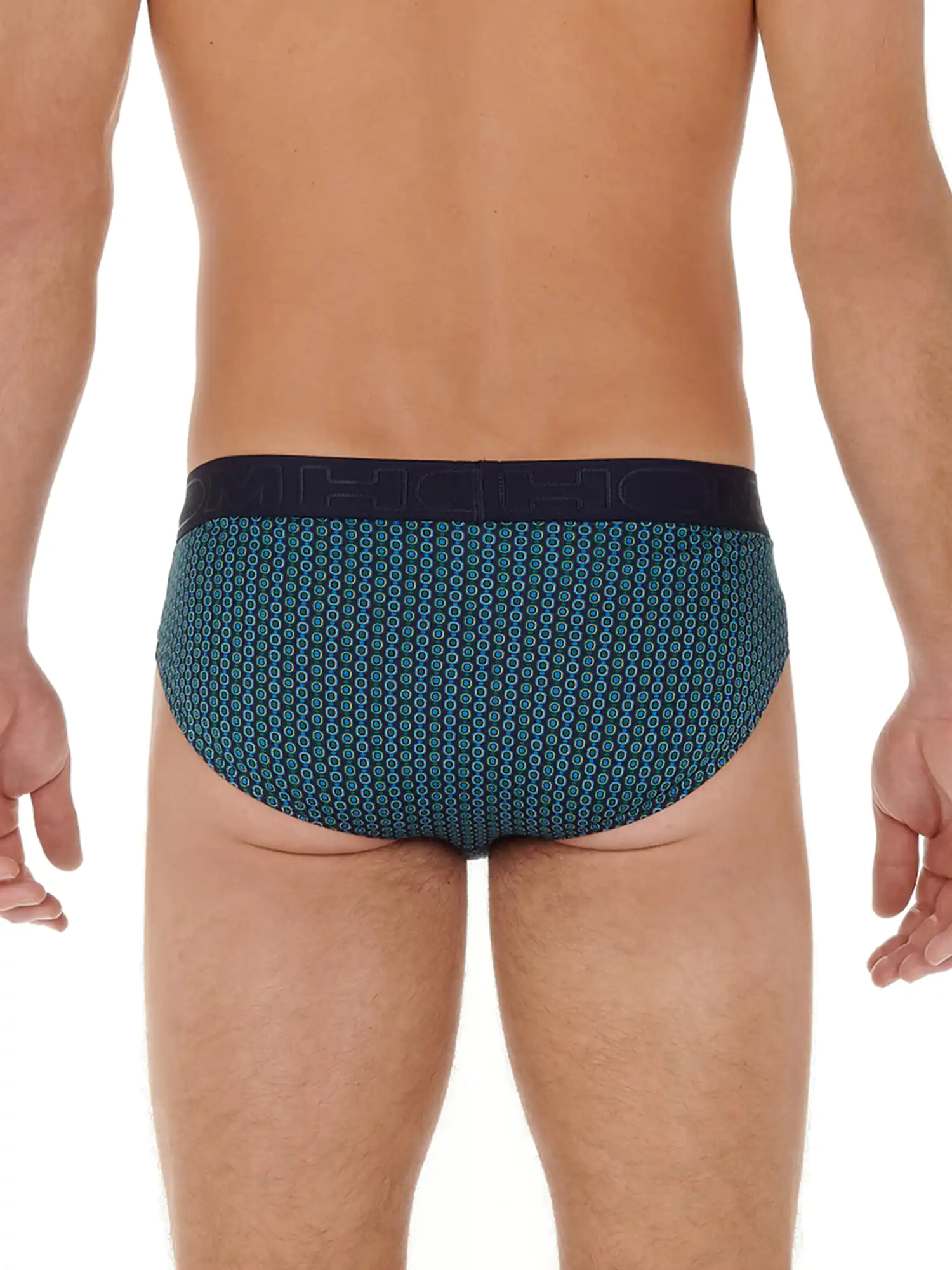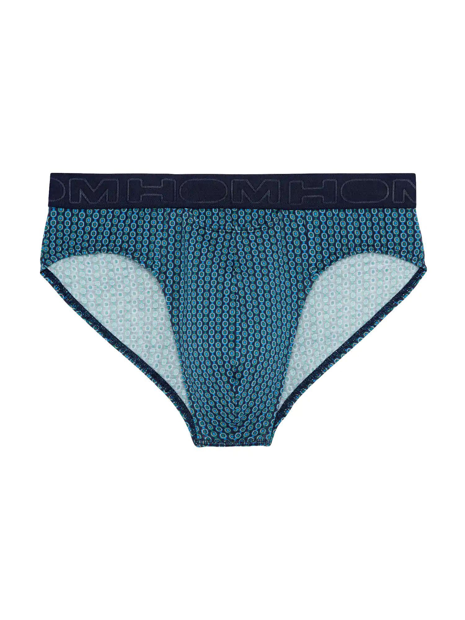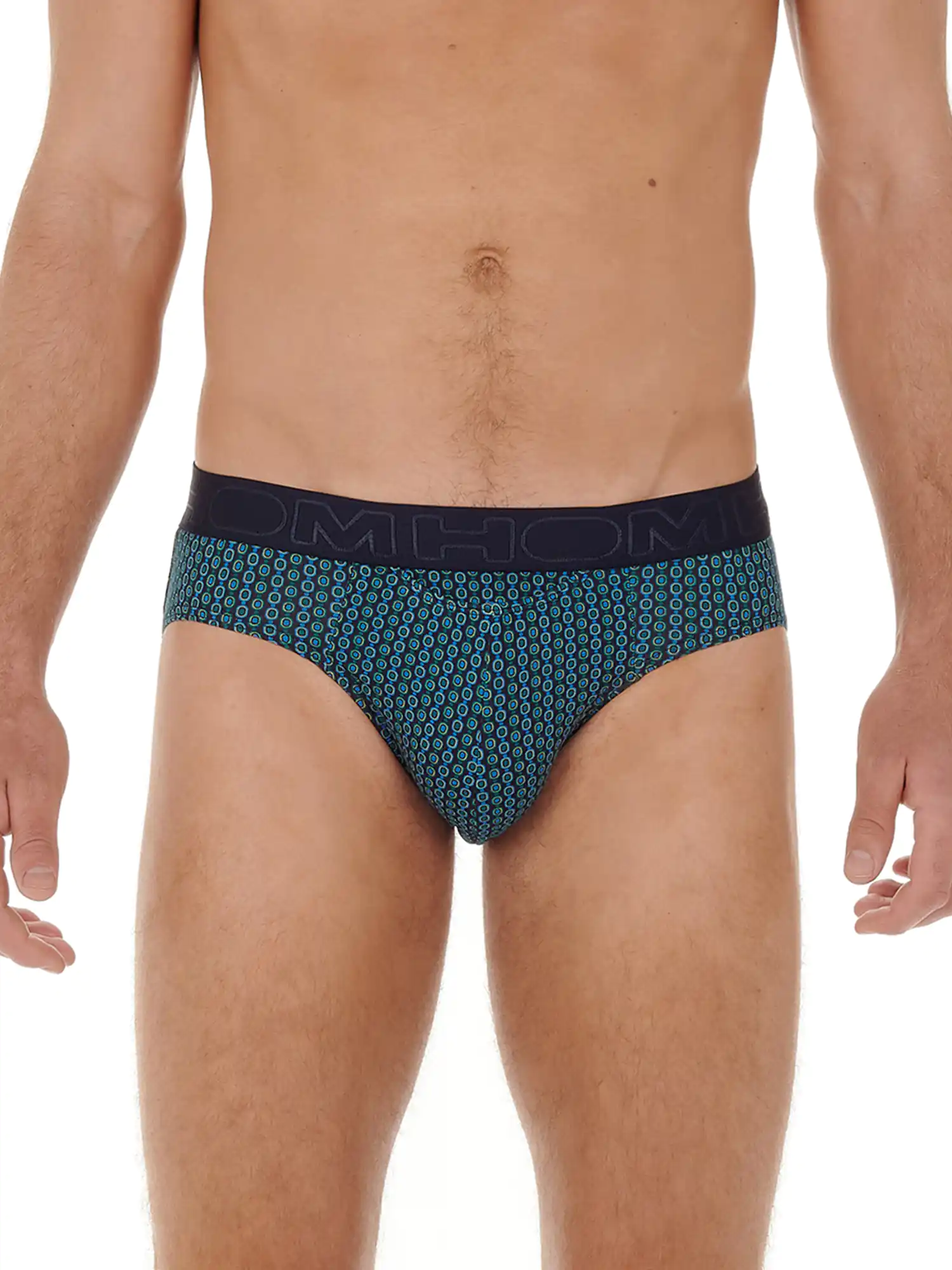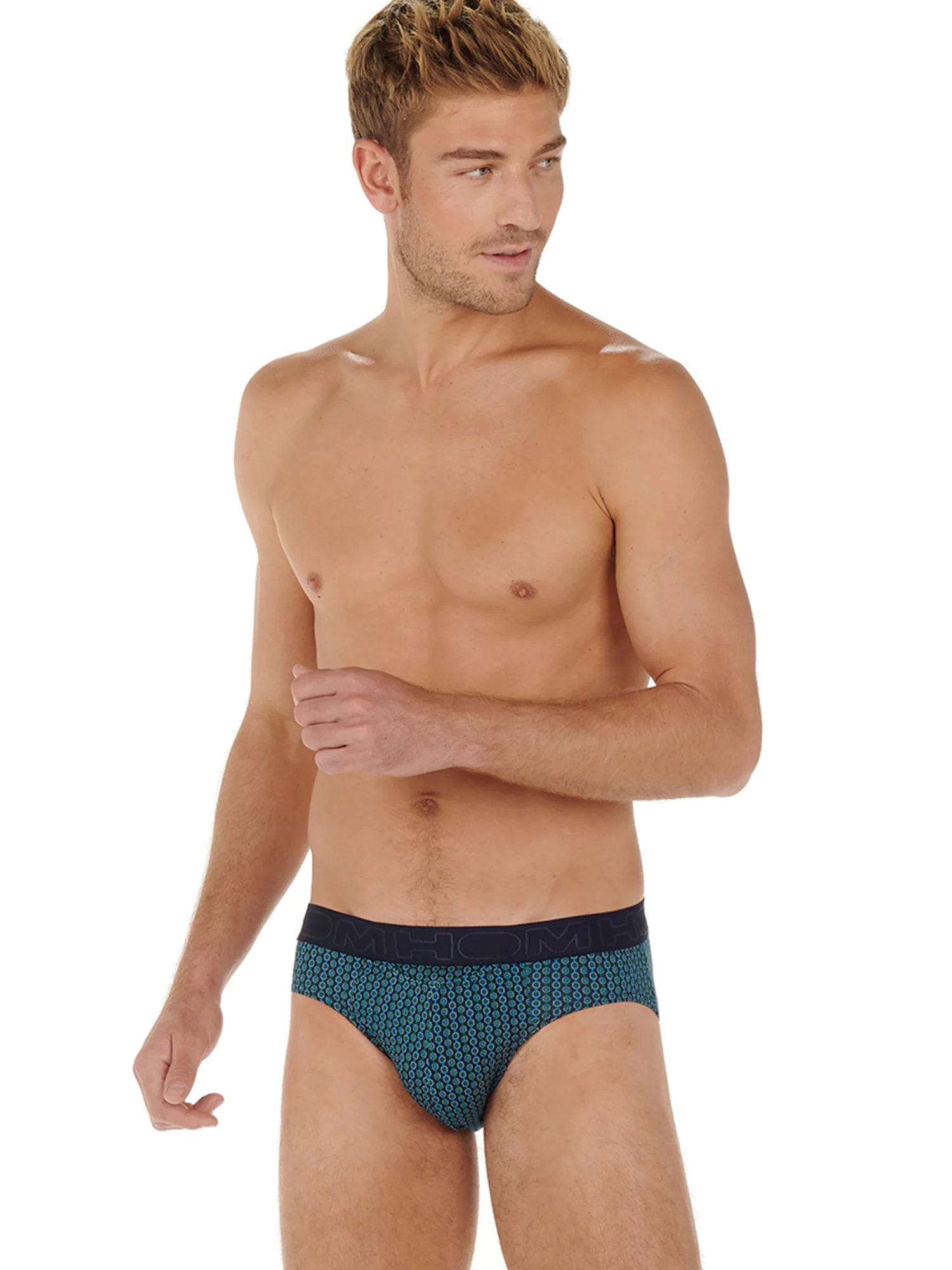 Der Andy - HO1 Mini Slip ist aus einer bequemen Baumwoll-Modal-Mischung gefertigt und verfügt über den berühmten "horizontalen Schlitz" von HOM. Der Andy hat einen klassischen Druck mit einem ovalen Muster in Grüntönen auf einem marineblauen Hintergrund. Das Baumwoll-Modal-Gemisch fühlt sich weich an und passt sich dem Körper gut an. Darüber hinaus hat Baumwolle-Modal gute saugfähige und atmungsaktive Eigenschaften, so dass die Wahrscheinlichkeit, dass Sie warme, klamme Stellen in Ihrer Unterwäsche bekommen, deutlich geringer ist. Da sowohl Baumwolle als auch Modal natürlichen Ursprungs sind, eignet sich die Andy für alle Männer, die gerne natürliche Stoffe tragen. Bei normalem Gebrauch schrumpft der Stoff nicht und nutzt sich durch Reibung nicht ab. Der Herrenslip hat einen breiten, elastischen Bund, der rundum mit dem HOM-Logo versehen ist.
