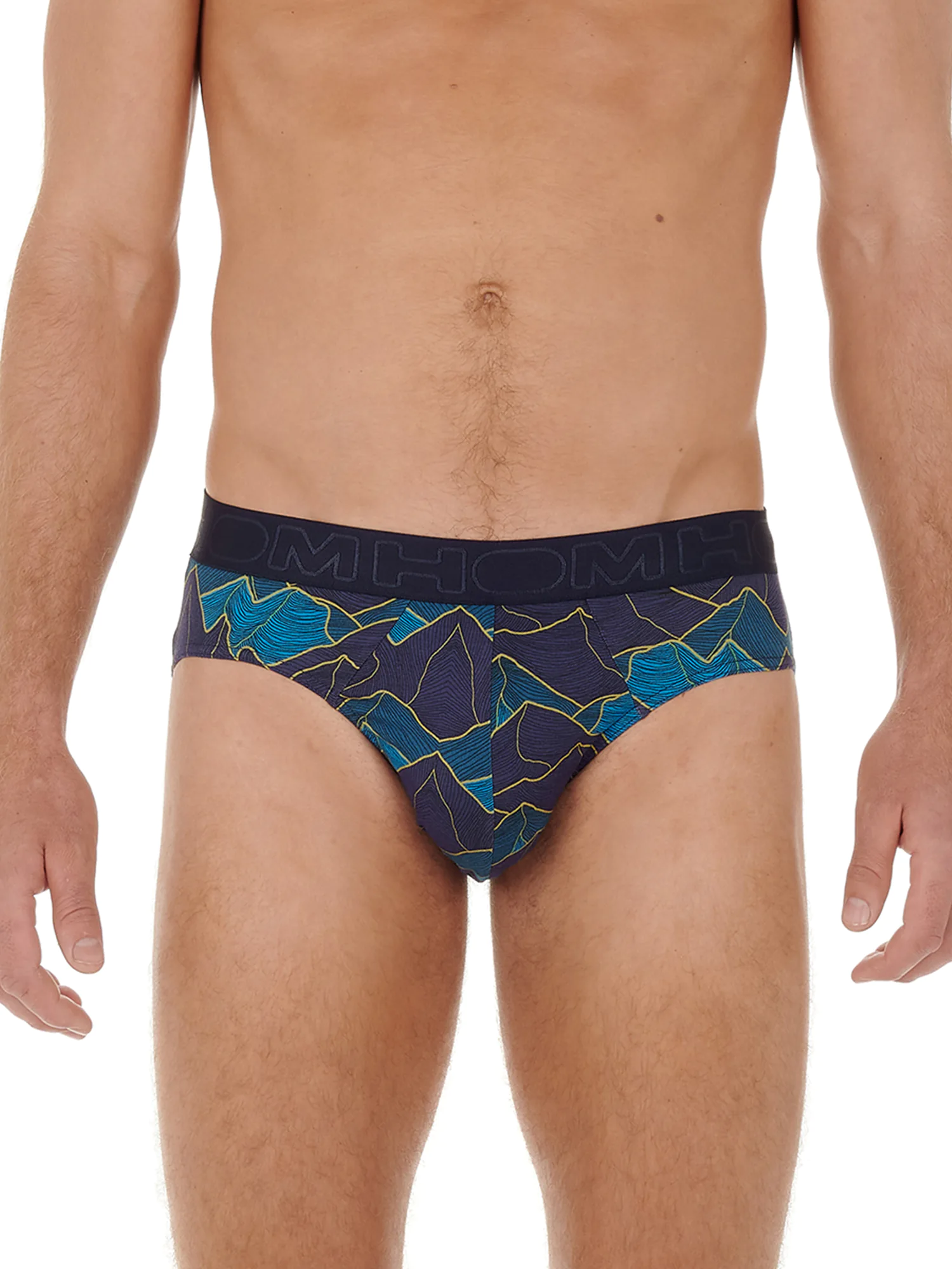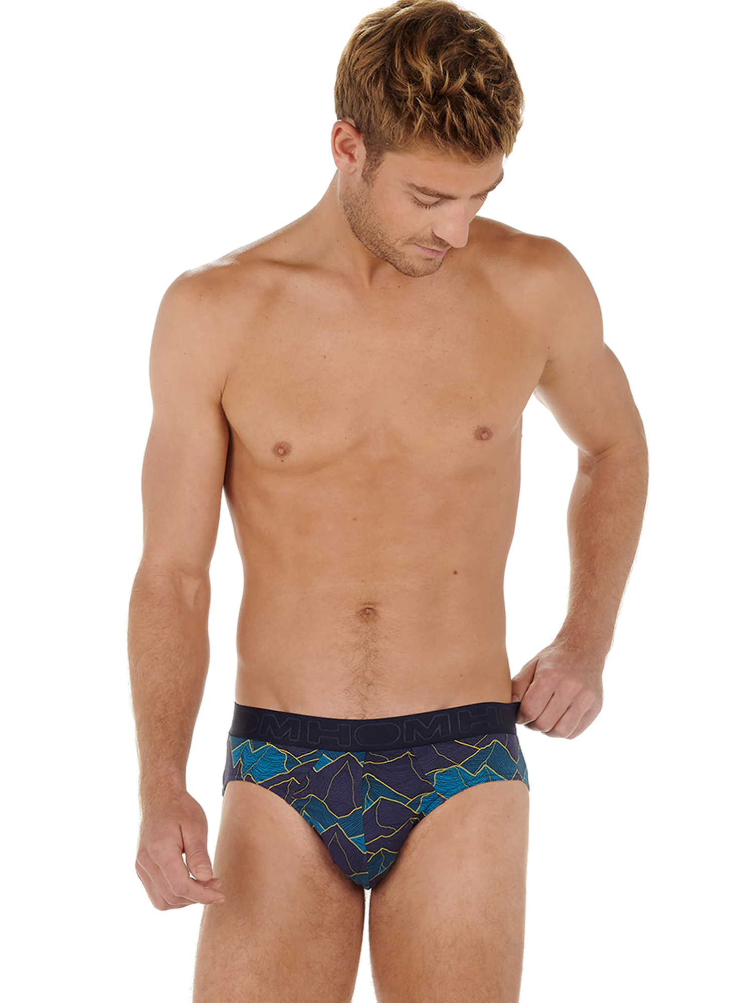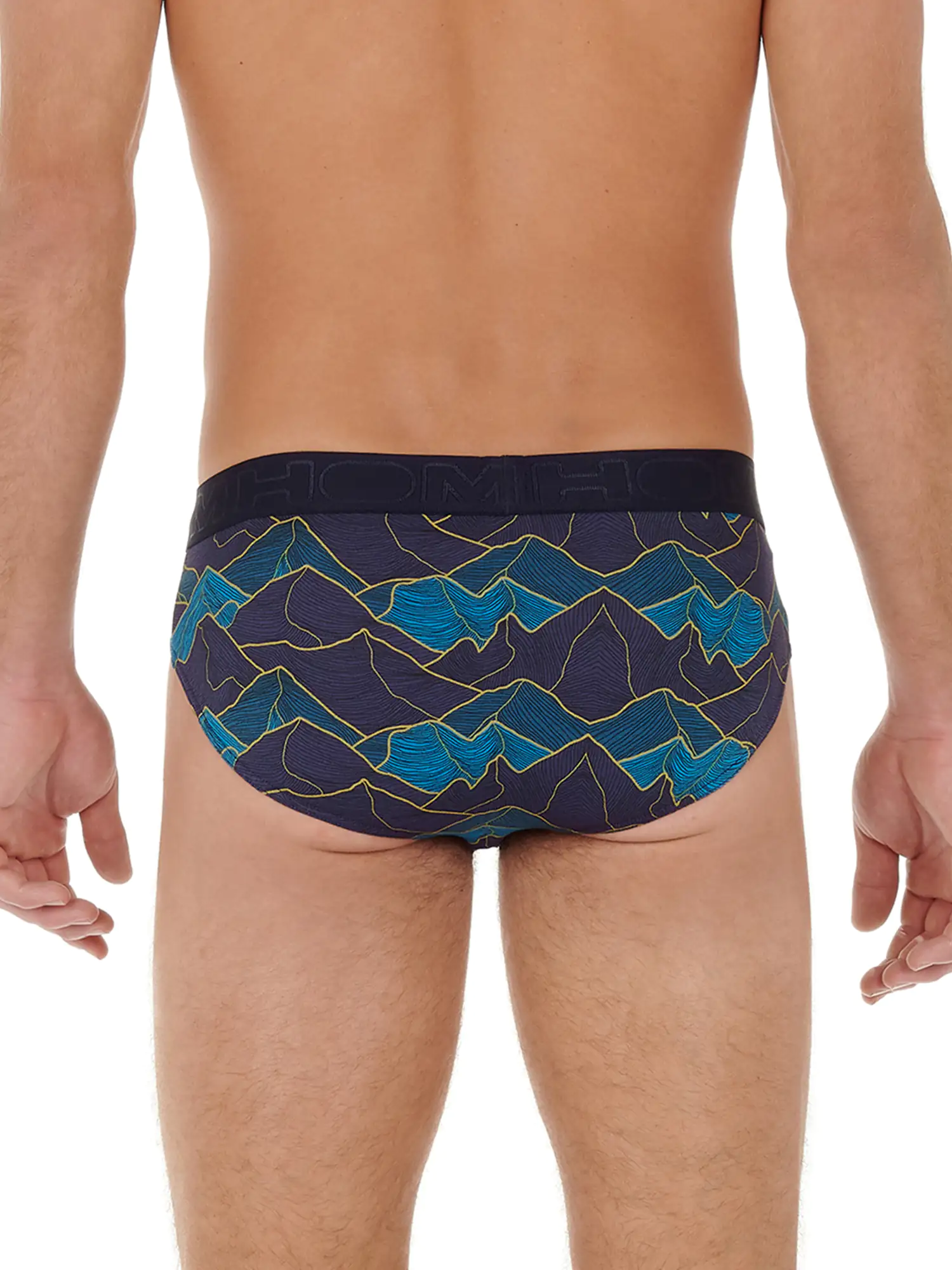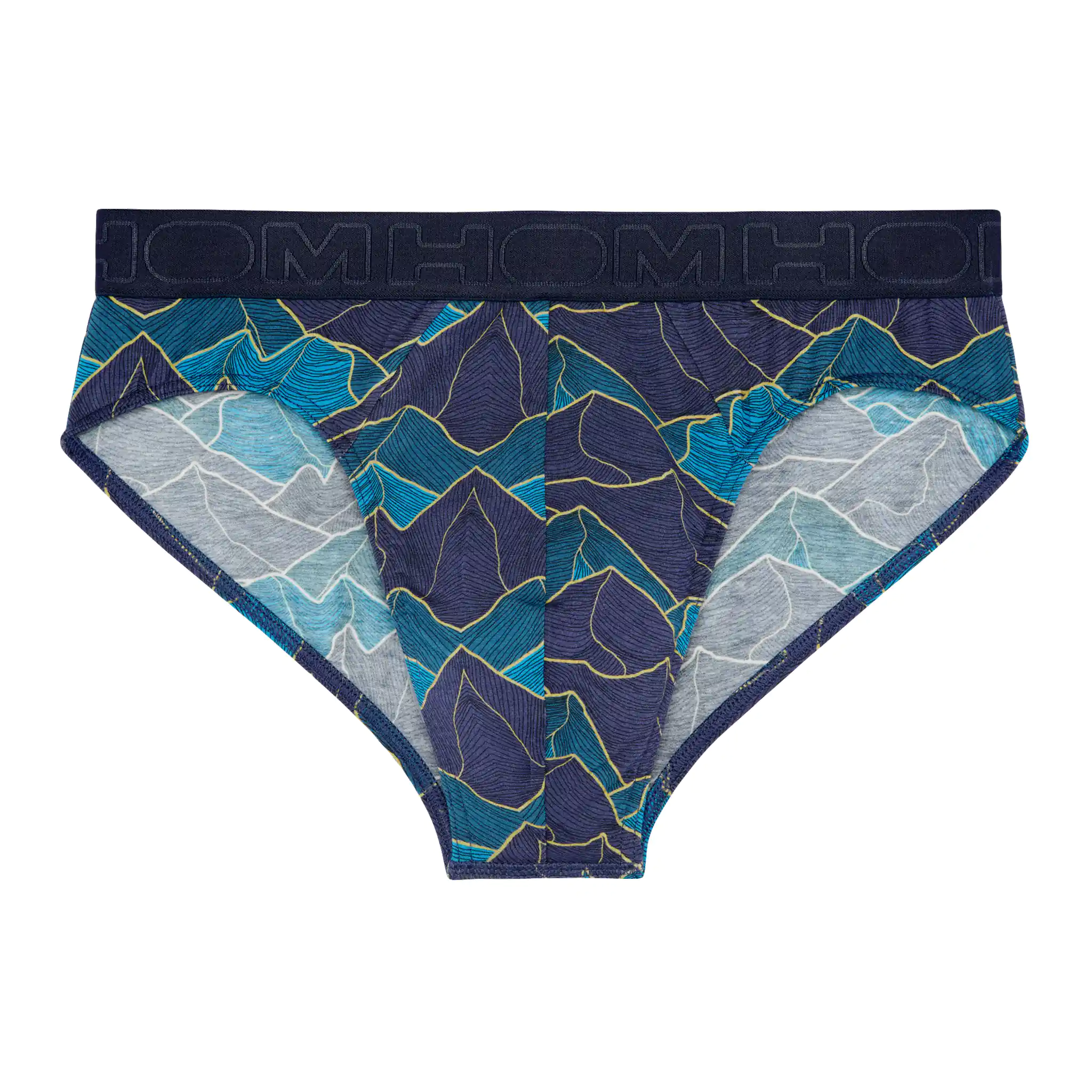 Der Lino Mini Brief ist aus einer bequemen Baumwoll-Modal-Mischung gefertigt und zeigt einen auffälligen Landschaftsdruck mit Bergen in Blautönen auf marineblauem Hintergrund. Das Baumwoll-Modal-Gemisch fühlt sich weich an und liegt gut am Körper an. Darüber hinaus hat Baumwolle-Modal gute saugfähige und atmungsaktive Eigenschaften, so dass die Wahrscheinlichkeit, dass Sie warme, klamme Stellen in Ihrer Unterwäsche bekommen, deutlich geringer ist. Da sowohl Baumwolle als auch Modal natürlichen Ursprungs sind, eignet sich die Lino für jeden Mann, der gerne natürliche Stoffe trägt. Bei normalem Gebrauch ist der Stoff schrumpf- und abriebfest. Der Herrenslip hat einen breiten Bund mit dem HOM-Logo in Ton-in-Ton.