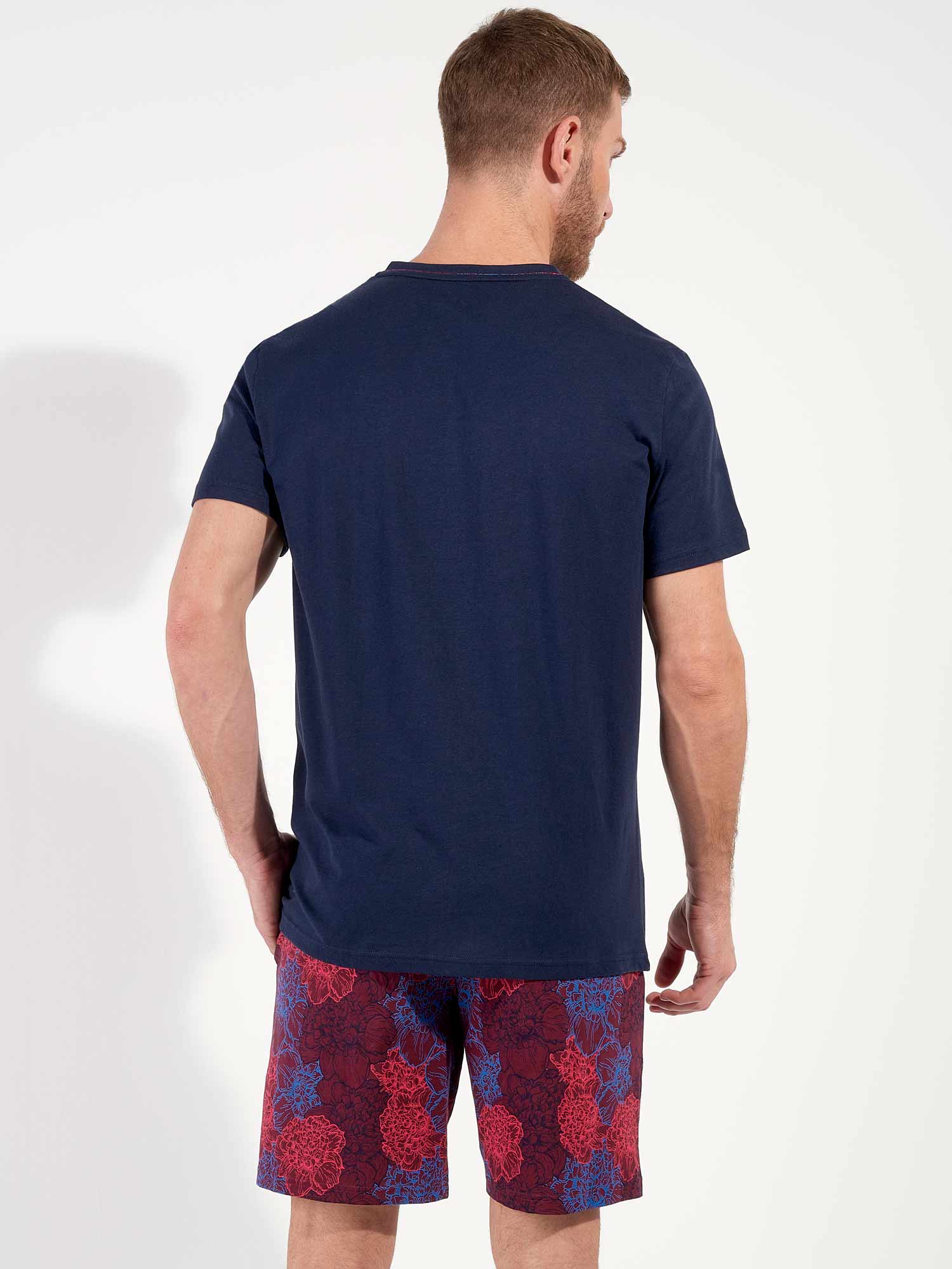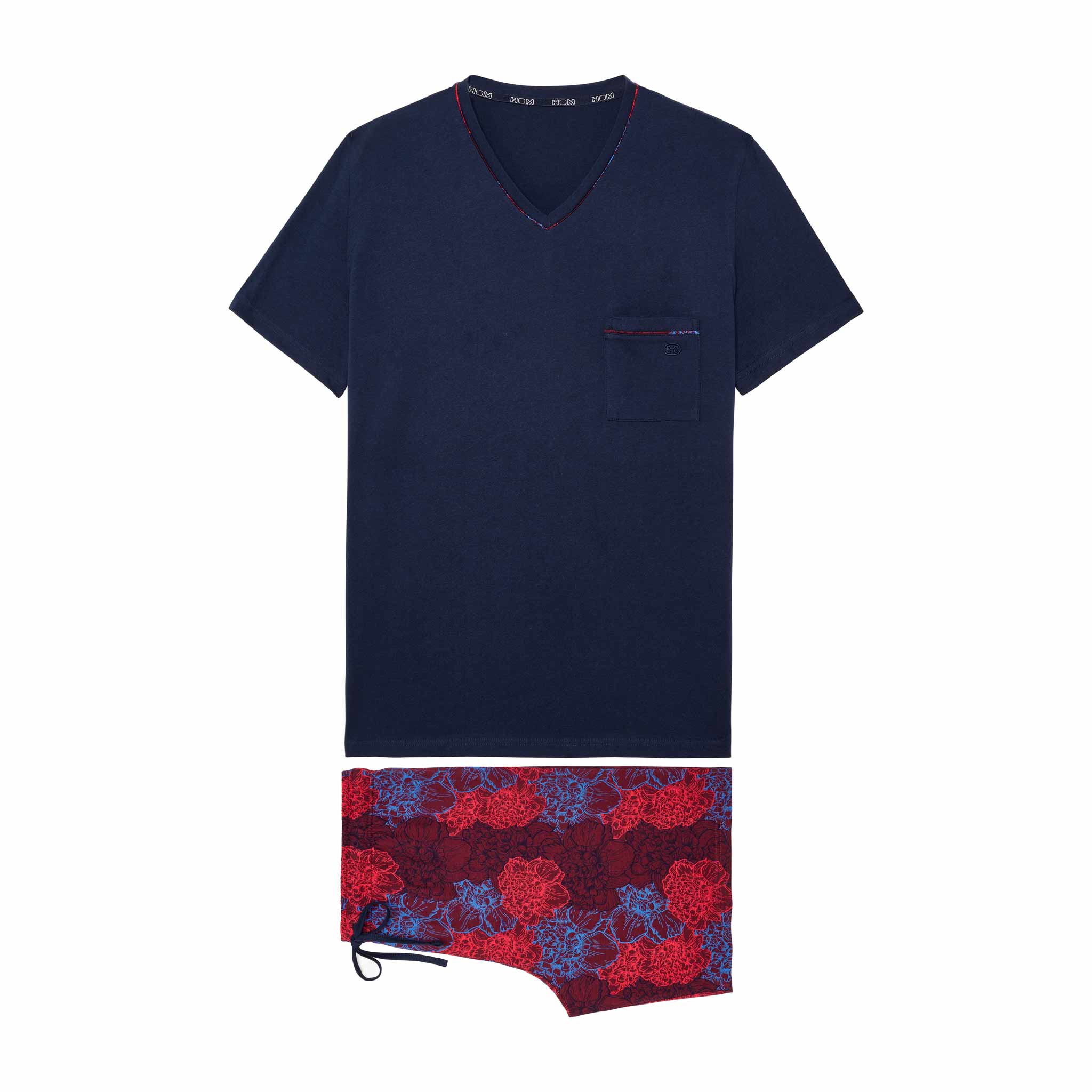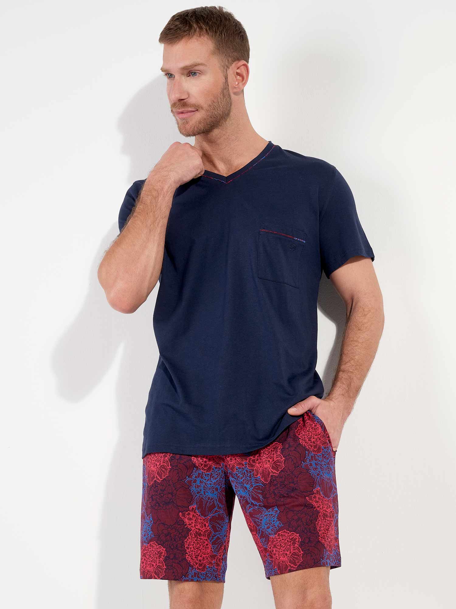 Der Bouquet Shortama verbindet verspielte Details mit stilvollem Komfort. Gefertigt aus 100 % Baumwolle, ist er angenehm weich zur Haut – ideal für Männer, die auch in der Übergangszeit oder in gut beheizten Räumen leichte Nachtwäsche bevorzugen. Das dunkelblaue Shirt hat einen eleganten V-Ausschnitt mit floraler Paspel und eine passende Brusttasche. Die bordeauxrote Shorts mit auffälligem Blumenmuster in Blau und Rot rundet den Look ab. Ein charakterstarker Pyjama für Männer mit Sinn für Stil und Wohlgefühl – das ganze Jahr über.