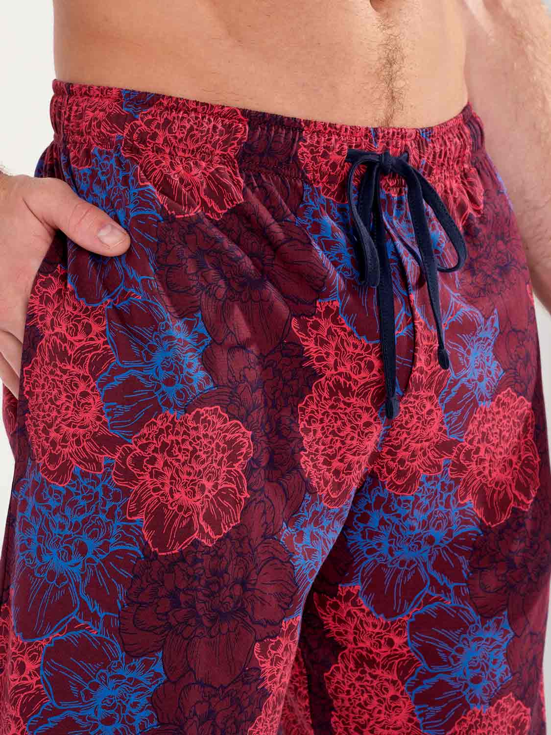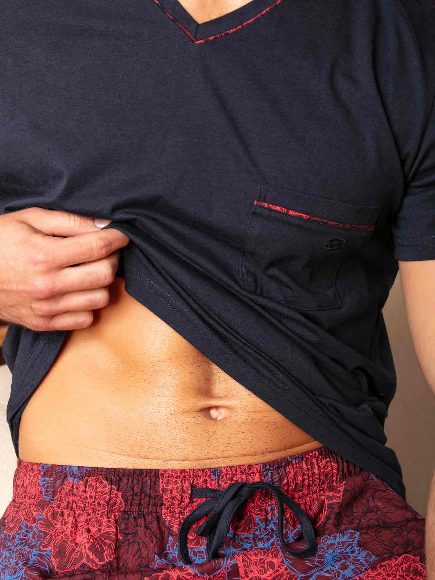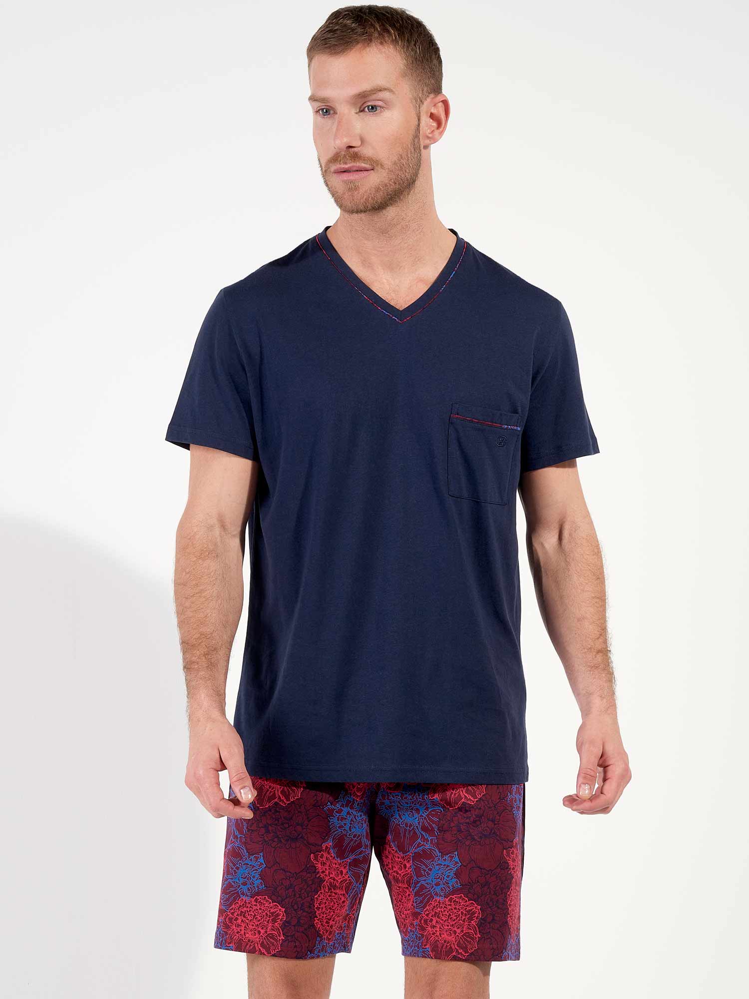 Der Bouquet Shortama verbindet verspielte Details mit stilvollem Komfort. Gefertigt aus 100 % Baumwolle, ist er angenehm weich zur Haut – ideal für Männer, die auch in der Übergangszeit oder in gut beheizten Räumen leichte Nachtwäsche bevorzugen. Das dunkelblaue Shirt hat einen eleganten V-Ausschnitt mit floraler Paspel und eine passende Brusttasche. Die bordeauxrote Shorts mit auffälligem Blumenmuster in Blau und Rot rundet den Look ab. Ein charakterstarker Pyjama für Männer mit Sinn für Stil und Wohlgefühl – das ganze Jahr über.