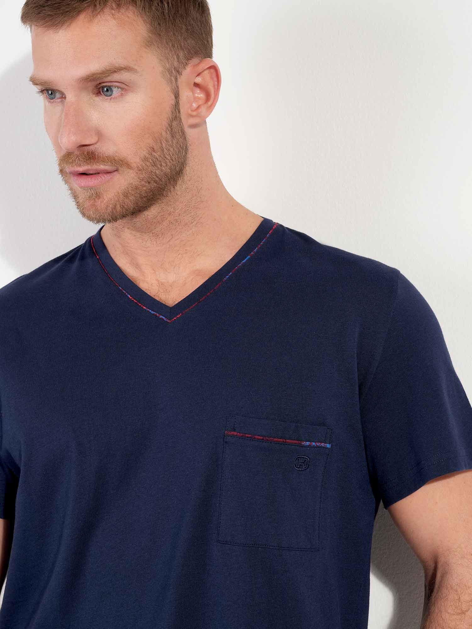 - Dunkelblaues T-Shirt mit Brusttasche und floraler Paspel