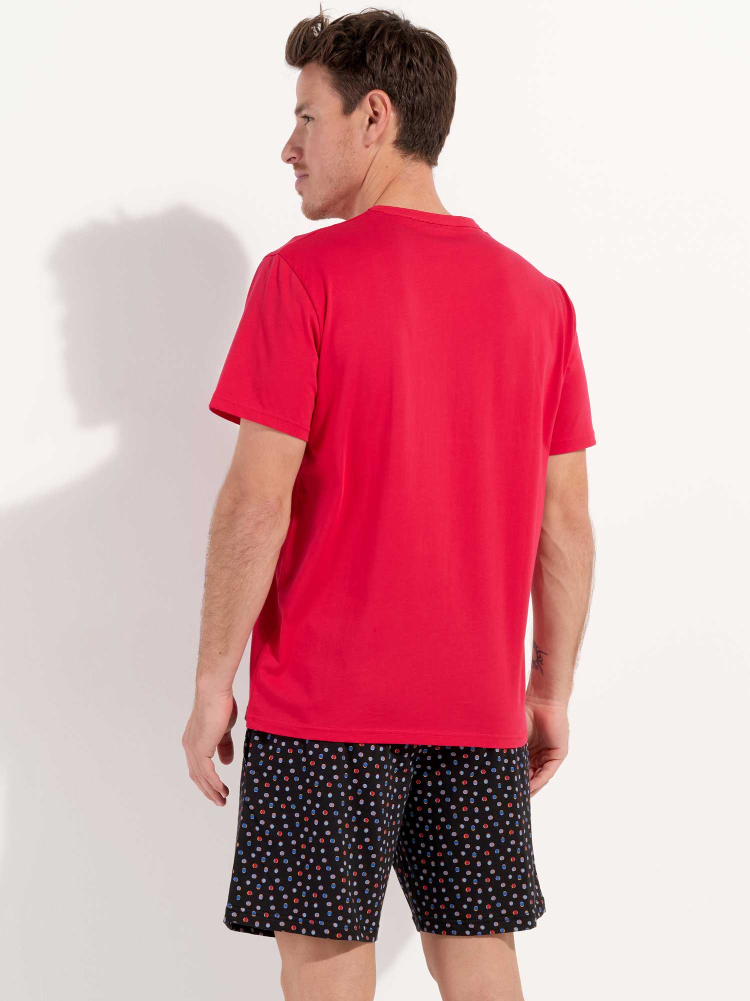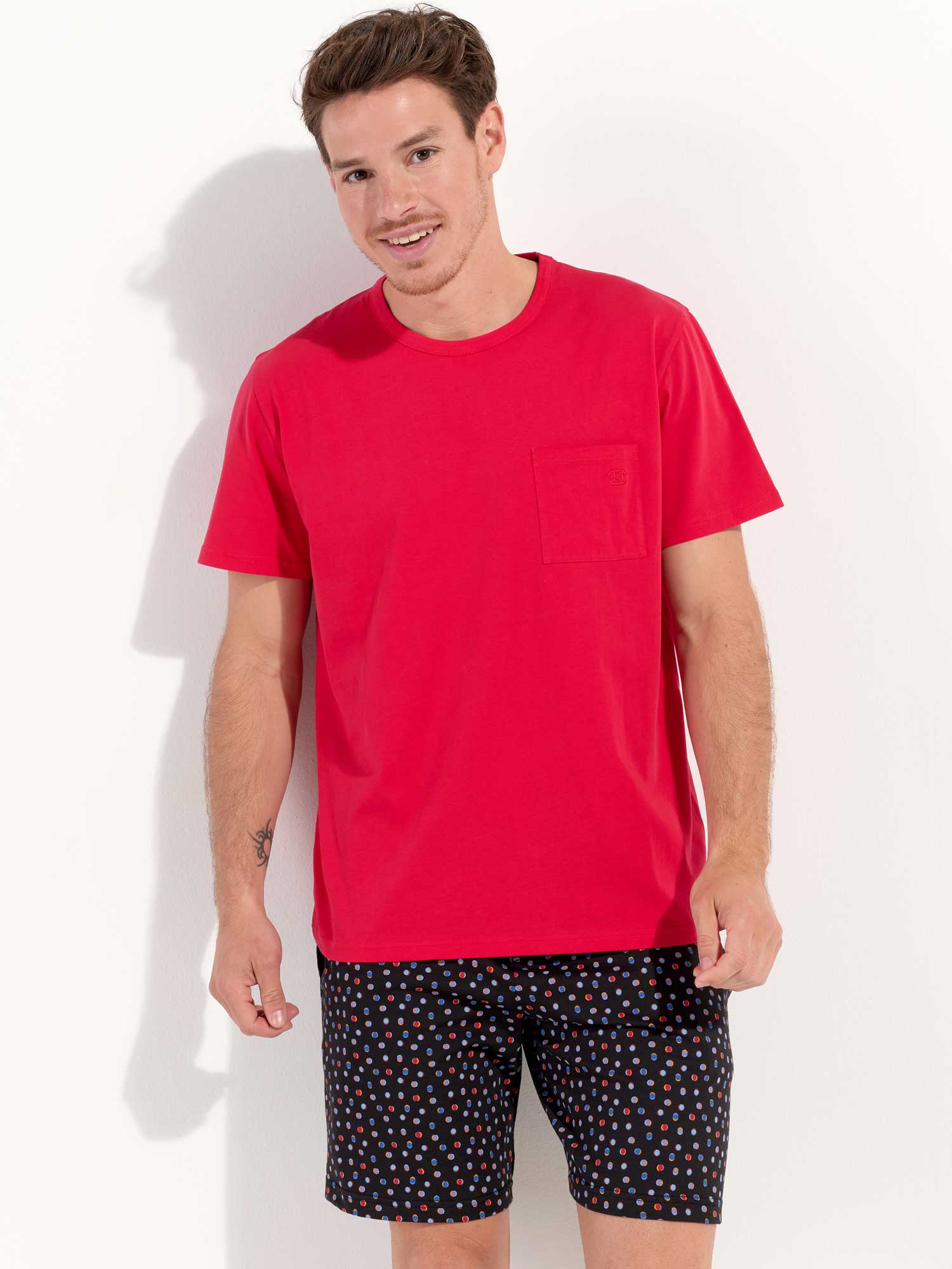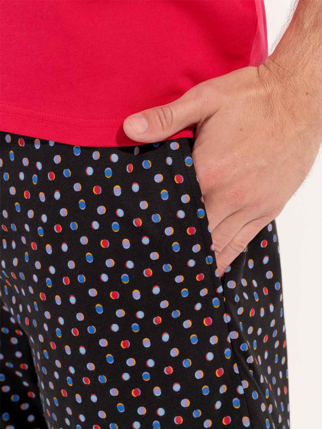 Das Charli - Shortama besteht aus 100% Baumwolle in Jersey-Qualität. Das Pyjama-Set enthält ein einfarbiges T-Shirt mit kurzen Ärmeln in Rot. Das Shirt hat einen runden Kragen. Die Shorts sind mit einem verspielten Punktmuster in verschiedenen Farben auf schwarzem Hintergrund gestaltet, das eine klassische Note verleiht. Die Pyjama-Shorts haben Seitentaschen auf der linken und rechten Seite und verfügen über einen Kordelzug im Bund für eine perfekte Passform.
