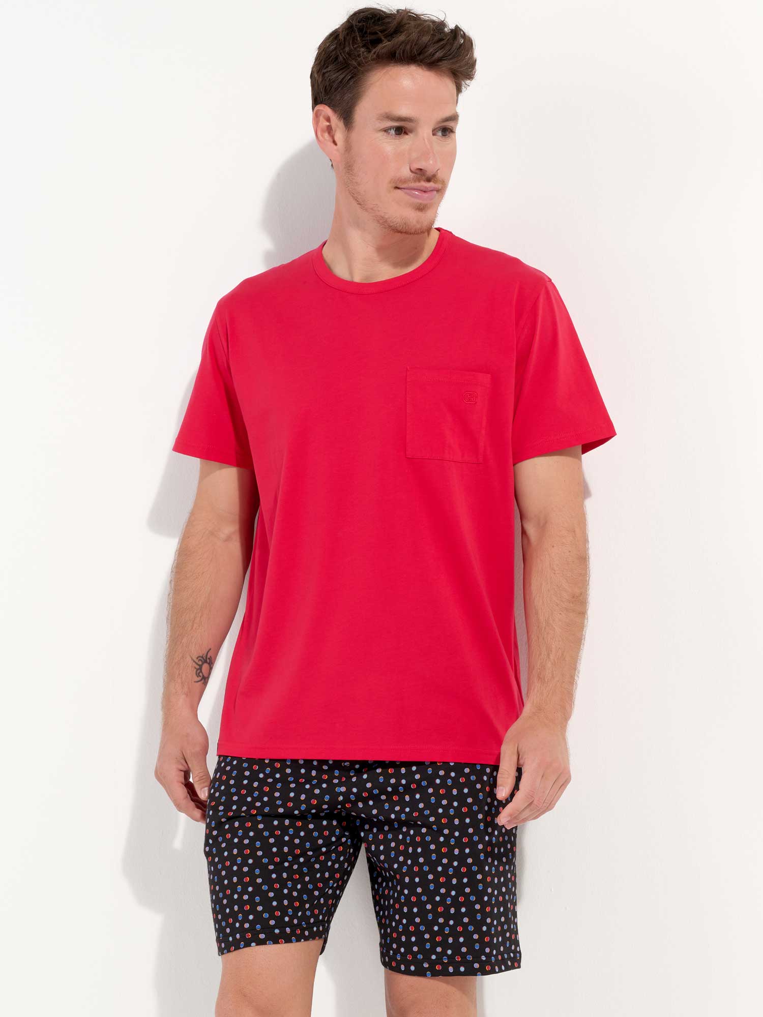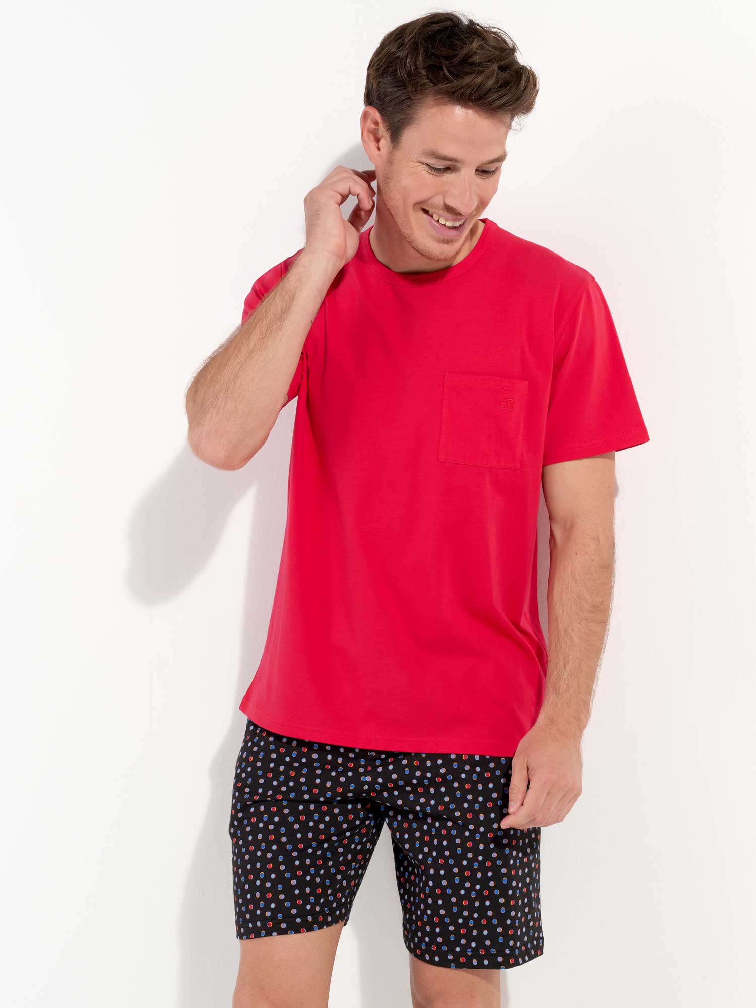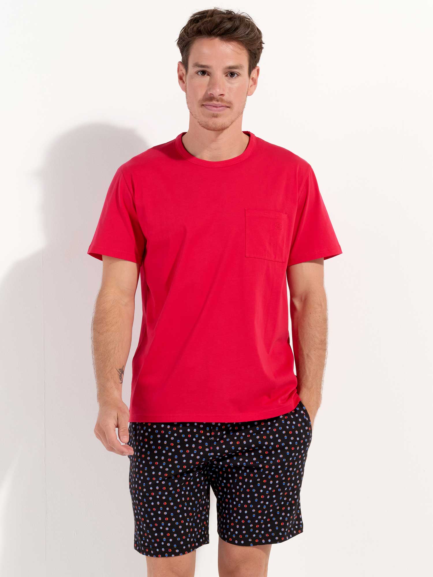Das Charli - Shortama besteht aus 100% Baumwolle in Jersey-Qualität. Das Pyjama-Set enthält ein einfarbiges T-Shirt mit kurzen Ärmeln in Rot. Das Shirt hat einen runden Kragen. Die Shorts sind mit einem verspielten Punktmuster in verschiedenen Farben auf schwarzem Hintergrund gestaltet, das eine klassische Note verleiht. Die Pyjama-Shorts haben Seitentaschen auf der linken und rechten Seite und verfügen über einen Kordelzug im Bund für eine perfekte Passform.