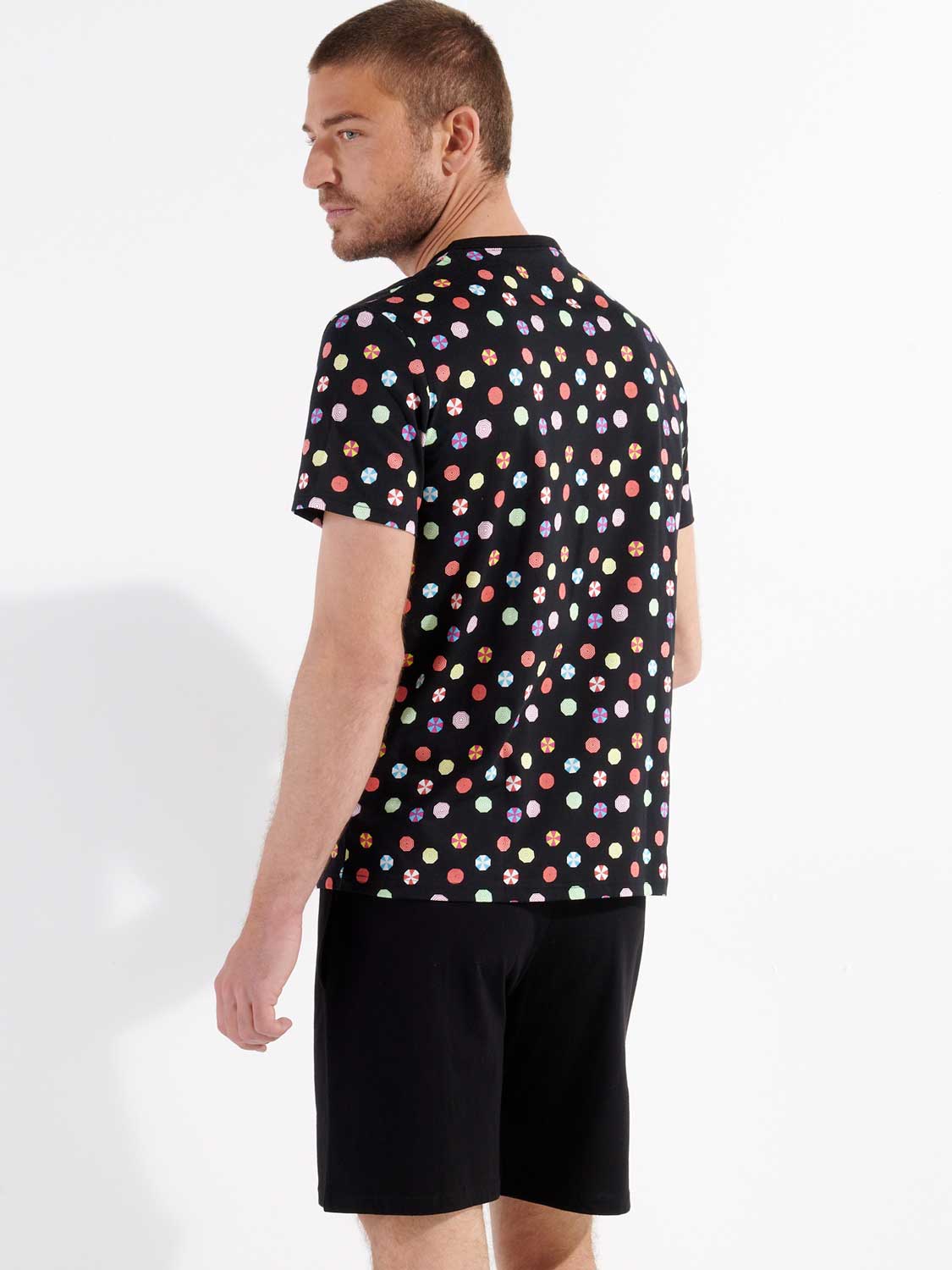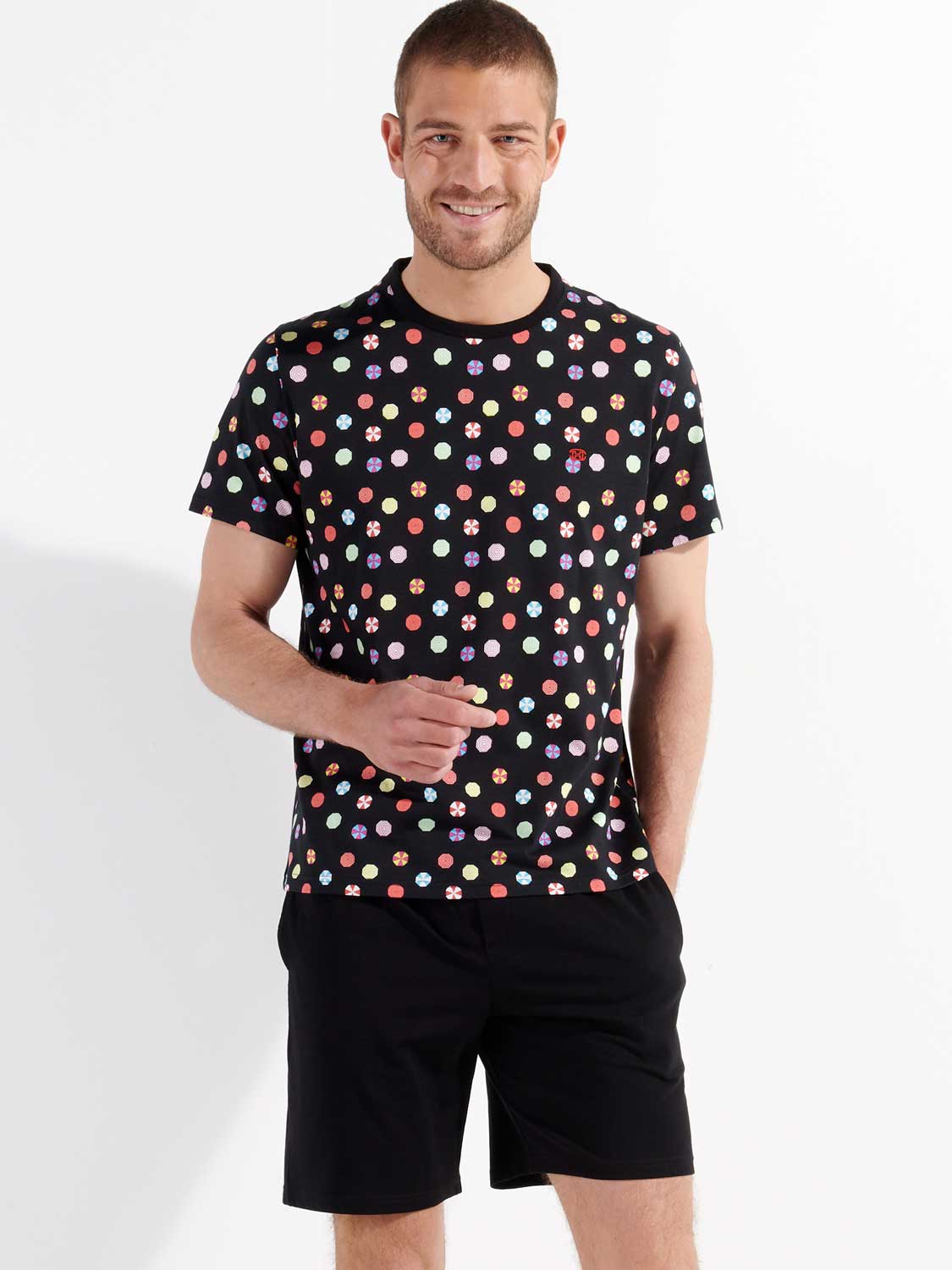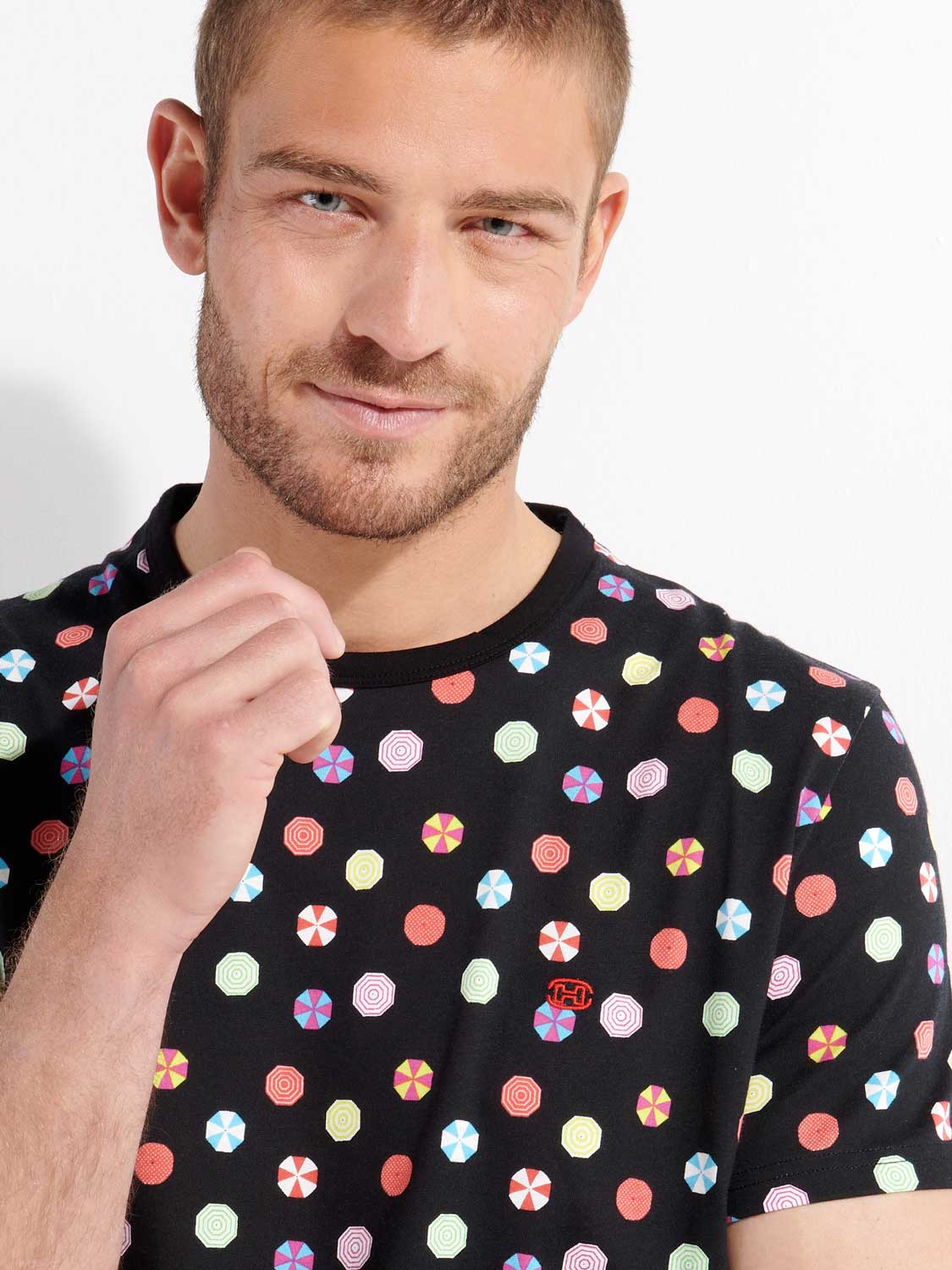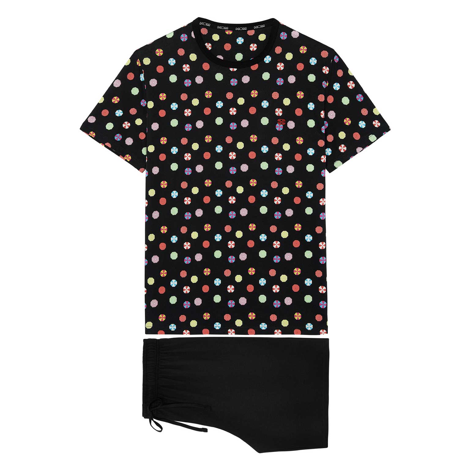 Die Fabian - Short Sleepwear ist aus 100 % Baumwolle in einer Jersey-Ausführung gefertigt. Diese kurze Nachtwäsche besteht aus einem T-Shirt mit einem verspielten, bunten Aufdruck mit Sonnenschirmen auf schwarzem Hintergrund. Das Shirt hat kurze Ärmel und einen Rundhalsausschnitt mit HOM-Band an der Innenseite des Ausschnitts. Die Shorts sind in schlichtem Schwarz gehalten und haben Seitentaschen am linken und rechten Saum. Der Bund ist mit einem Kordelzug versehen, so dass die Shorts perfekt geschnitten sind.
