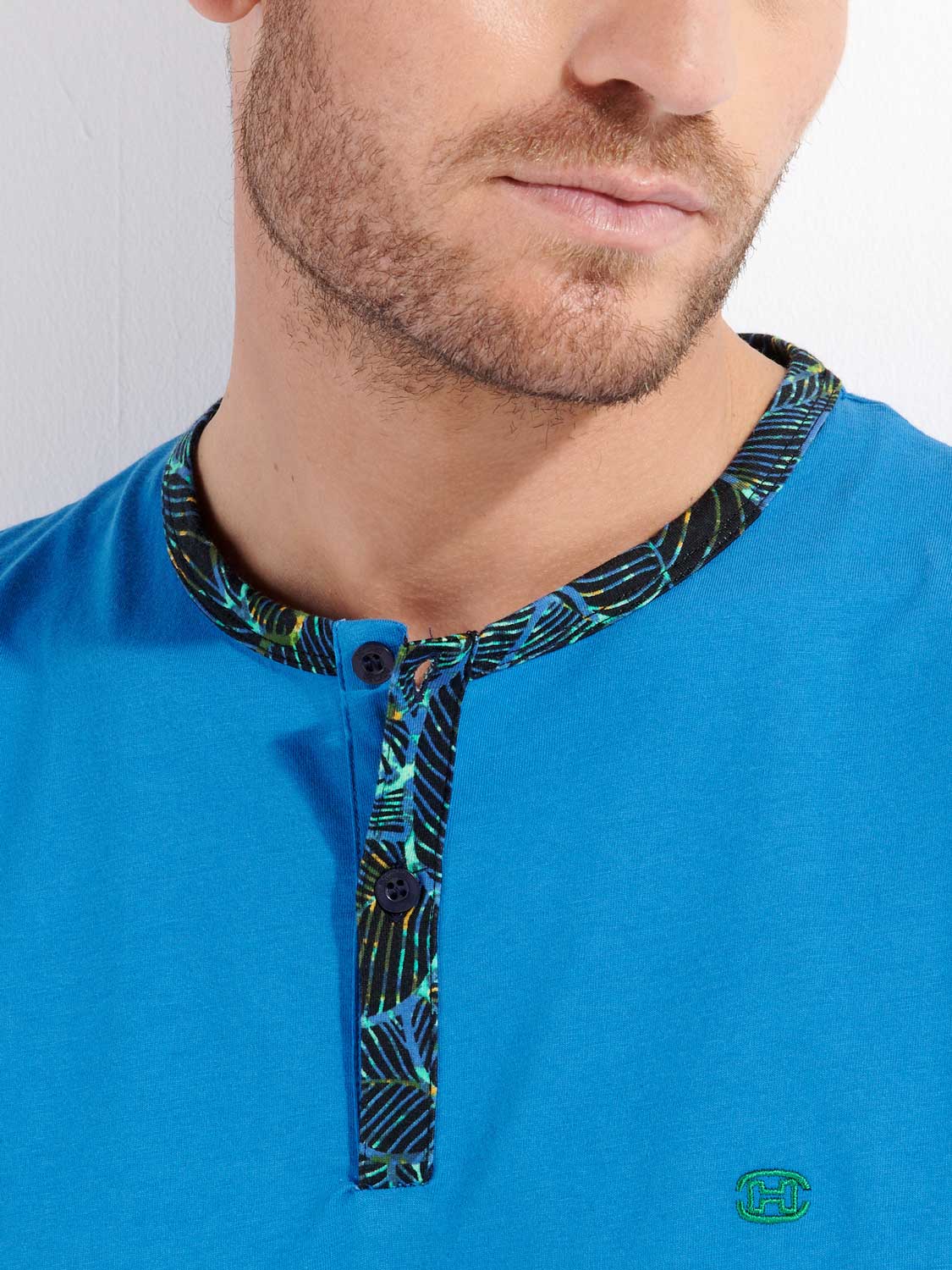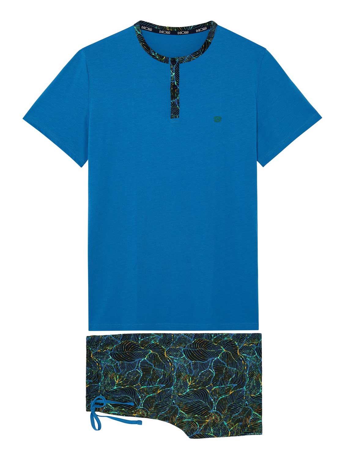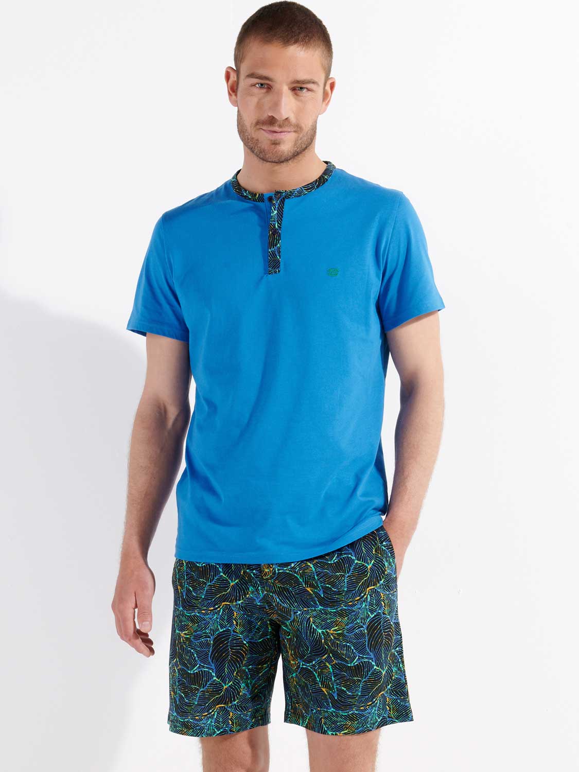 Die Jarrod - Short Sleepwear ist aus 100 % Baumwolle in einer Jersey-Ausführung gefertigt. Die kurze Nachtwäsche besteht aus einem unifarbenen, kurzärmeligen T-Shirt mit Rundkragen und Knöpfen sowie einer bedruckten Shorts. Das Shirt ist in der Farbe Blau gehalten und mit dem HOM-Logo vorne links auf der Brust bestickt. Die Shorts haben links und rechts Seitentaschen im Saum und sind mit einem Kordelzug versehen, der für einen perfekten Sitz sorgt. Der Druck zeigt die Vegetation in leuchtenden Kontrastfarben auf schwarzem Grund.