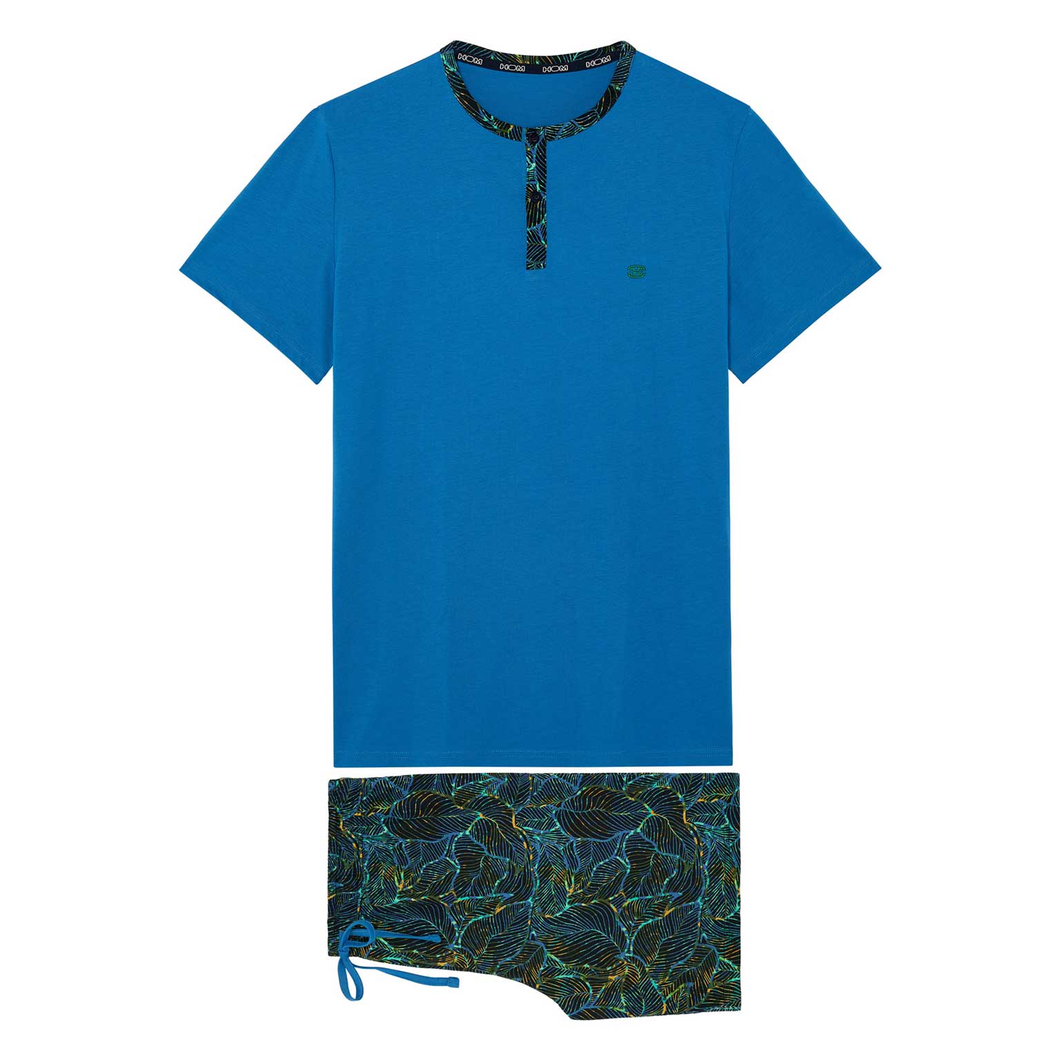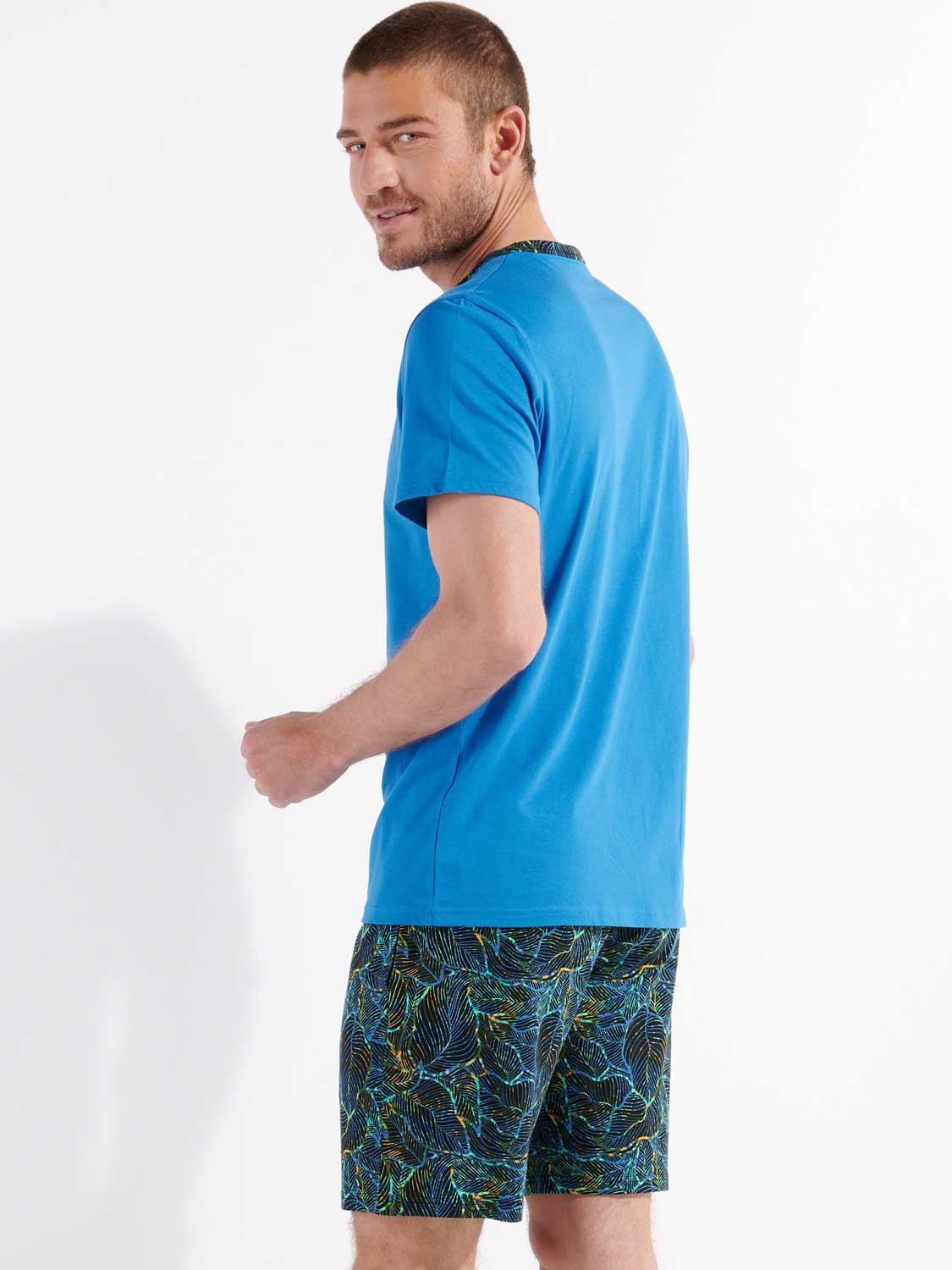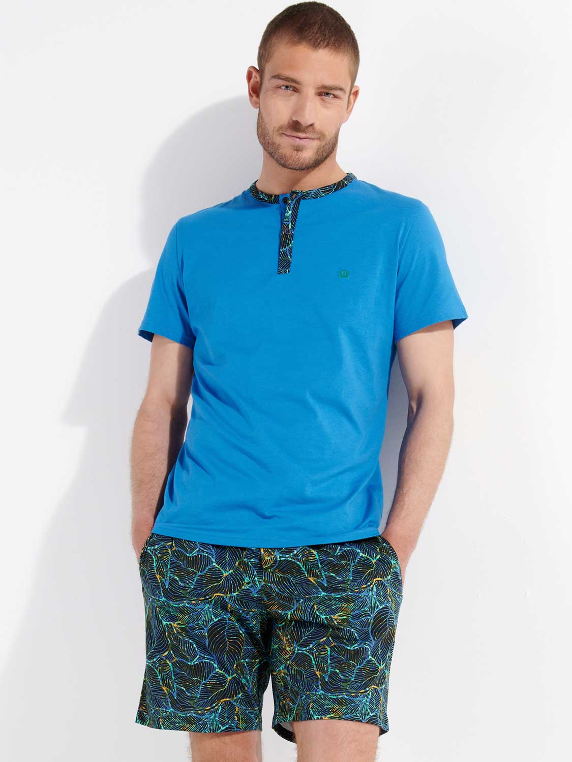 Die Jarrod - Short Sleepwear ist aus 100 % Baumwolle in einer Jersey-Ausführung gefertigt. Die kurze Nachtwäsche besteht aus einem unifarbenen, kurzärmeligen T-Shirt mit Rundkragen und Knöpfen sowie einer bedruckten Shorts. Das Shirt ist in der Farbe Blau gehalten und mit dem HOM-Logo vorne links auf der Brust bestickt. Die Shorts haben links und rechts Seitentaschen im Saum und sind mit einem Kordelzug versehen, der für einen perfekten Sitz sorgt. Der Druck zeigt die Vegetation in leuchtenden Kontrastfarben auf schwarzem Grund.