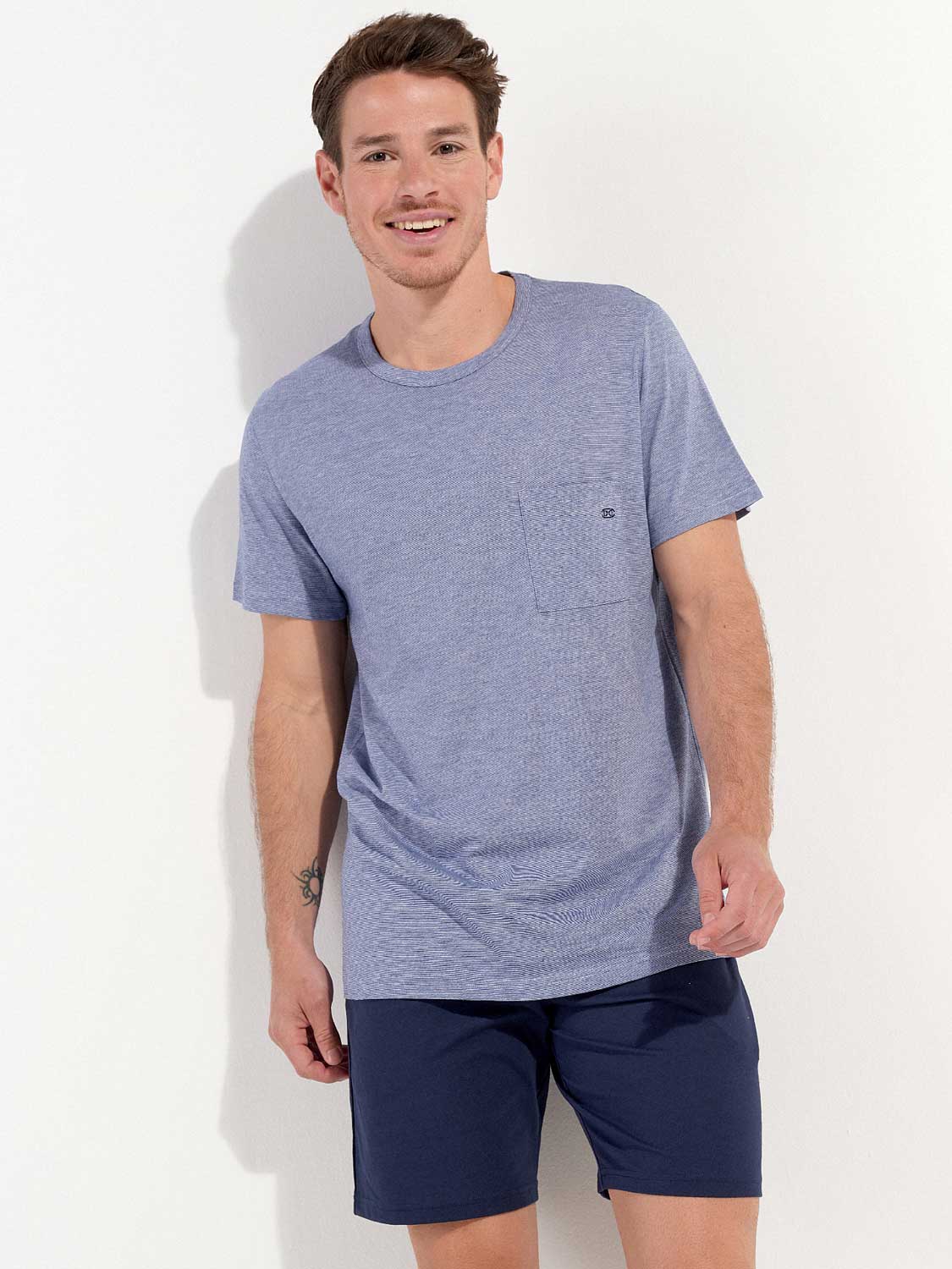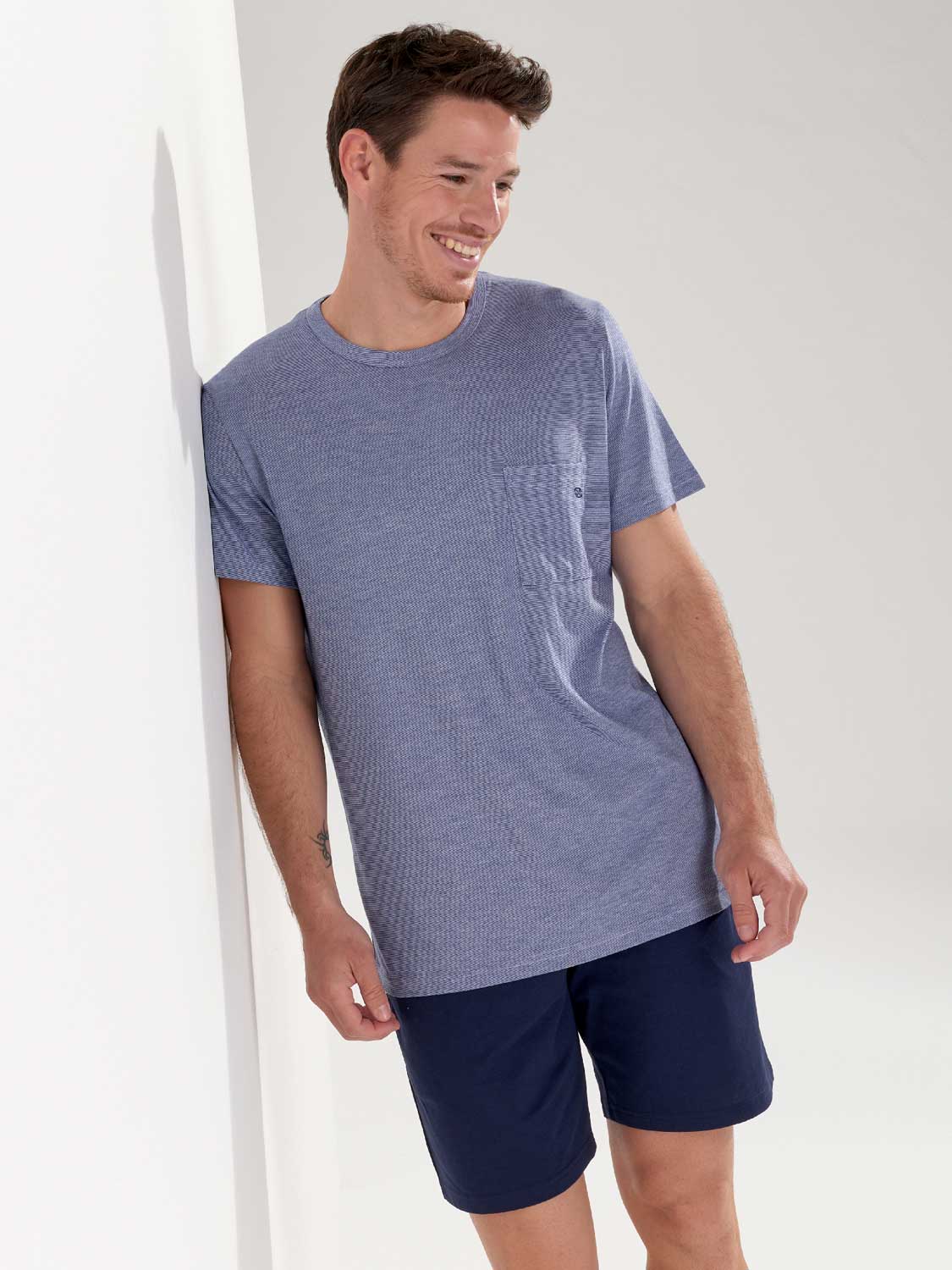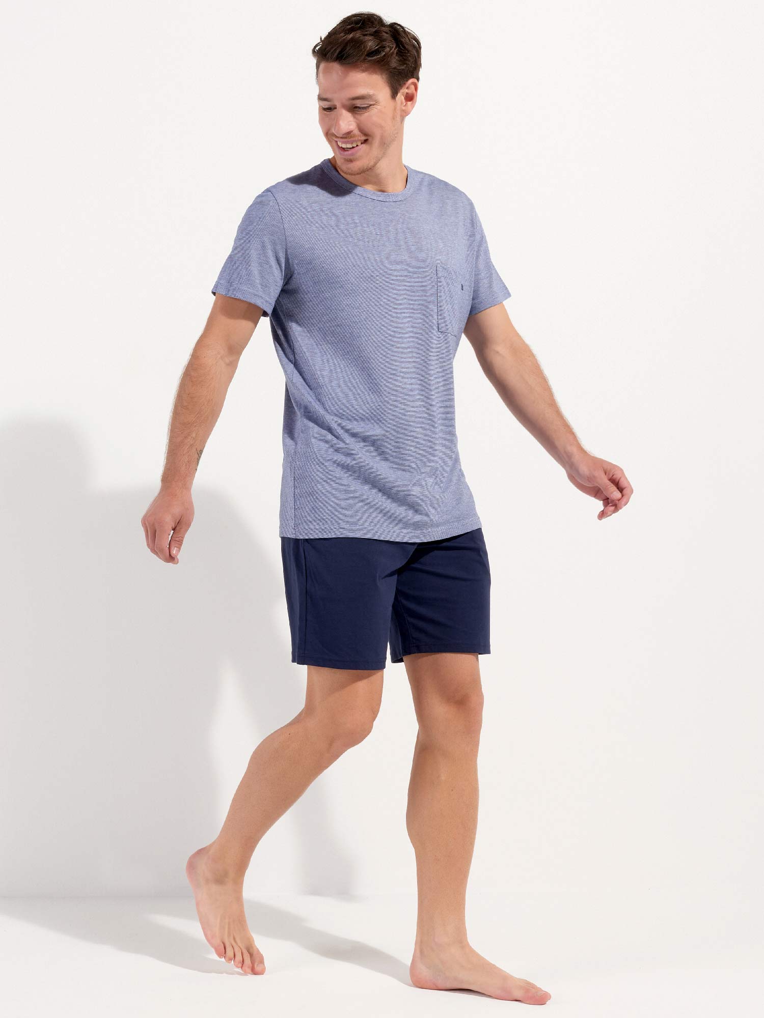 Das Modal Comfort - Shortama, wie der Name schon sagt, besteht aus Modal gemischt mit Baumwolle, wodurch der Schlafanzug besonders weich und angenehm am Körper anliegt. Der Schlafanzug besteht aus einem T-Shirt mit einer Brusttasche und kurzen Ärmeln in meliertem Blau mit Denim-Effekt. Die Shorts sind einfarbig mit Seitentaschen am Saum, links und rechts. Die Shorts haben einen Kordelzug, um die Passform perfekt anzupassen. Die Einfachheit verleiht diesem Schlafanzug einen zeitlosen, lässigen Look.