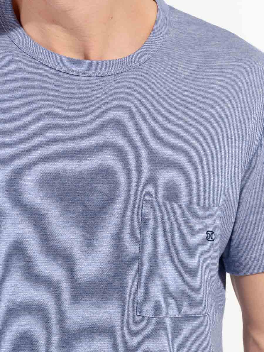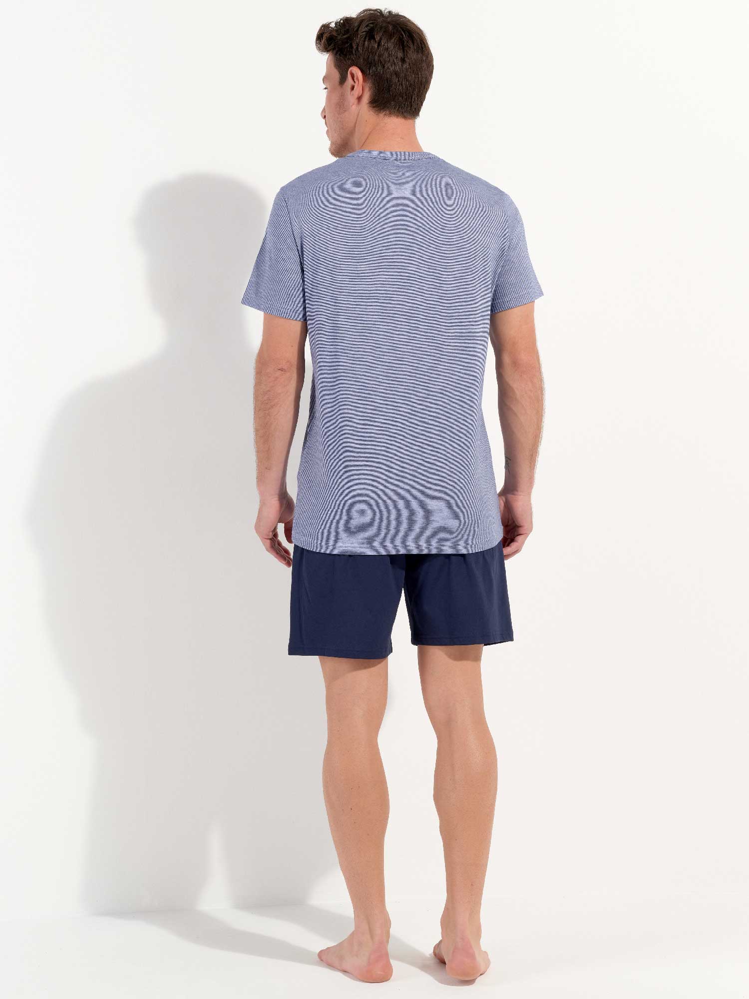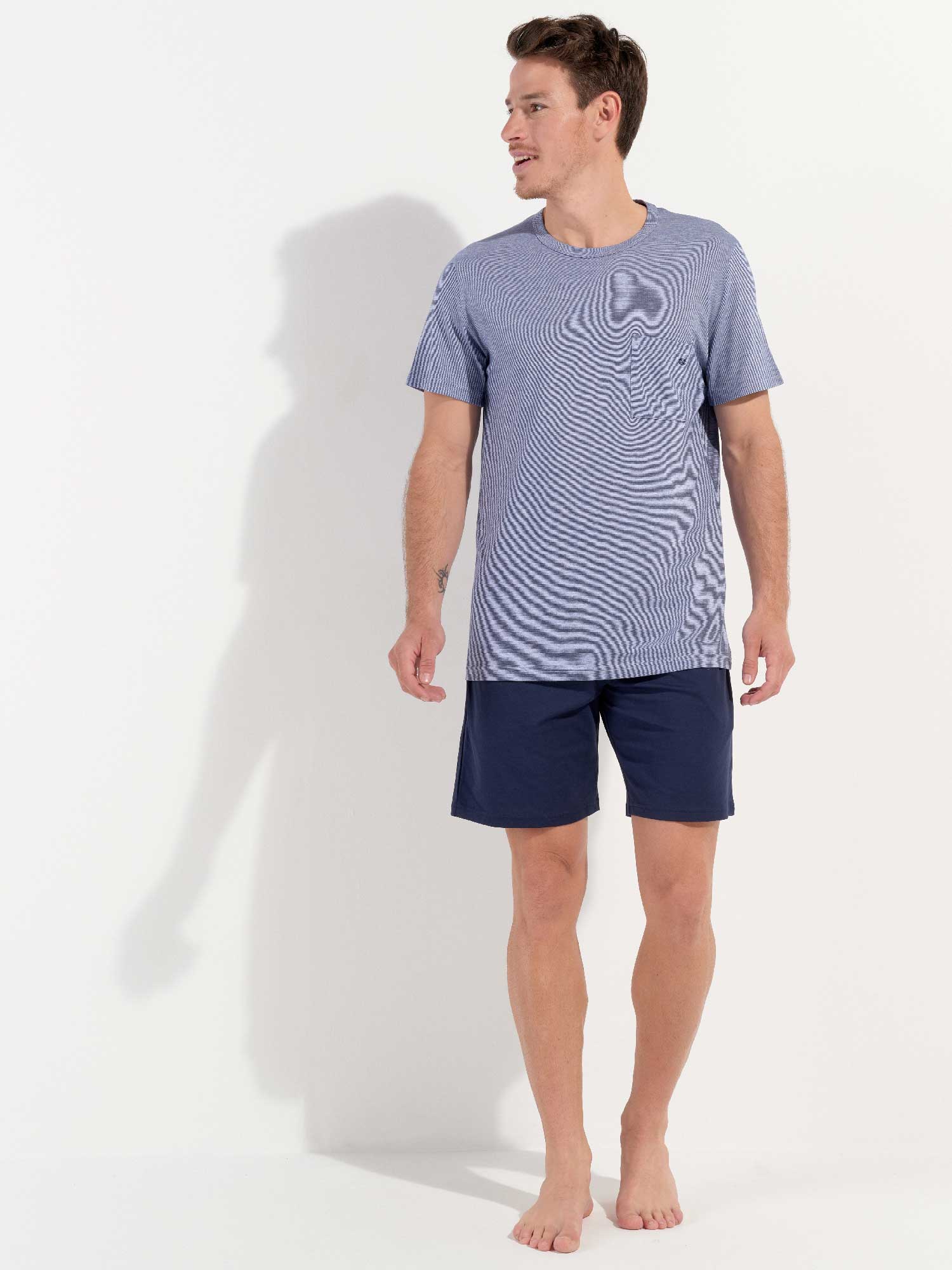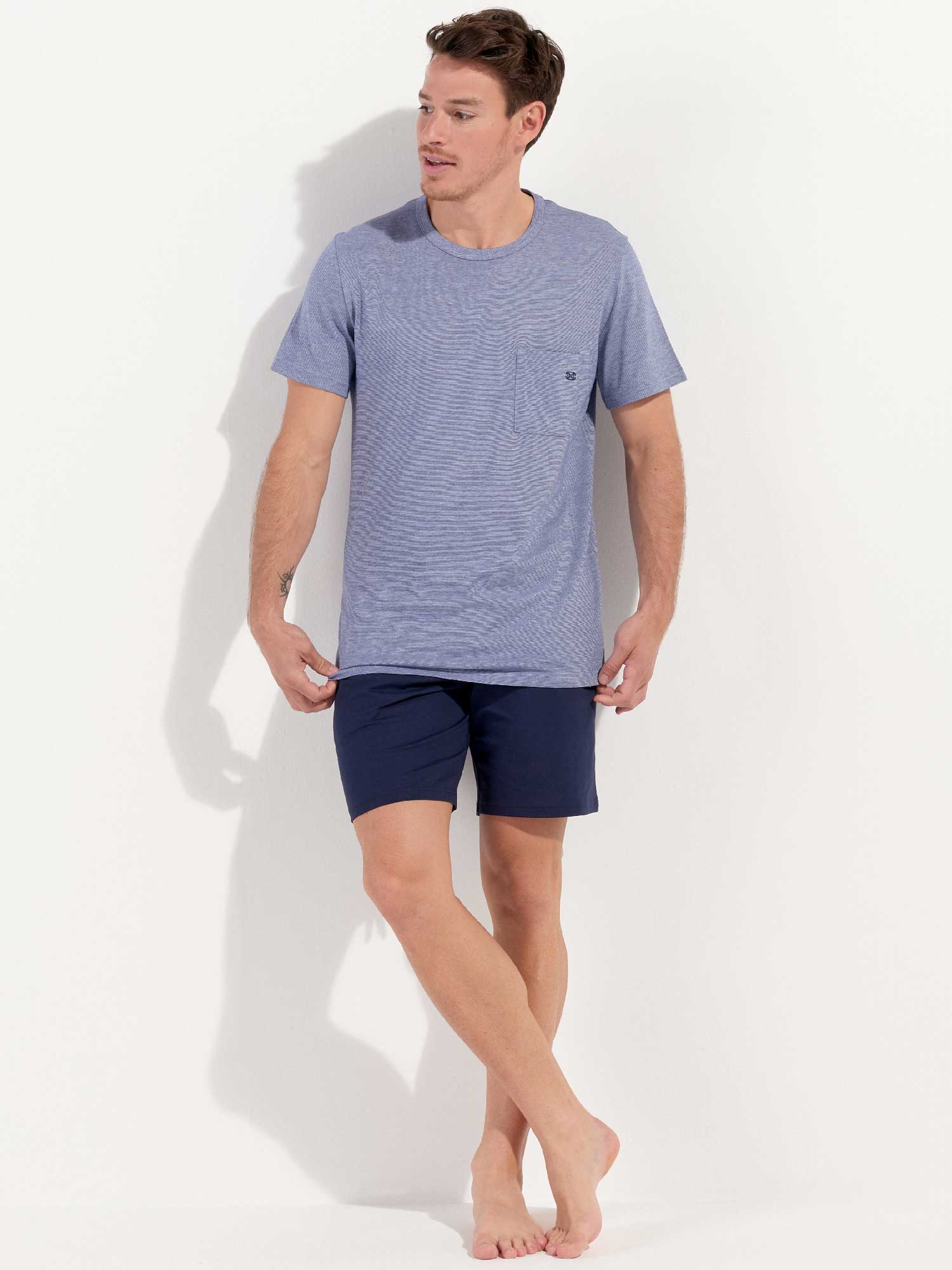 Das Modal Comfort - Shortama, wie der Name schon sagt, besteht aus Modal gemischt mit Baumwolle, wodurch der Schlafanzug besonders weich und angenehm am Körper anliegt. Der Schlafanzug besteht aus einem T-Shirt mit einer Brusttasche und kurzen Ärmeln in meliertem Blau mit Denim-Effekt. Die Shorts sind einfarbig mit Seitentaschen am Saum, links und rechts. Die Shorts haben einen Kordelzug, um die Passform perfekt anzupassen. Die Einfachheit verleiht diesem Schlafanzug einen zeitlosen, lässigen Look.
