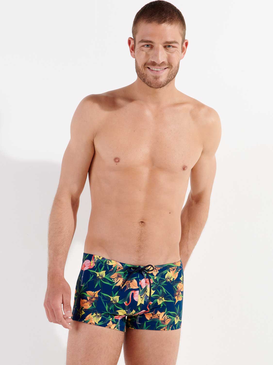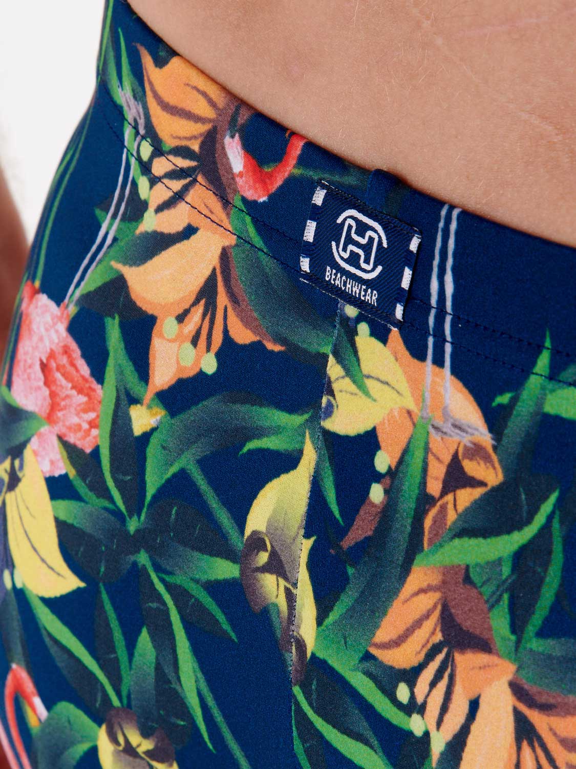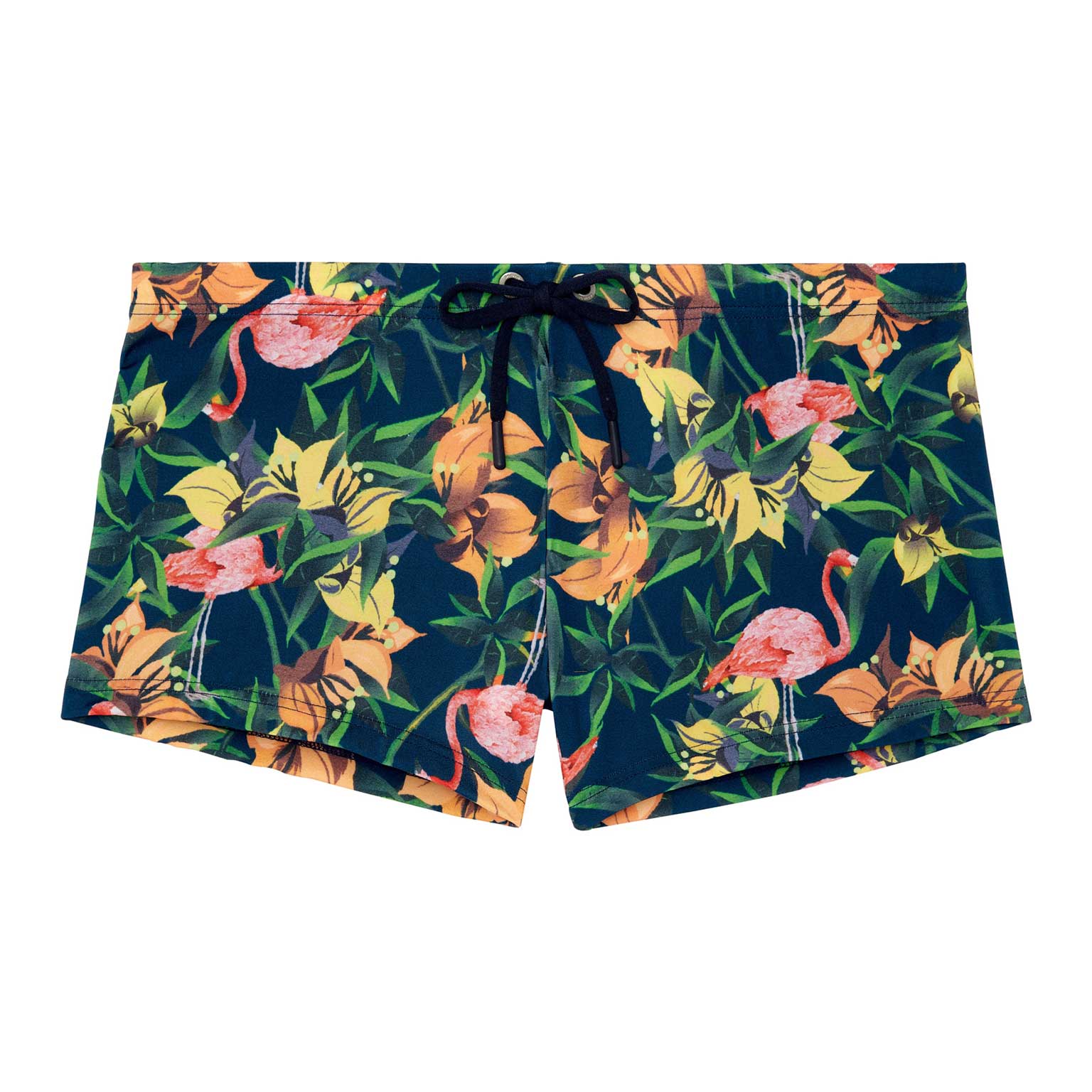 Die Flamingo - Badeshorts mit schönem Tropenlook durch den farbenfrohen Druck mit rosa Flamingos auf einem Hintergrund aus gelben und orangenen Blumen. Der Stoff ist elastisch, liegt gut auf der Haut und scheint nicht durch. Mit dem Kordelzug im Bund können Sie die Badeshorts an Ihre Größe anpassen. Dieser tropische Modeartikel wird Ihnen ein Urlaubsgefühl vermitteln.