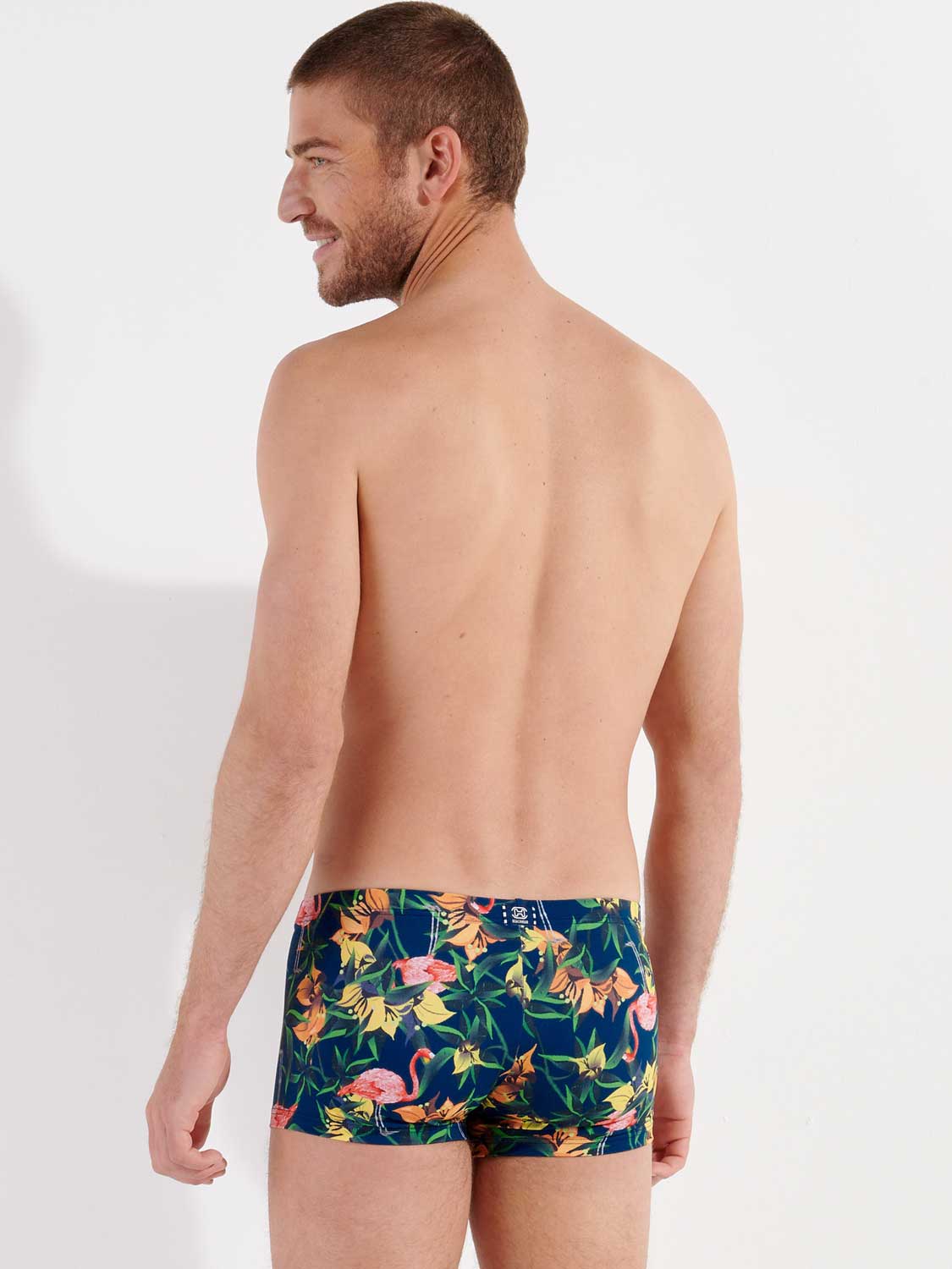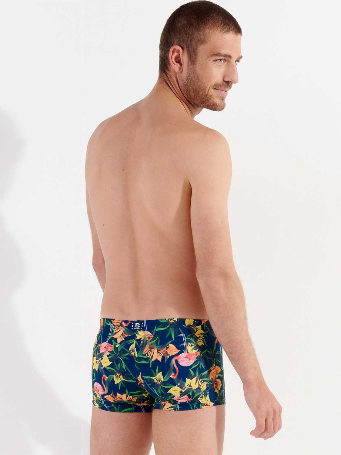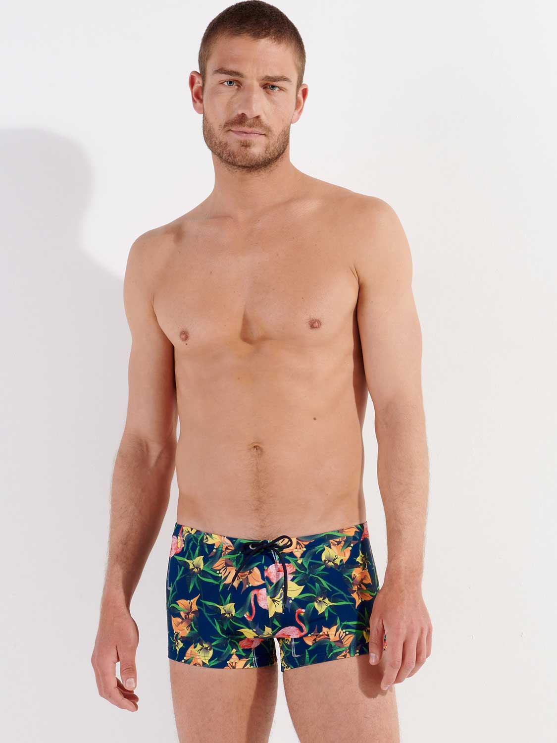 Die Flamingo - Badeshorts mit schönem Tropenlook durch den farbenfrohen Druck mit rosa Flamingos auf einem Hintergrund aus gelben und orangenen Blumen. Der Stoff ist elastisch, liegt gut auf der Haut und scheint nicht durch. Mit dem Kordelzug im Bund können Sie die Badeshorts an Ihre Größe anpassen. Dieser tropische Modeartikel wird Ihnen ein Urlaubsgefühl vermitteln.