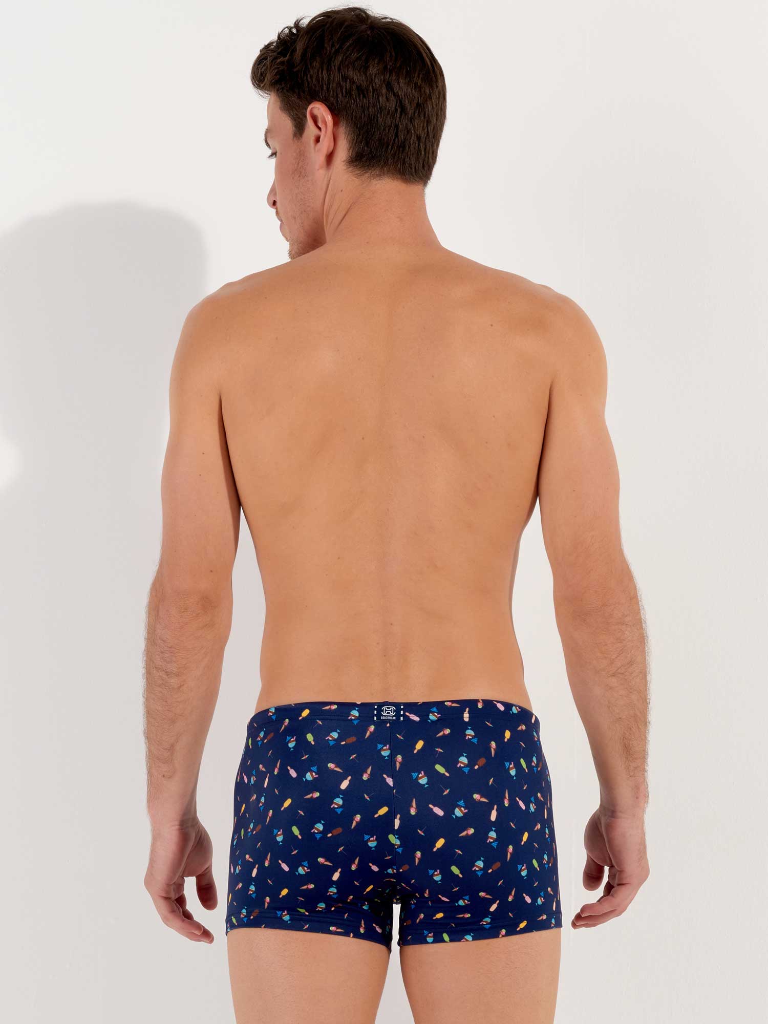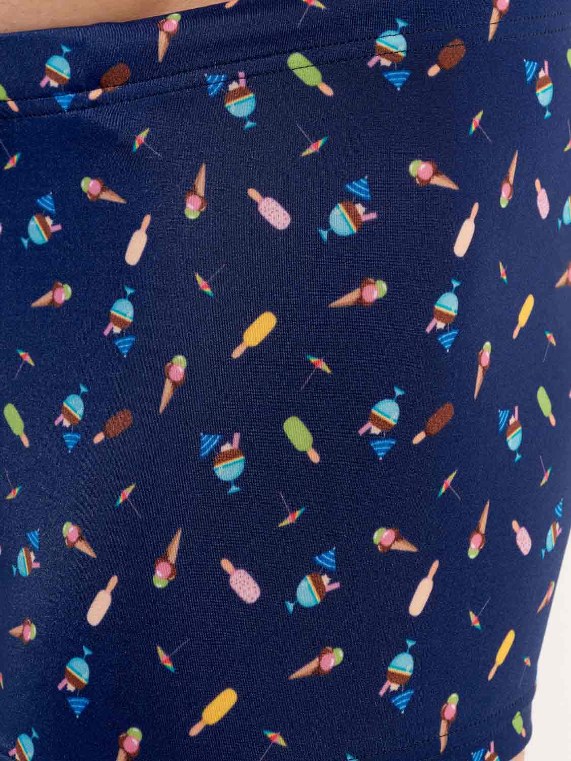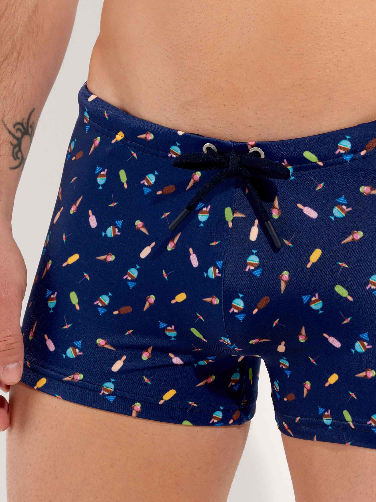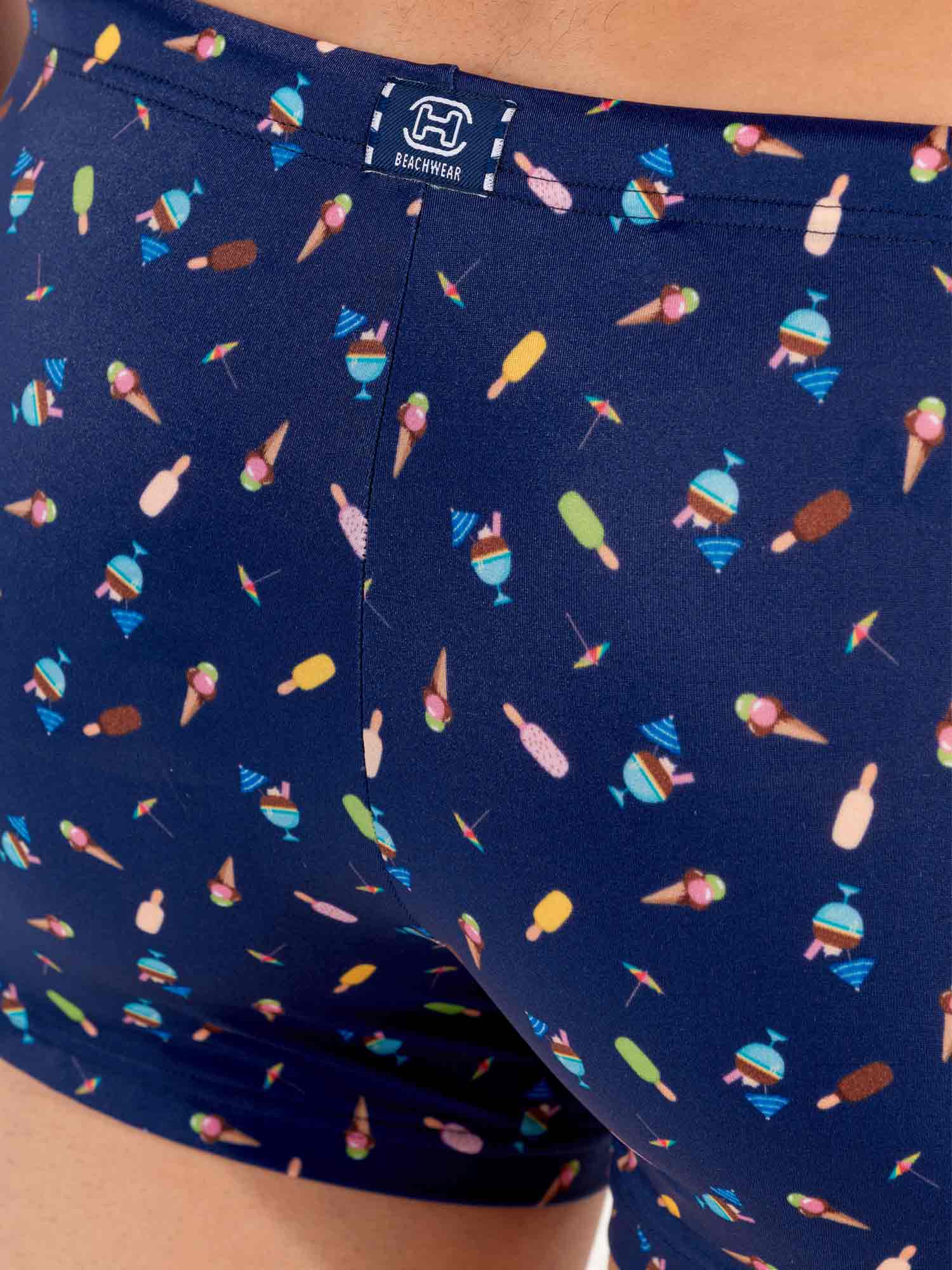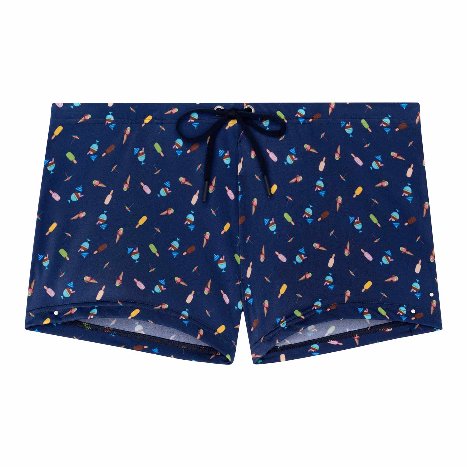Die Summer - Swim Shorts sind Teil der HOM Sommer-Badekollektion. Der Print zeigt bunte Eissorten auf dunkelblauem Hintergrund und erinnert an die Süße und Leichtigkeit von Sommerurlauben. Der Stoff ist elastisch, liegt angenehm auf der Haut und ist nicht durchsichtig. Der Kordelzug in der Taille ermöglicht es, die Shorts perfekt an die Größe anzupassen für einen sicheren Sitz. Mit diesem modischen Stück bringst du gute Laune an den Strand oder Pool.