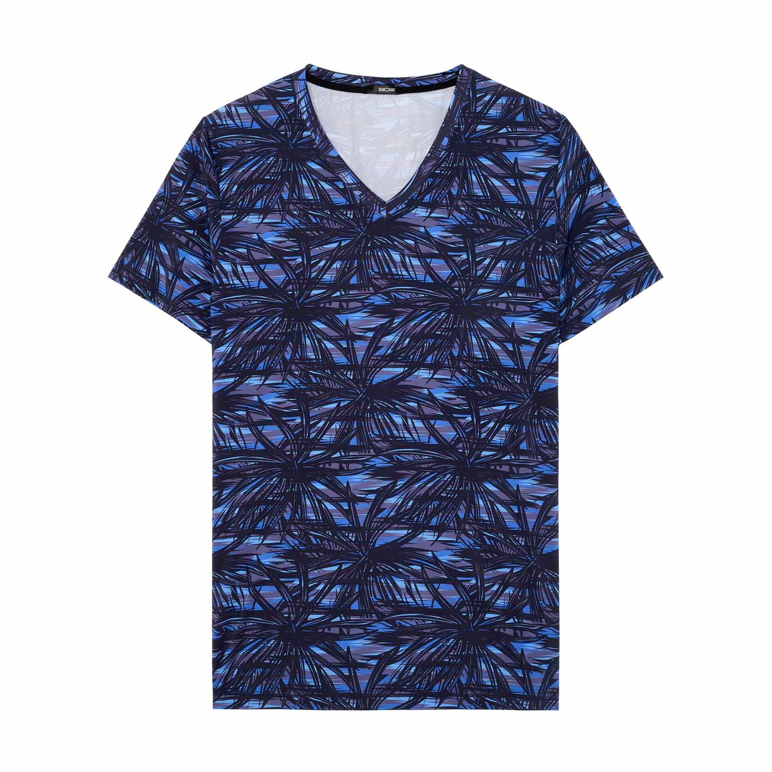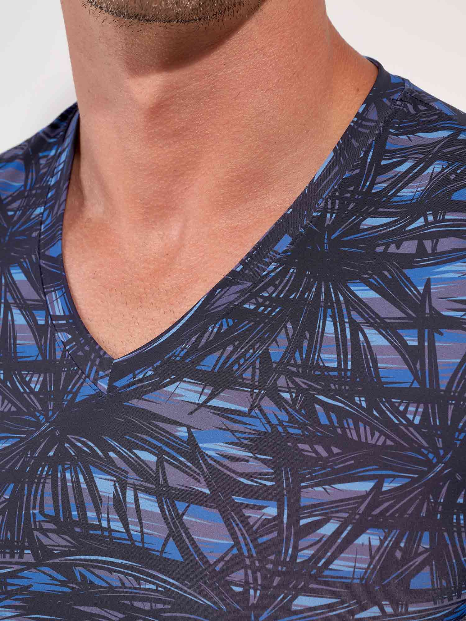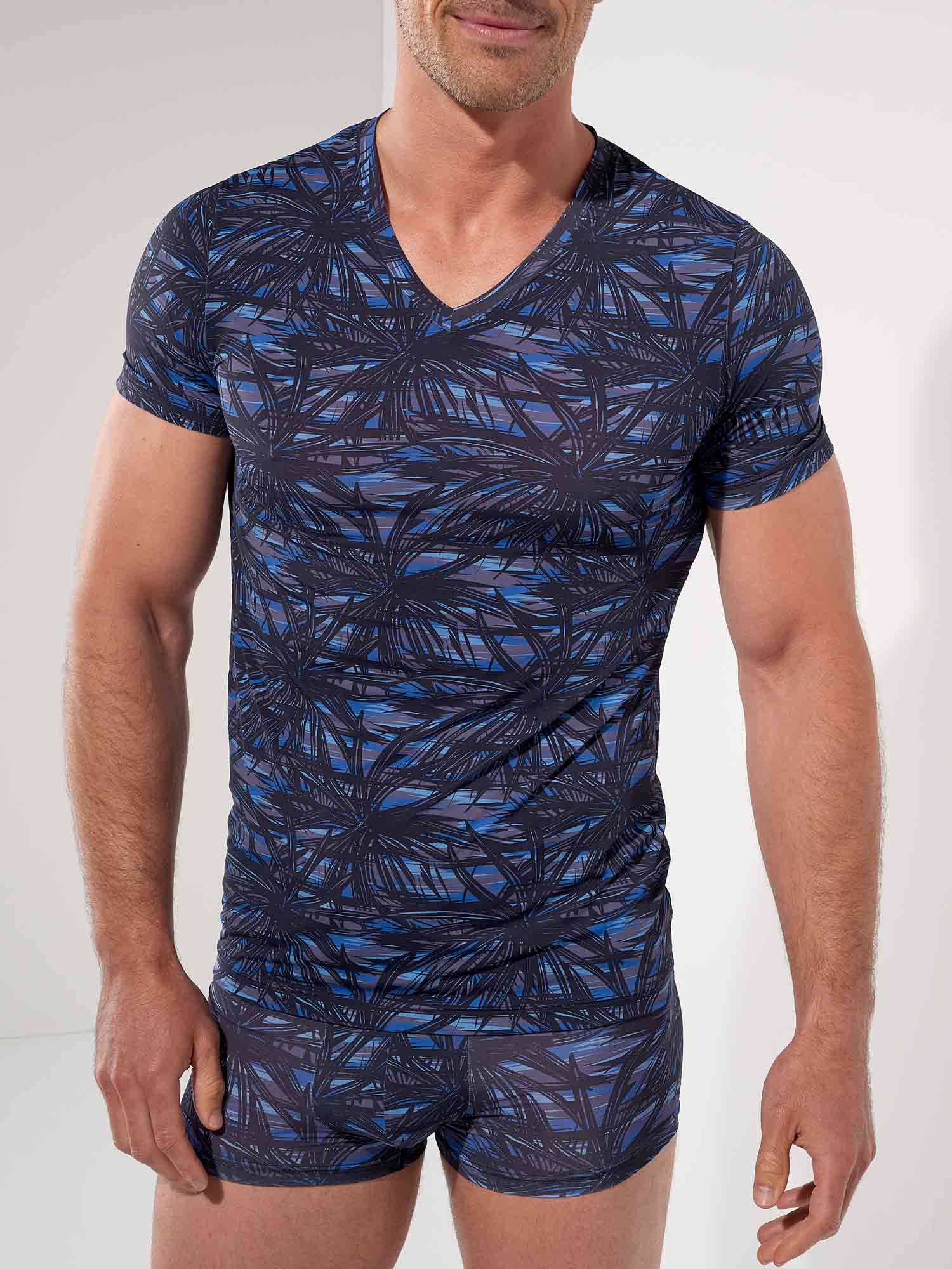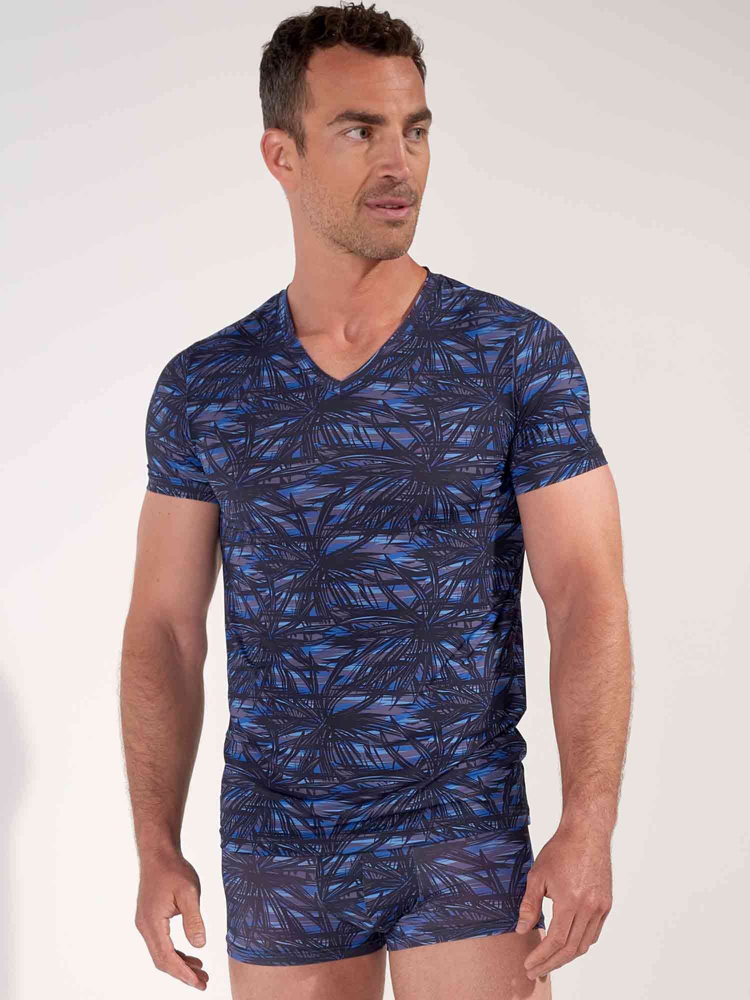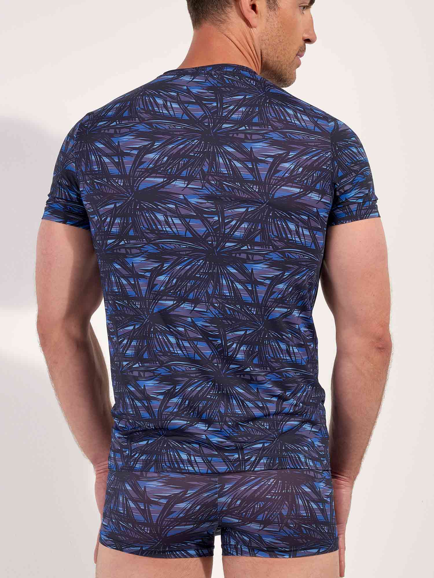 Das HOM Star Island V-Neck T-Shirt ist das raffinierte Gegenstück zum passenden Trunk, für Männer, die luxuriös abgestimmte Sets lieben. Die grafischen Palmenmotive, inspiriert vom Las Vegas Nightlife, wirken in tiefem Schwarz auf geschichteten Blautönen besonders stark, ausdrucksvoll und dennoch absolut classy. Die glatte Stretchqualität liegt körpernah an, ohne einzuengen, und sorgt für eine schlanke Silhouette, die jede Bewegung mitmacht. Solo getragen ein stilvolles Statement, zusammen mit dem Star Island Trunk entsteht ein perfekt abgestimmter Temptation Look.