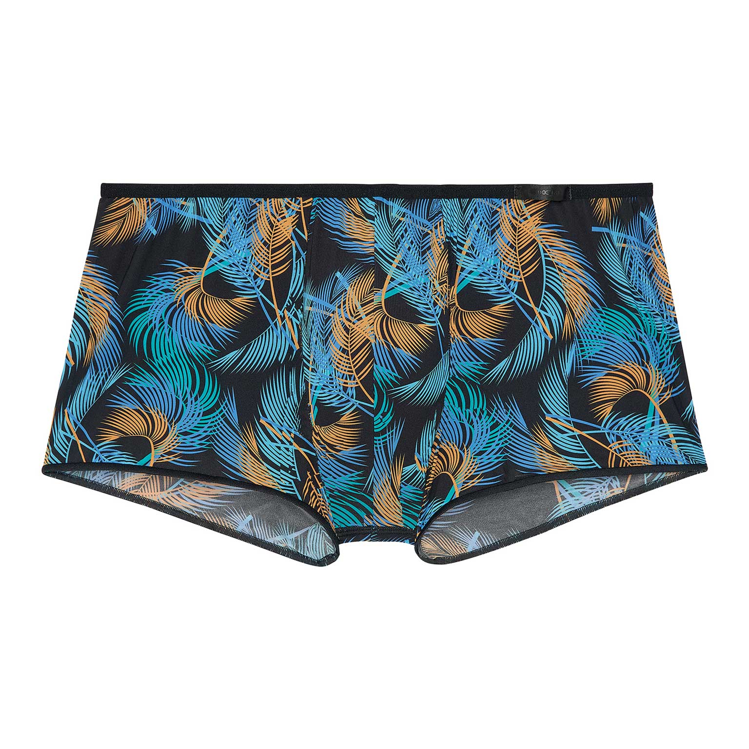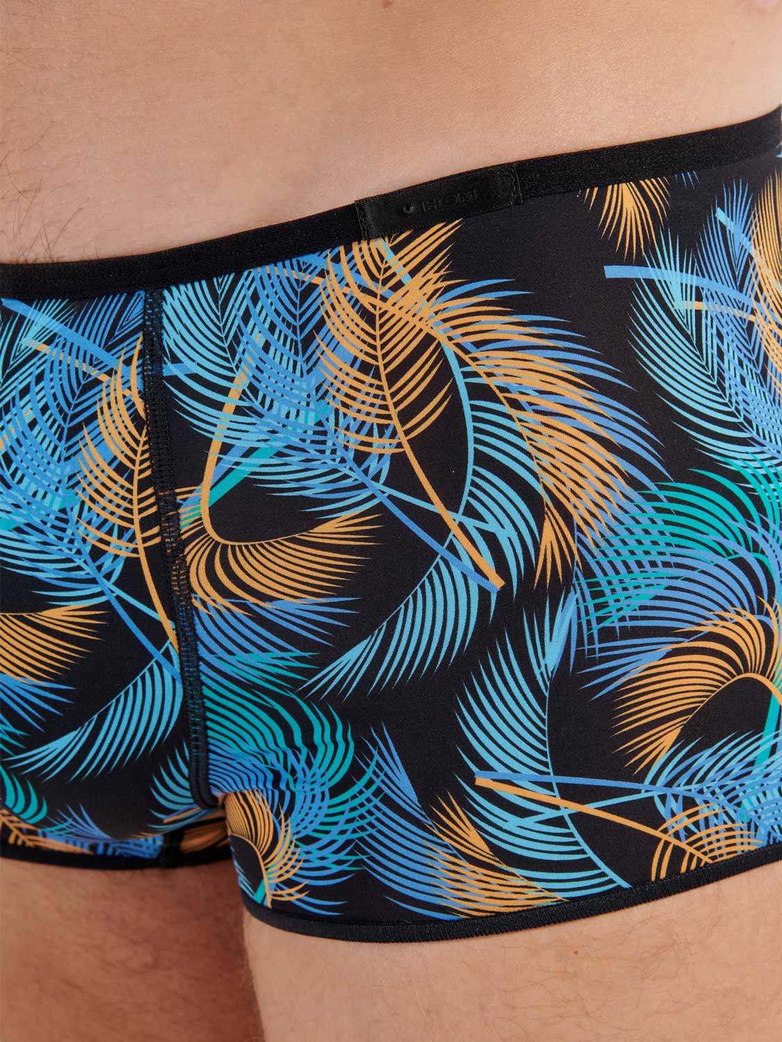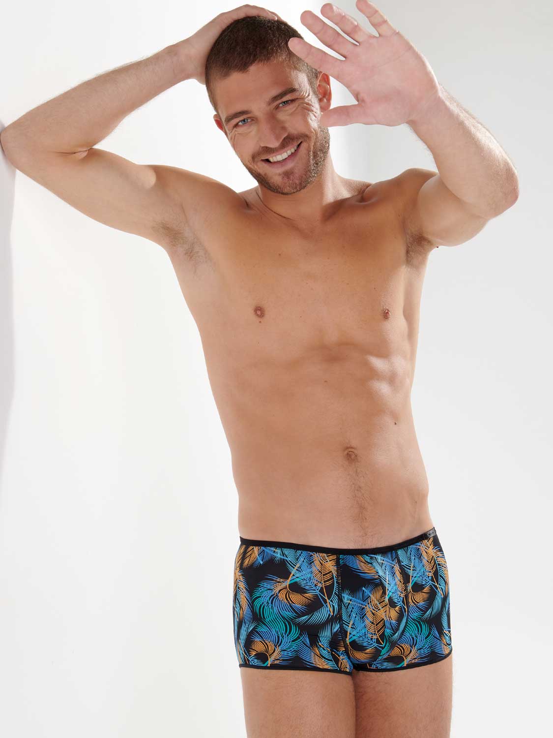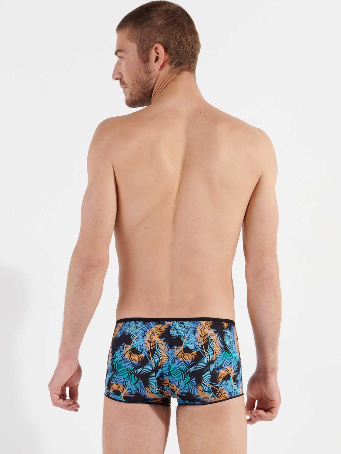 Die Chico - Trunk ist eine sinnliche Ergänzung der HOM Kollektion. Diese kurzen Boxershorts sitzen tief auf den Hüften. Der Stoff besteht aus einem dünnen, halbtransparenten Polyamid, das mit einem verspielten Aufdruck großer Federn in den Farben Blau und Orange auf schwarzem Grund versehen ist.