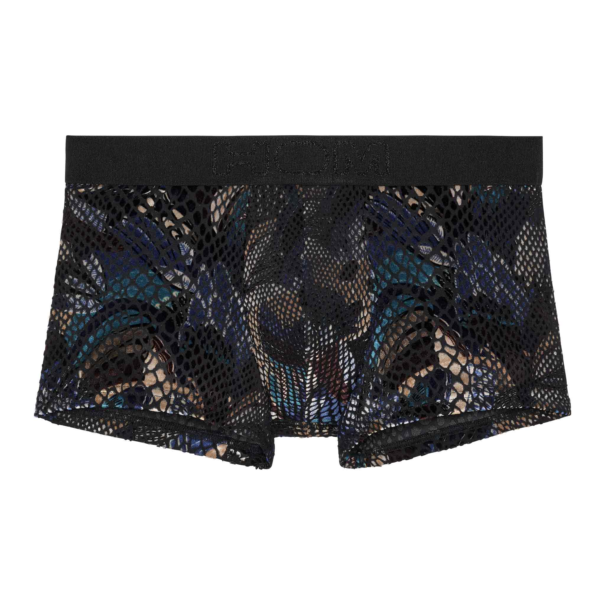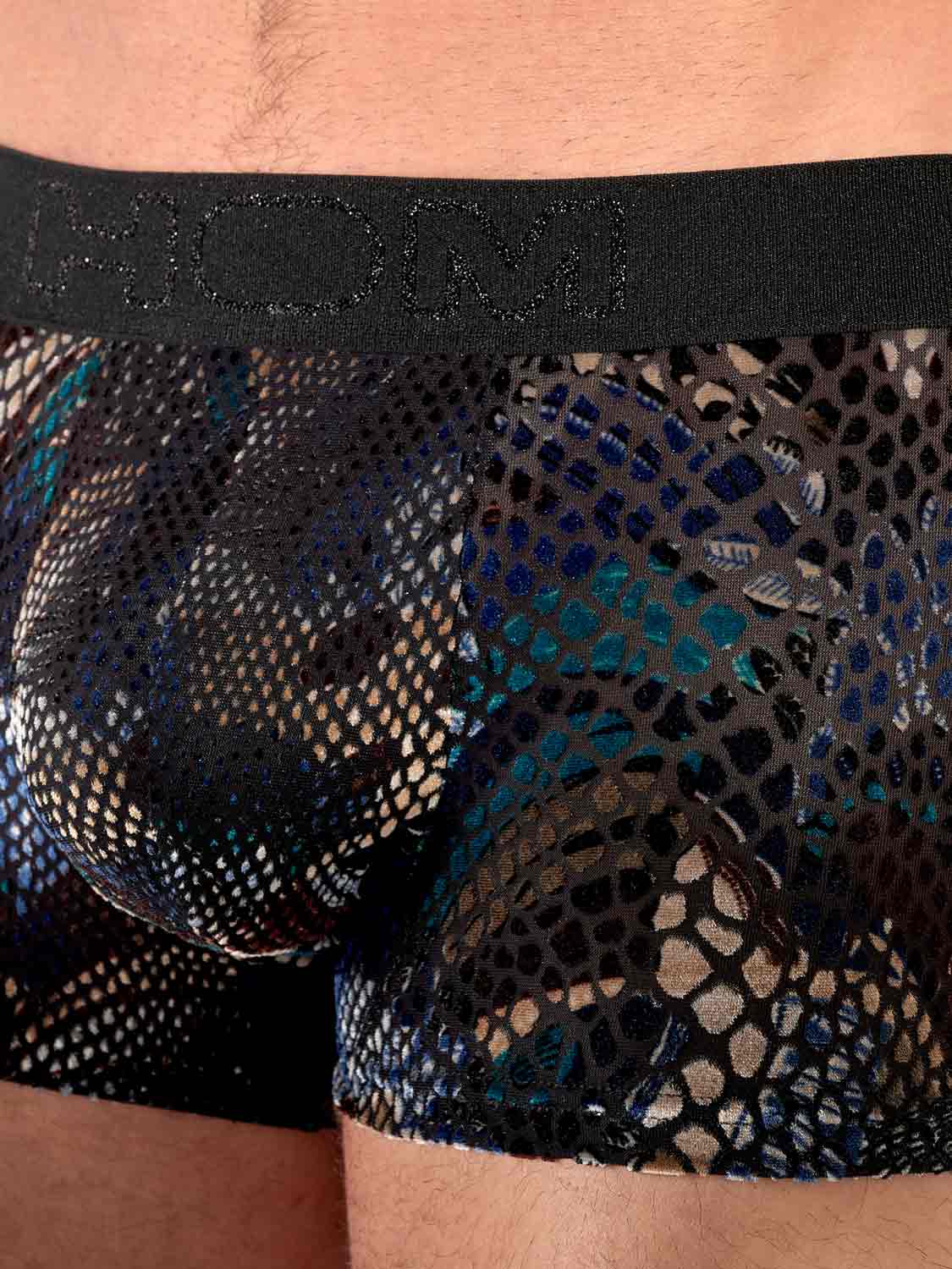 Der HOM Cobra Trunk ist ein extravaganter Hingucker aus devoré Mesh mit glänzendem Animal-Print. Die Flockveredelung verleiht dem Stoff eine sinnliche, samtige Textur, die sich weich an die Haut schmiegt. Dunkelblaue, bronzene und schwarze Nuancen erzeugen eine verführerische Ausstrahlung. Die Vorderseite ist gefüttert für zusätzlichen Tragekomfort. Für Männer, die gerne auffallen.