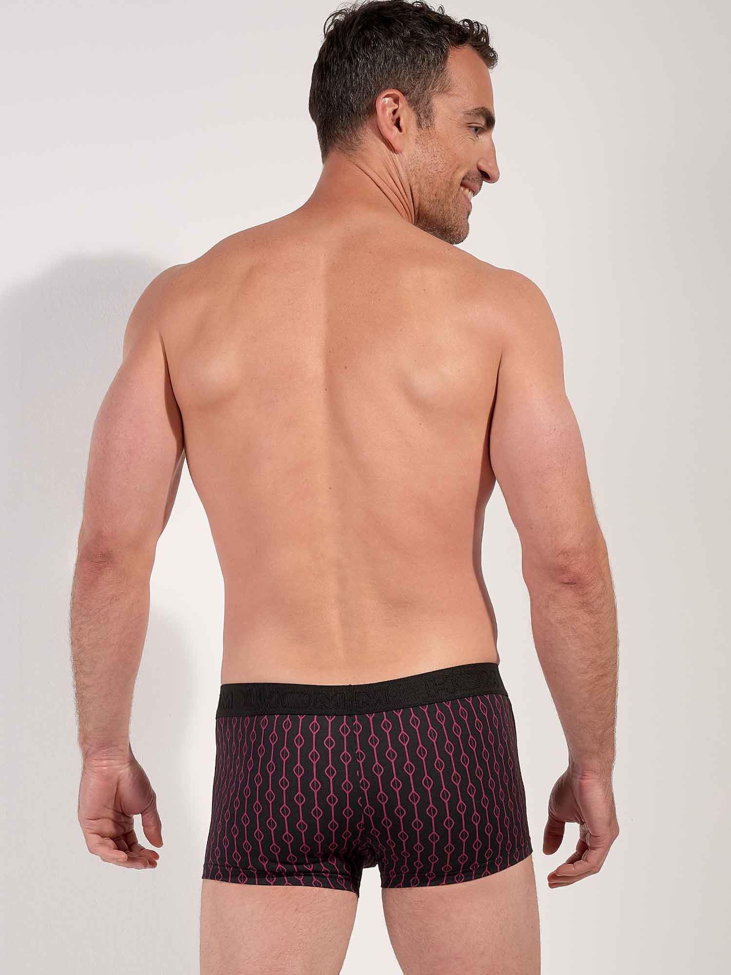 Die Dunes Trunk ist von der Retro Eleganz Las Vegas inspiriert und setzt auf ein raffiniertes geometrisches Design im Stil der 50er Jahre. Bordeauxfarbene Formen auf tiefschwarzem Grund erinnern an den zurückhaltenden Glamour des legendären Dunes Hotels. Der kurze Trunk Schnitt sitzt hoch am Oberschenkel für eine moderne Silhouette und maximale Bewegungsfreiheit. Ein weicher HOM Logo Bund und ein dezentes elastisches Panel am Beinabschluss sorgen dafür, dass alles den ganzen Tag sauber an Ort und Stelle bleibt.