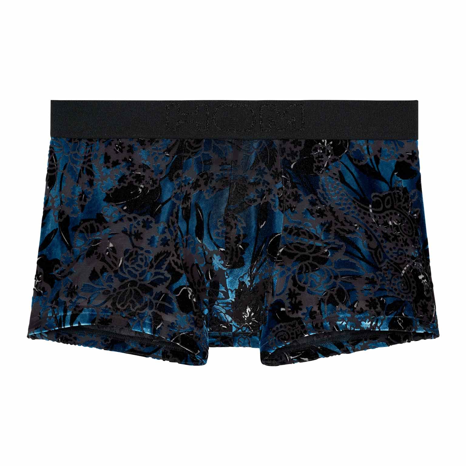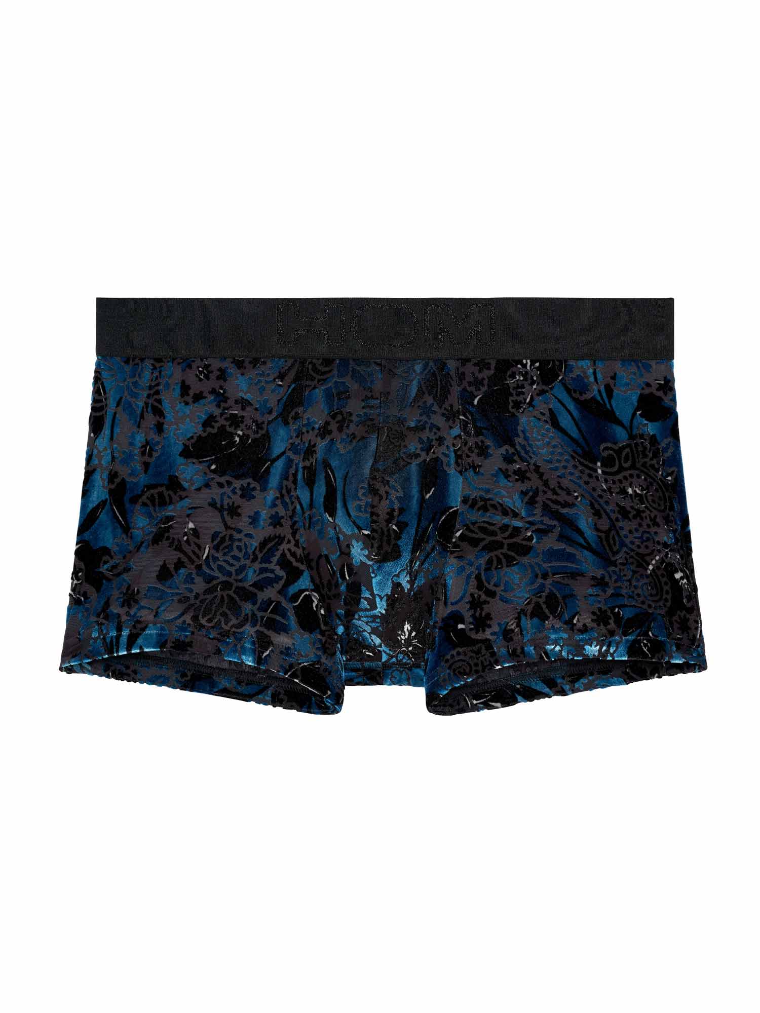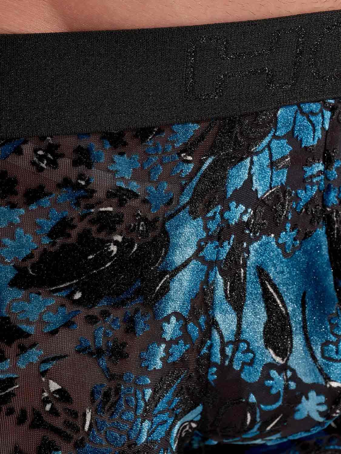 Der HOM Fremont Trunk ist pure Temptation, gefertigt aus Devoré-Samt, der sich seidig auf der Haut anfühlt und das Licht mit einem eleganten, barock inspirierten Muster einfängt. Die tiefschwarze Basis wird durch elektrisch blaue Akzente und einen sanften Schimmer veredelt, wie Las Vegas Neon, markant und zugleich kompromisslos stilvoll. Mit einem transparenten Beindetail und einem komfortablen Frontfutter sorgt dieser Trunk für eine selbstbewusste Silhouette mit luxuriösem Tragegefühl. Der weiche Bund wird durch ein zentriertes HOM-Logo in Lurex perfekt abgerundet.