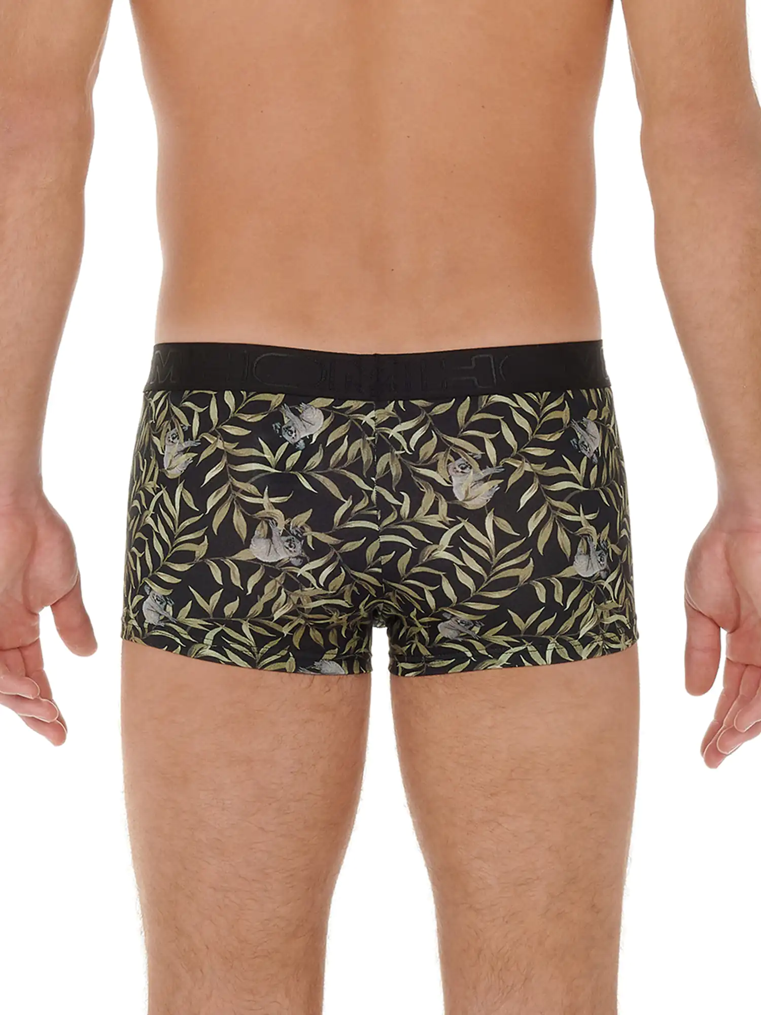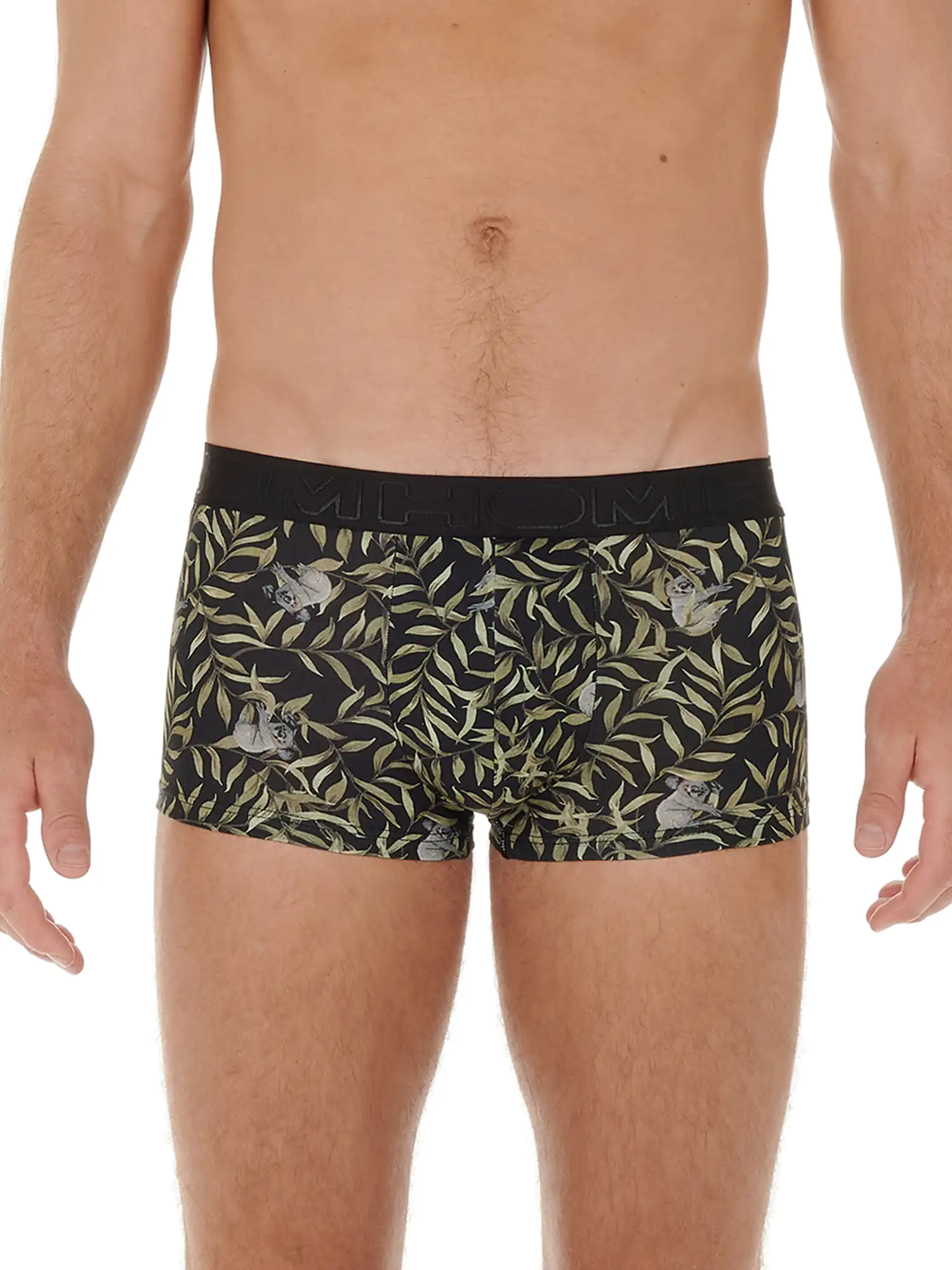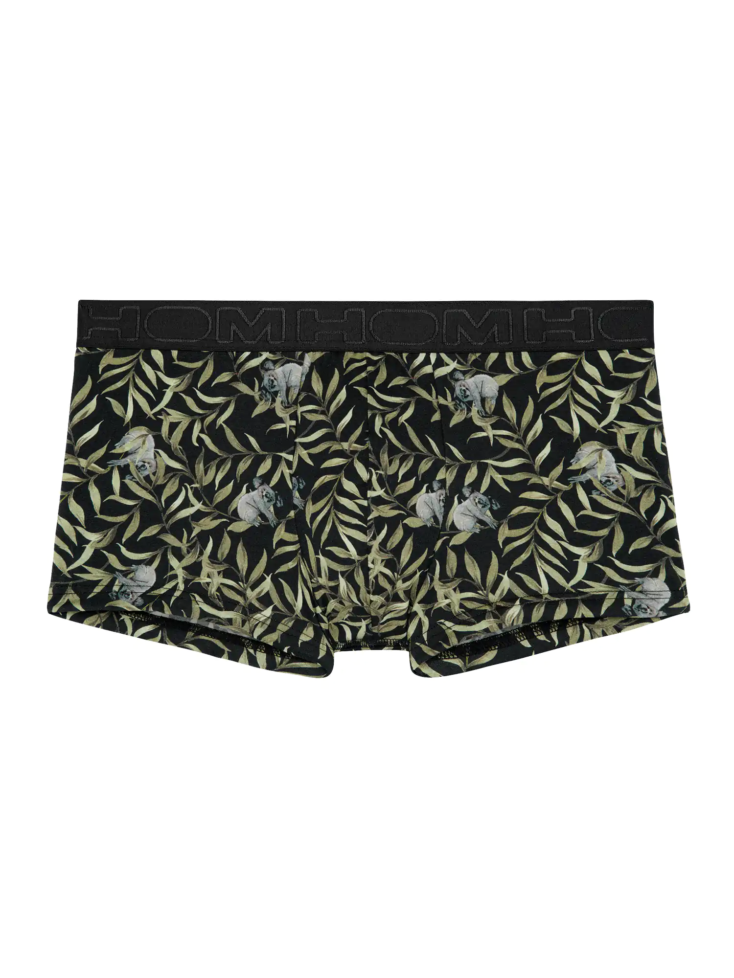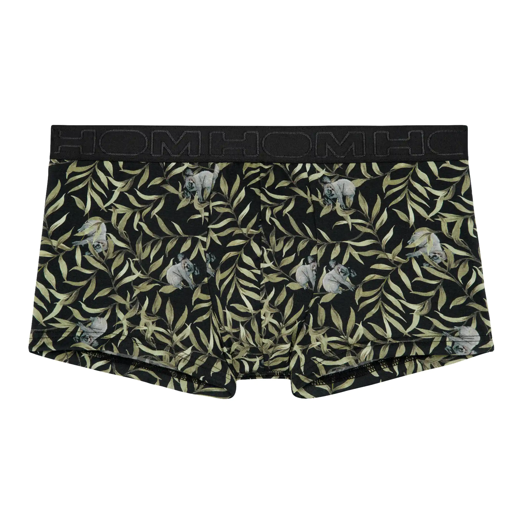 Der Ted Trunk ist aus einer bequemen Baumwoll-Modal-Mischung gefertigt und zeigt einen verspielten Tierdruck mit Koalas auf einem Blattmuster auf schwarzem Hintergrund. Das Baumwoll-Modal-Gemisch fühlt sich weich an und passt sich dem Körper gut an. Darüber hinaus hat Baumwolle-Modal gute saugfähige und atmungsaktive Eigenschaften, so dass die Wahrscheinlichkeit, dass Sie warme, klamme Stellen in Ihrer Unterwäsche bekommen, deutlich geringer ist. Da sowohl Baumwolle als auch Modal natürlichen Ursprungs sind, eignet sich der Ted für alle Männer, die gerne natürliche Stoffe tragen. Bei normalem Gebrauch schrumpft der Stoff nicht und ist abriebfest. Der Trunk ist ein modischer Boxerslip für Männer, der kürzer ist als normale Boxershorts. Der breite Bund ist schwarz mit dem HOM-Logo in Ton-sur-Ton.