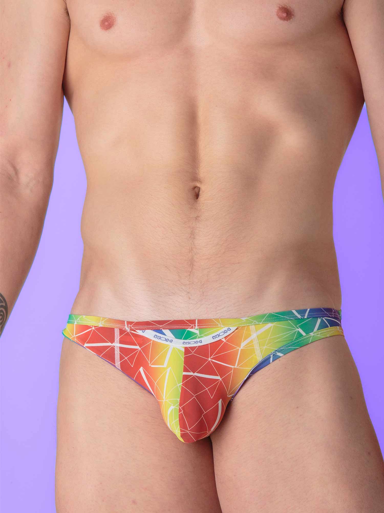 Die Sexy Fun Micro Briefs von WOH sind verspielt, farbenfroh und unglaublich bequem. Der weiche Polyamid-Elasthan-Stoff mit auffälligem Regenbogenmuster liegt angenehm auf der Haut, während der schmale Schnitt deine Männlichkeit perfekt betont. Der weiße Elastikbund mit rotem WOH-Logo sorgt für einen sportlich-fröhlichen Look. Ideal für alle, die es sexy, frech und farbenfroh mögen.