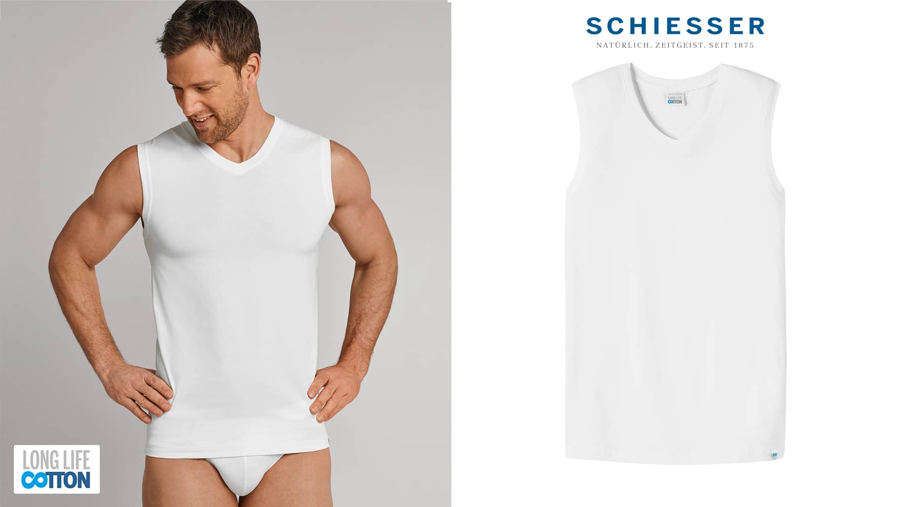 Tanktop von SCHIESSER aus der Long Life Cotton Serie, speziell für den Mann, der Baumwolle liebt hat SCHIESSER diese Serie entwickelt. Durch einen neuen Veredlungsprozeß fühlt sich die Baumwolle nicht nur besonders gut an auf der Haut sondern ist auch fusselarm und hält wesentlich länger als herkömmliche Baumwolle. Deshalb sieht dein Tanktop länger aus wie neu, sogar nach vielen Wäschen ! Mit diesem Tanktop von SCHIESSER kaufst du dir ein Shirt in bester SCHIESSER-Qualität.