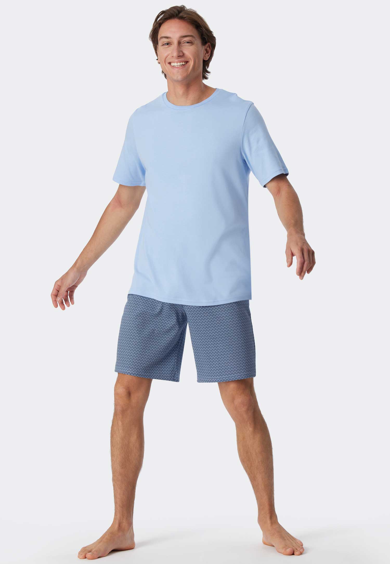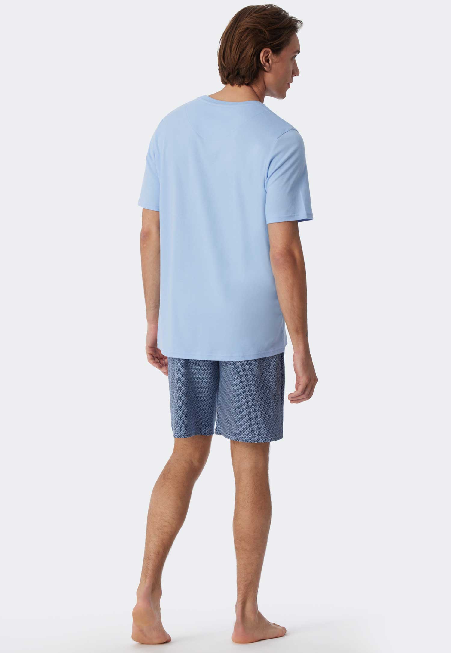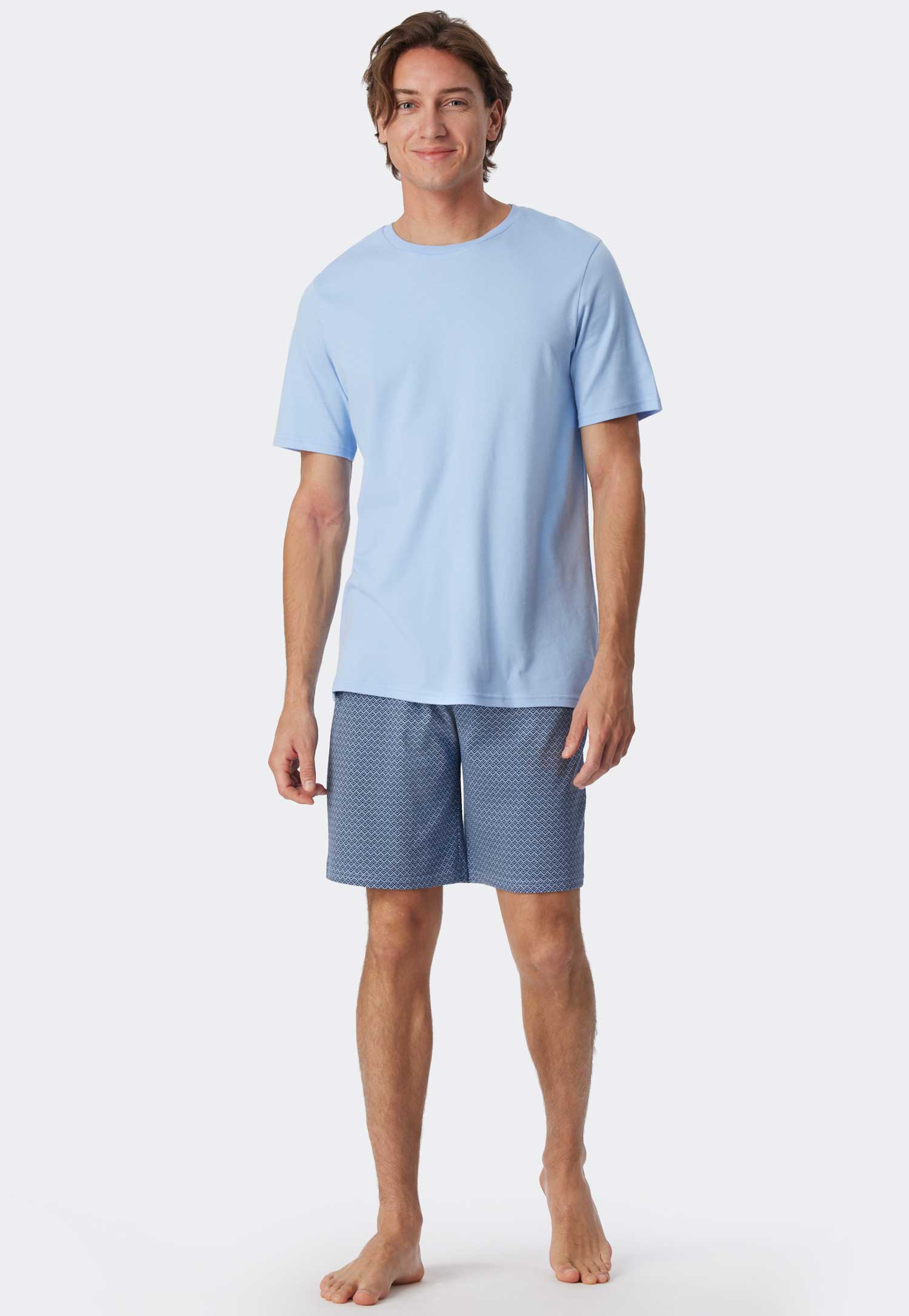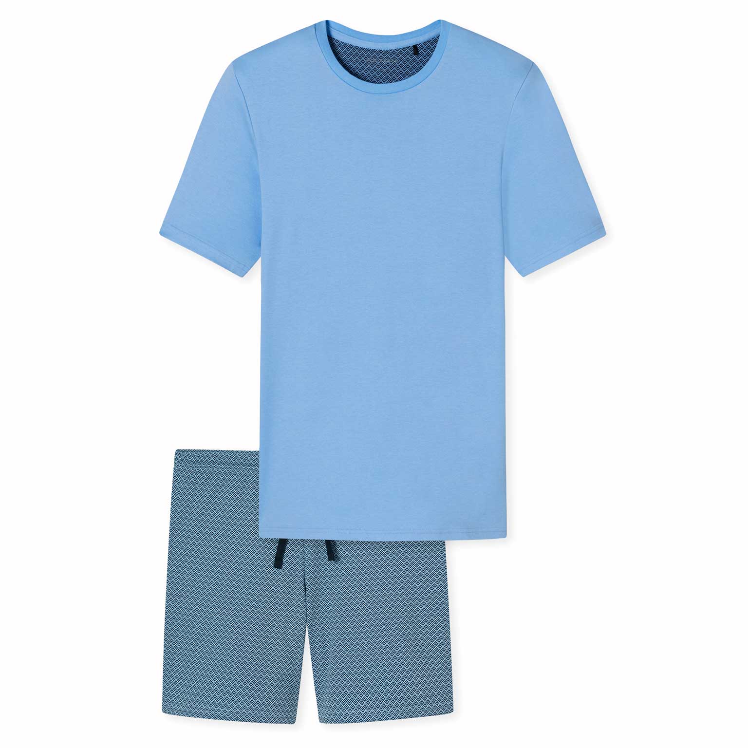 Kurzer Herrenschlafanzug von Schiesser aus 100% Baumwolle mit einfarbigem Hemd und Shorts mit auffälligem Muster. Der Schlafanzug hat einen Rundhalsausschnitt und eine kurze Hose mit Kordelzug in der Taille für einen verstärkten Sitz. Hergestellt aus einer Interlock-Qualität mit lässigem Look und Gefühl.