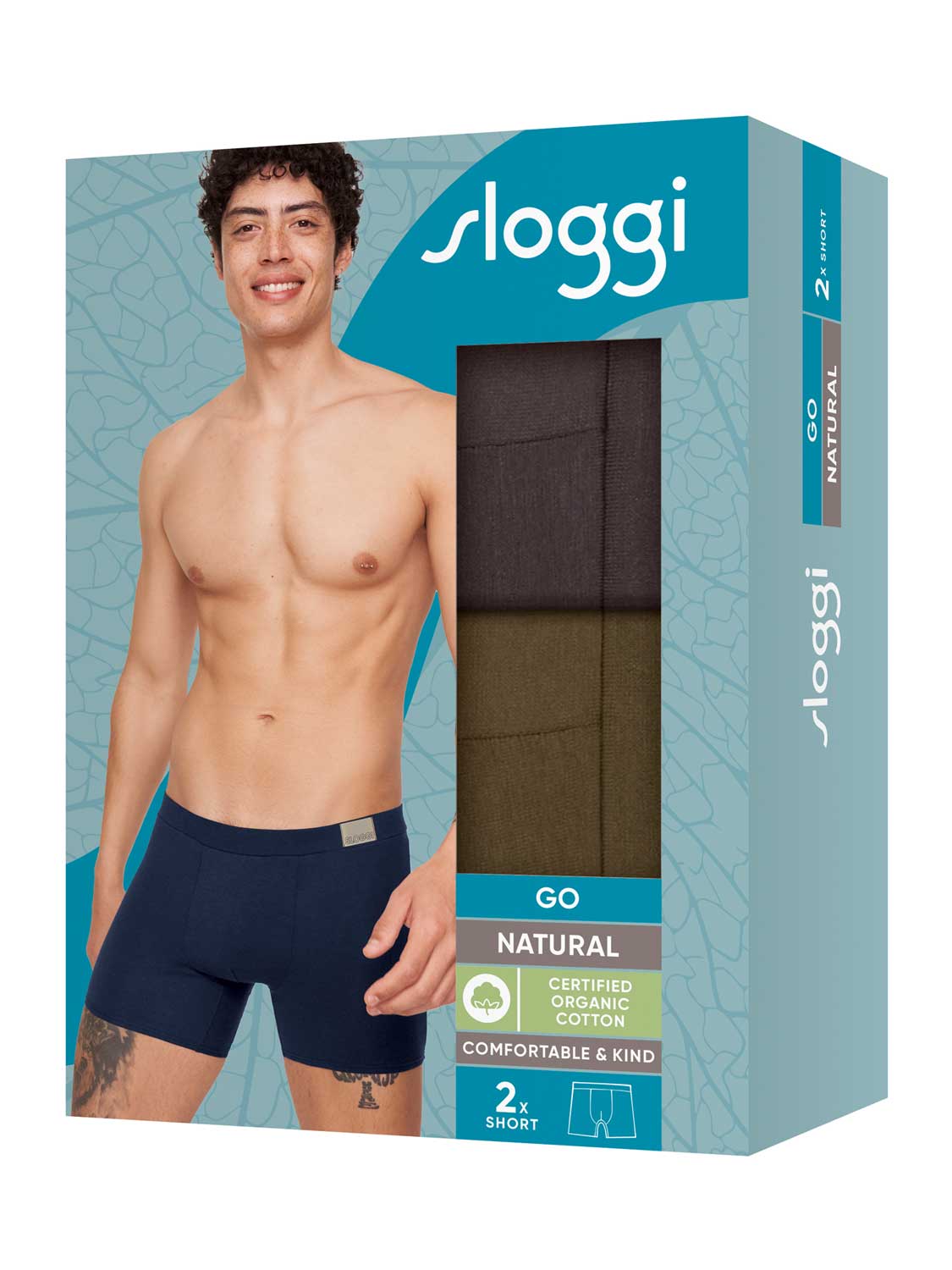 Mit der Go Natural Serie von Sloggi tragen Sie Bio-Baumwolle, die ohne den Einsatz von Pestiziden angebaut wurde. Die Go Natural ist aus einer komfortablen 95/5 - Stretch-Baumwolle hergestellt, so dass sich die Unterwäsche perfekt an Ihren Körper anpasst. Die Go Natural kommt im 2er-Pack mit zwei unifarbenen Herren-Boxershorts, die mit einem elastischen, unifarbenen Bund ausgestattet sind, auf dem vorne links ein kleines Sloggi-Label eingestickt ist.