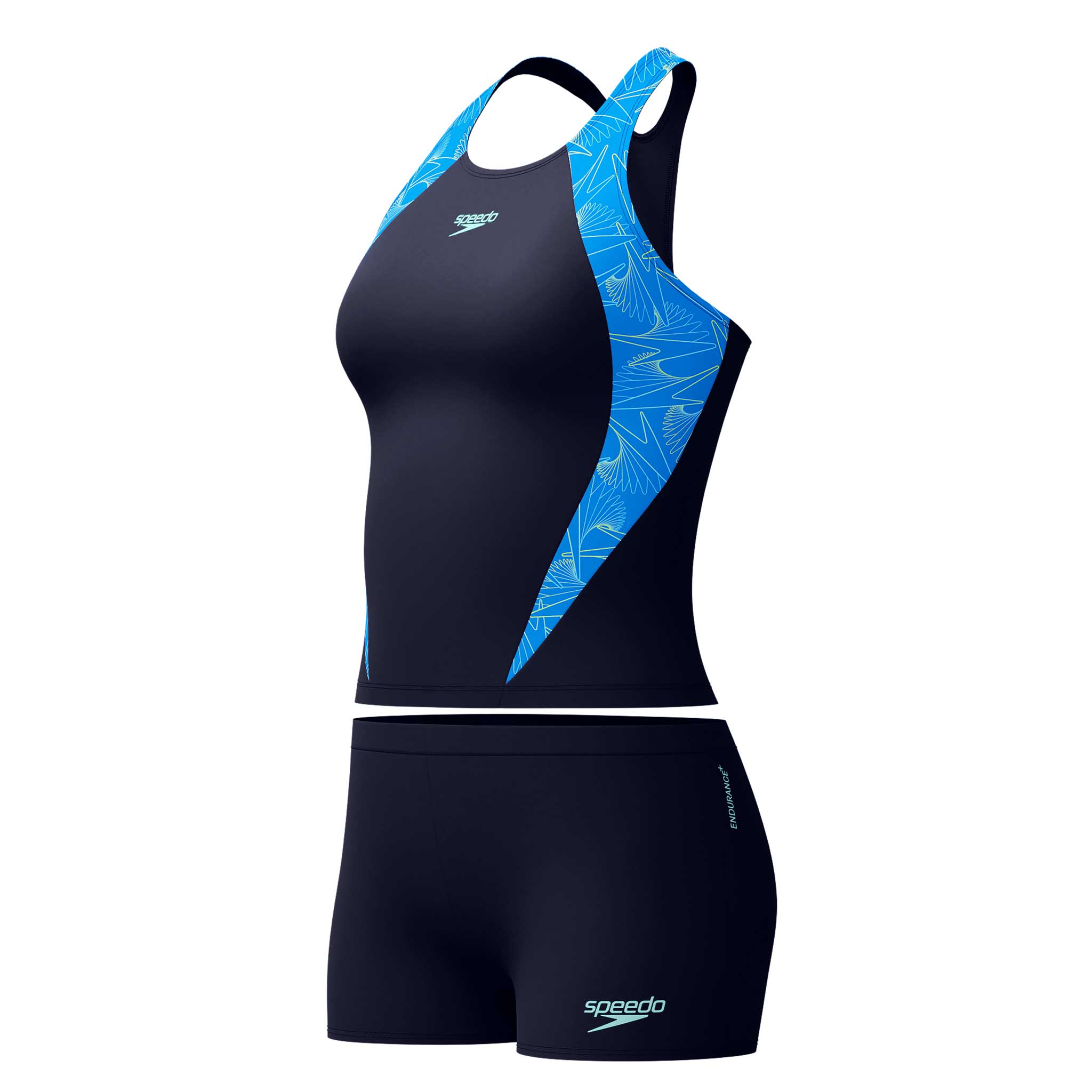 Setze ein Statement mit diesem wunderschönen Tankini von Speedo. Der Tankini verfügt über einen Speedo Hyperboom-Print in Türkis mit Blau. Der Tankini ist ideal für Sportarten wie Aqua-Jogging oder Wassergymnastik. Die Schultern bleiben frei, und das Oberteil bietet weichen Halt für die Brust, was zusätzlichen Komfort bei Bewegungen im Wasser bietet. Die Shorts bieten mehr Abdeckung als ein regulärer Badeanzug und haben eine Kordelzug an der Innenseite für einen sicheren Sitz. Der Tankini besteht aus Endurance+-Material, das chlorbeständig und langlebiger als normales Badeanzuggewebe ist.