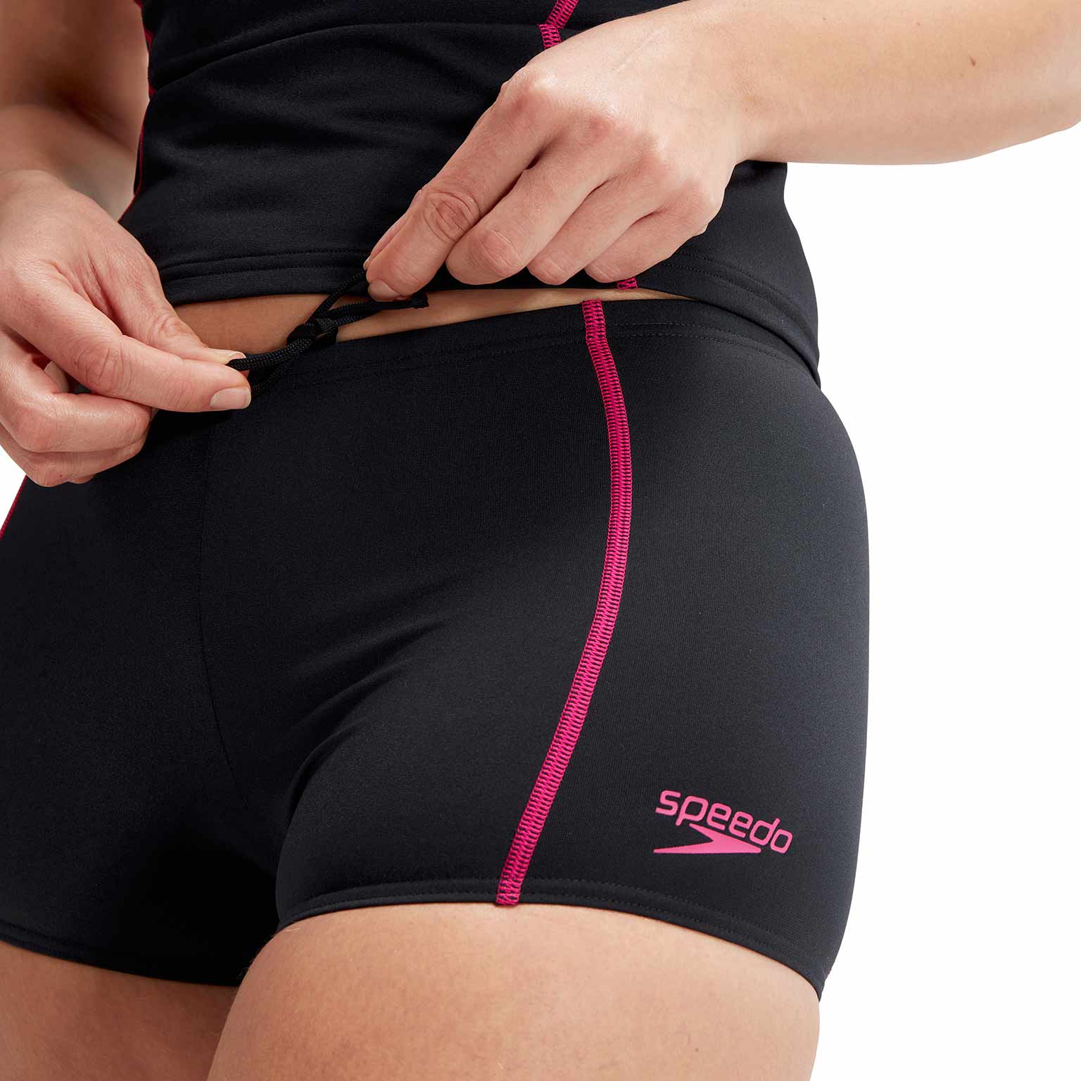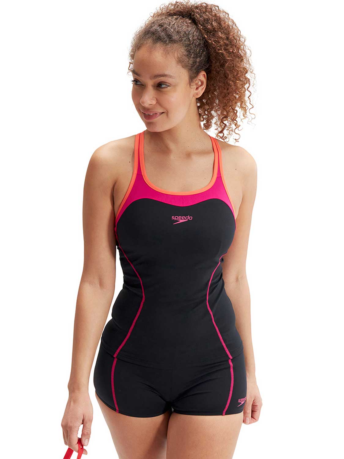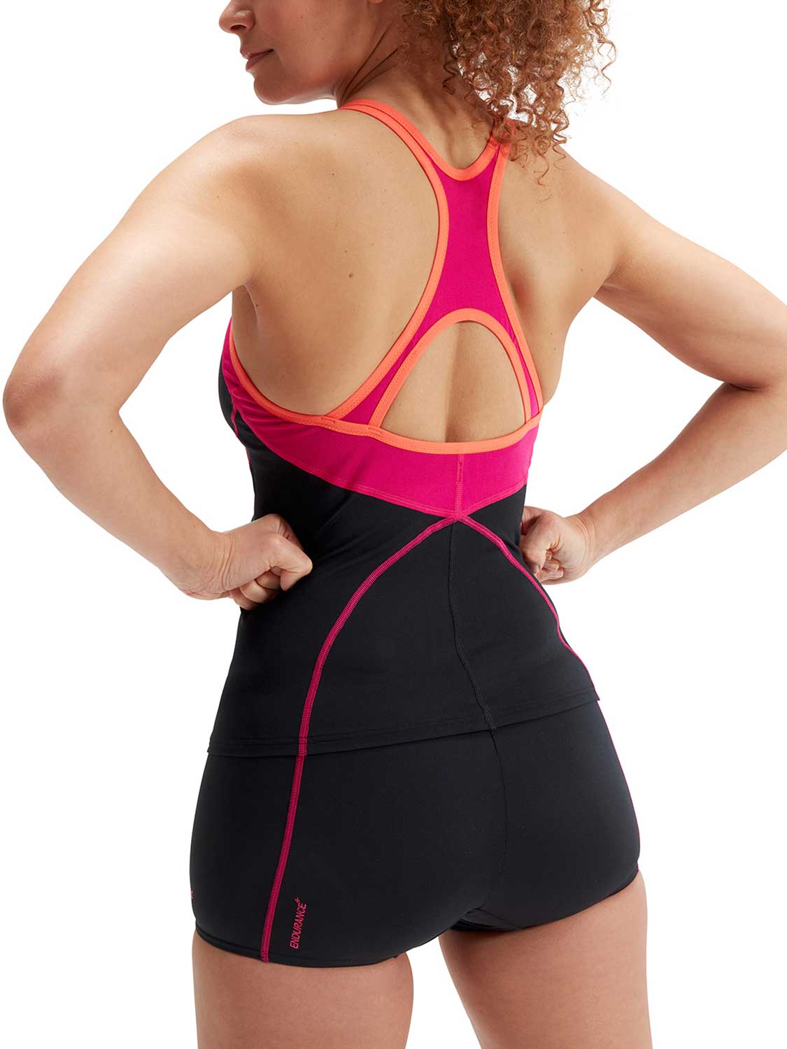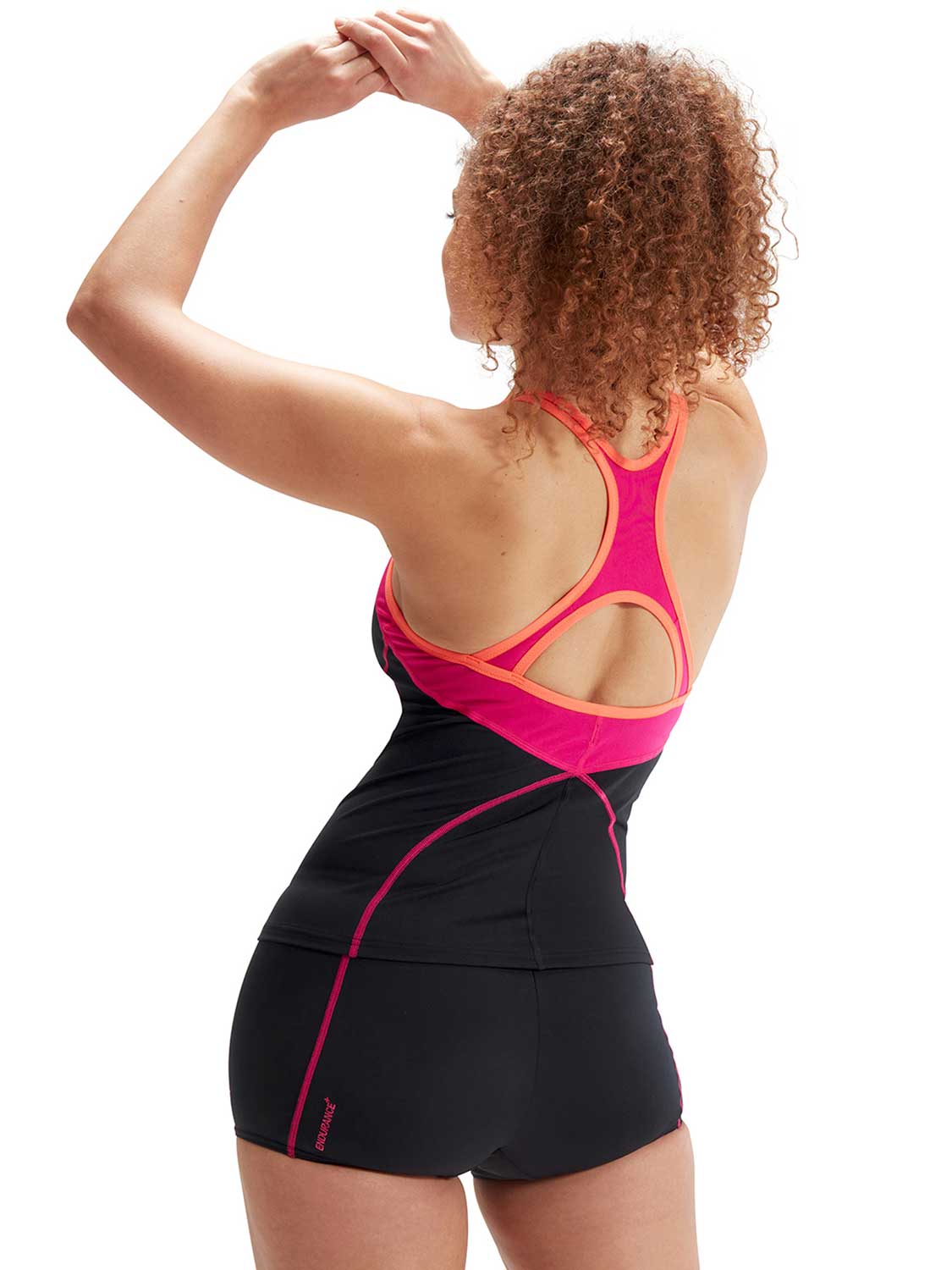 Dieses Tankini-Set von Speedo besteht aus kurzen Shorts mit Kordelzug und einem Oberteil mit offenem Rücken und freien Trägern, so dass Sie sich frei bewegen können. Darüber hinaus hat das Oberteil eine leichte Bruststütze für zusätzlichen Halt während des Workouts. Dieser Tankini wurde im Hinblick auf Nachhaltigkeit und Umweltfreundlichkeit entwickelt und besteht aus dem Material ECO Endurance +, das zu 100 % chlorbeständig und schnell trocknend ist und zu 100 % aus recycelten Materialien hergestellt wird.