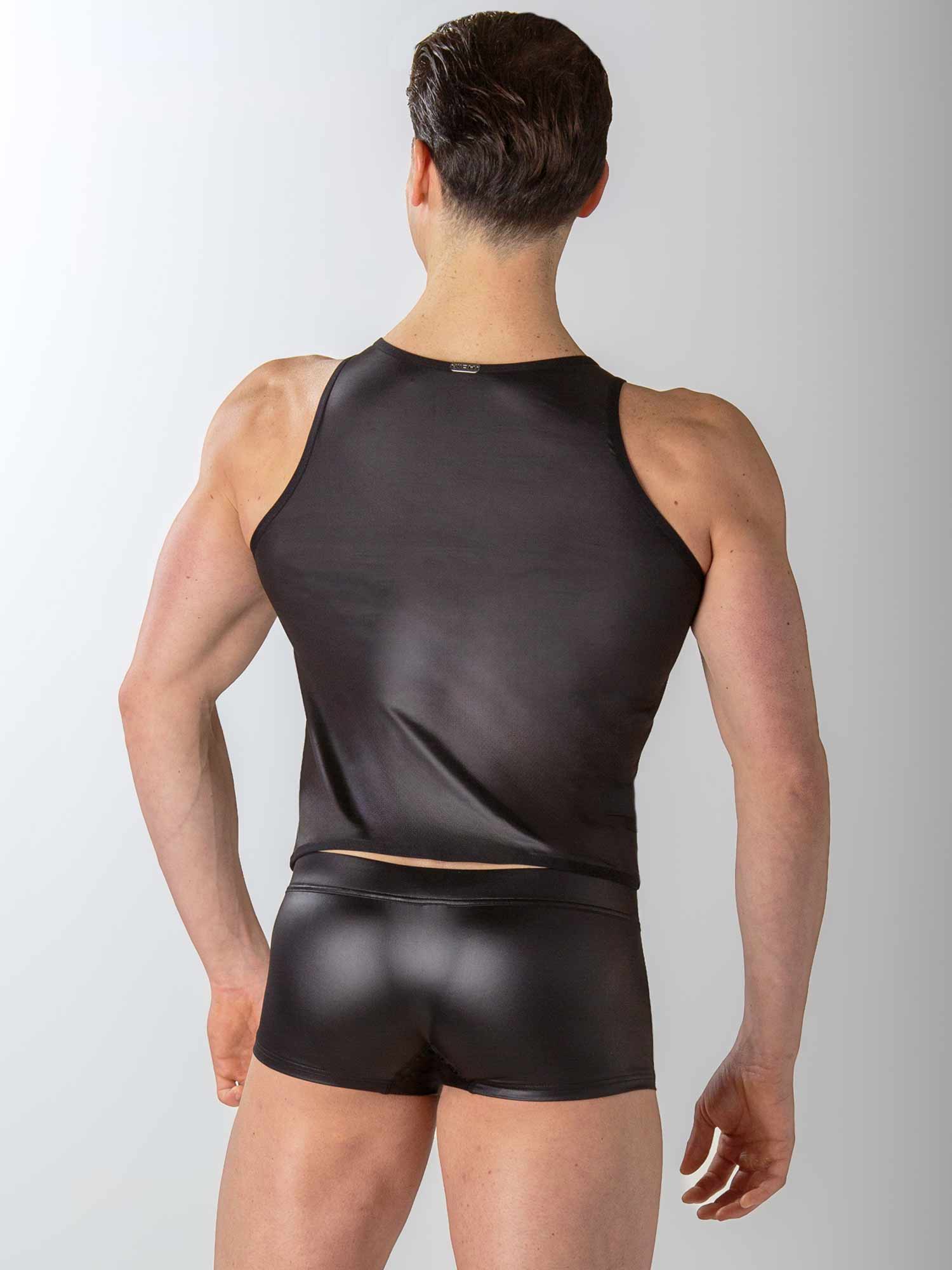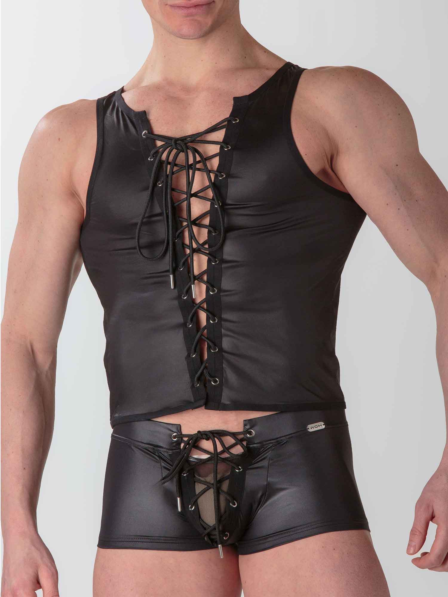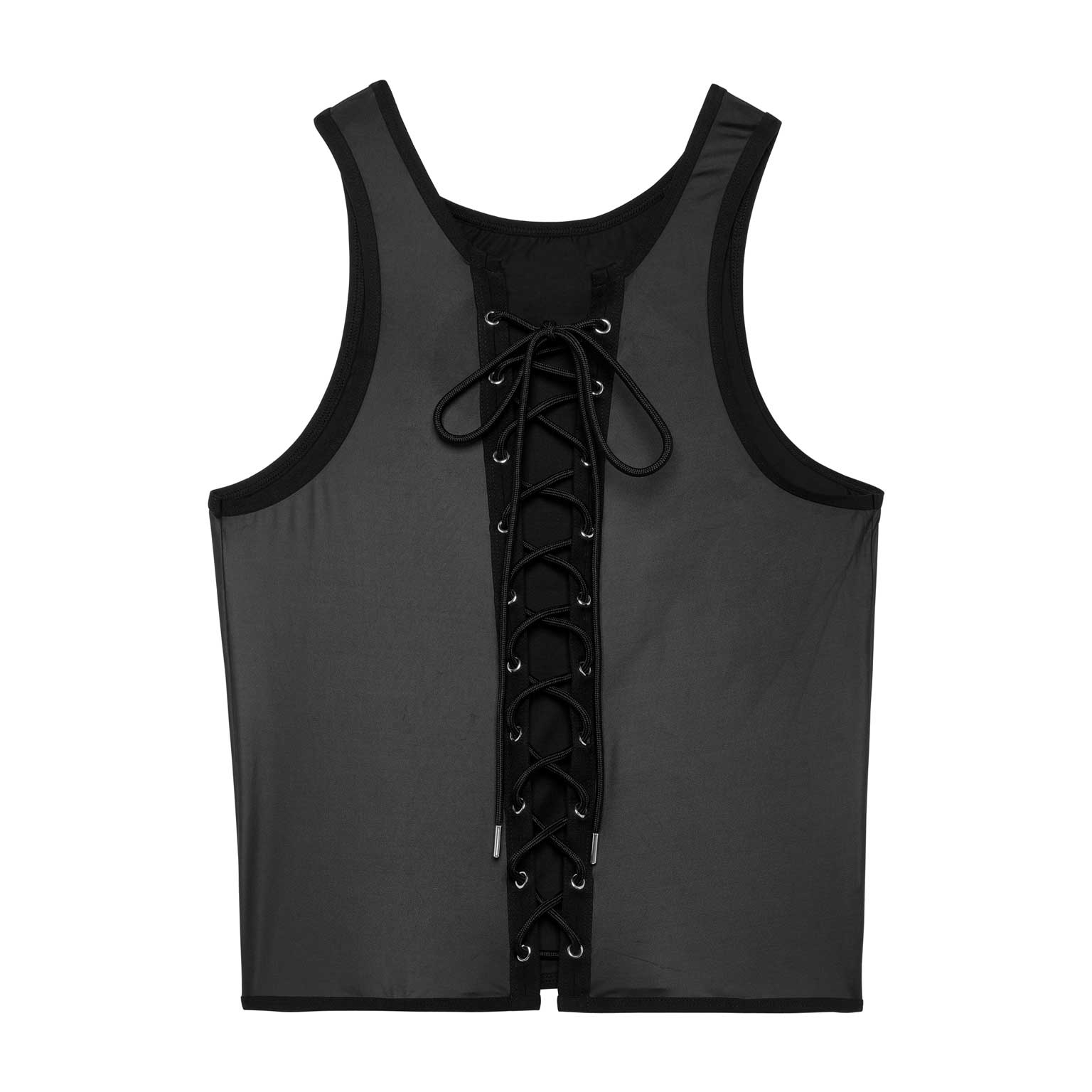Das Night Universe Tanktop von WOH ist das ultimative Kleidungsstück für einen dominanten, verführerischen Look. Aus schwarzem Vinylstoff mit Lederoptik und tiefem Schnürverschluss vorne gefertigt, strahlt dieses Top pure Erotik aus. Der Rücken besteht aus transparentem Mesh, das deine Rückseite betont. Perfekt für eine Clubnacht oder einen intimen Moment, in dem du auffallen willst.